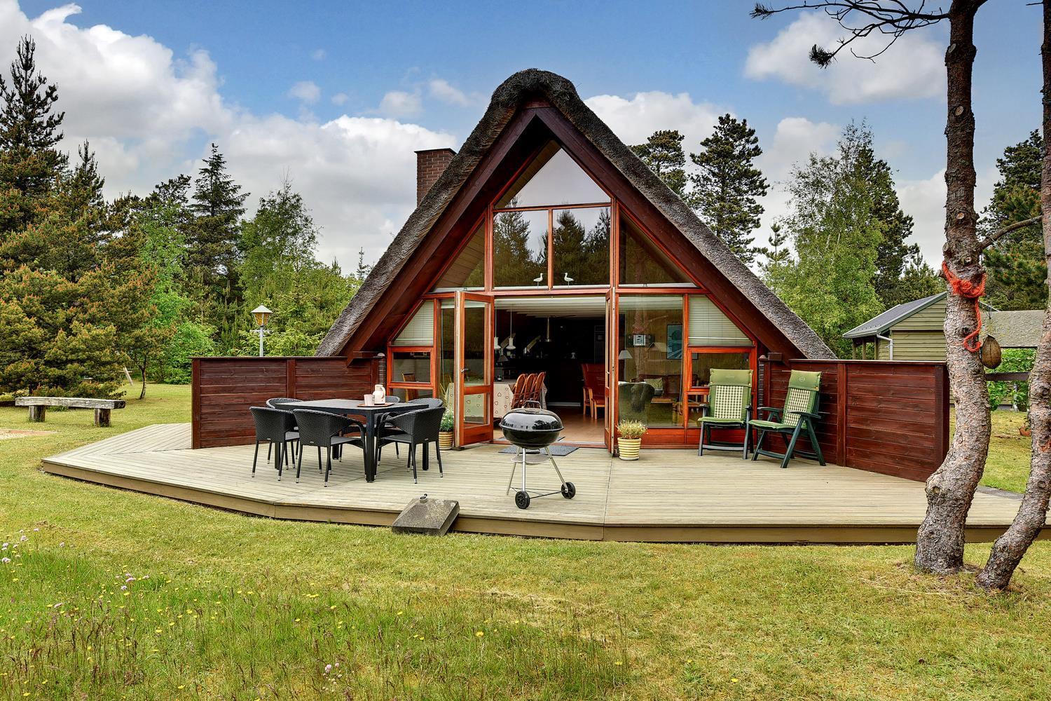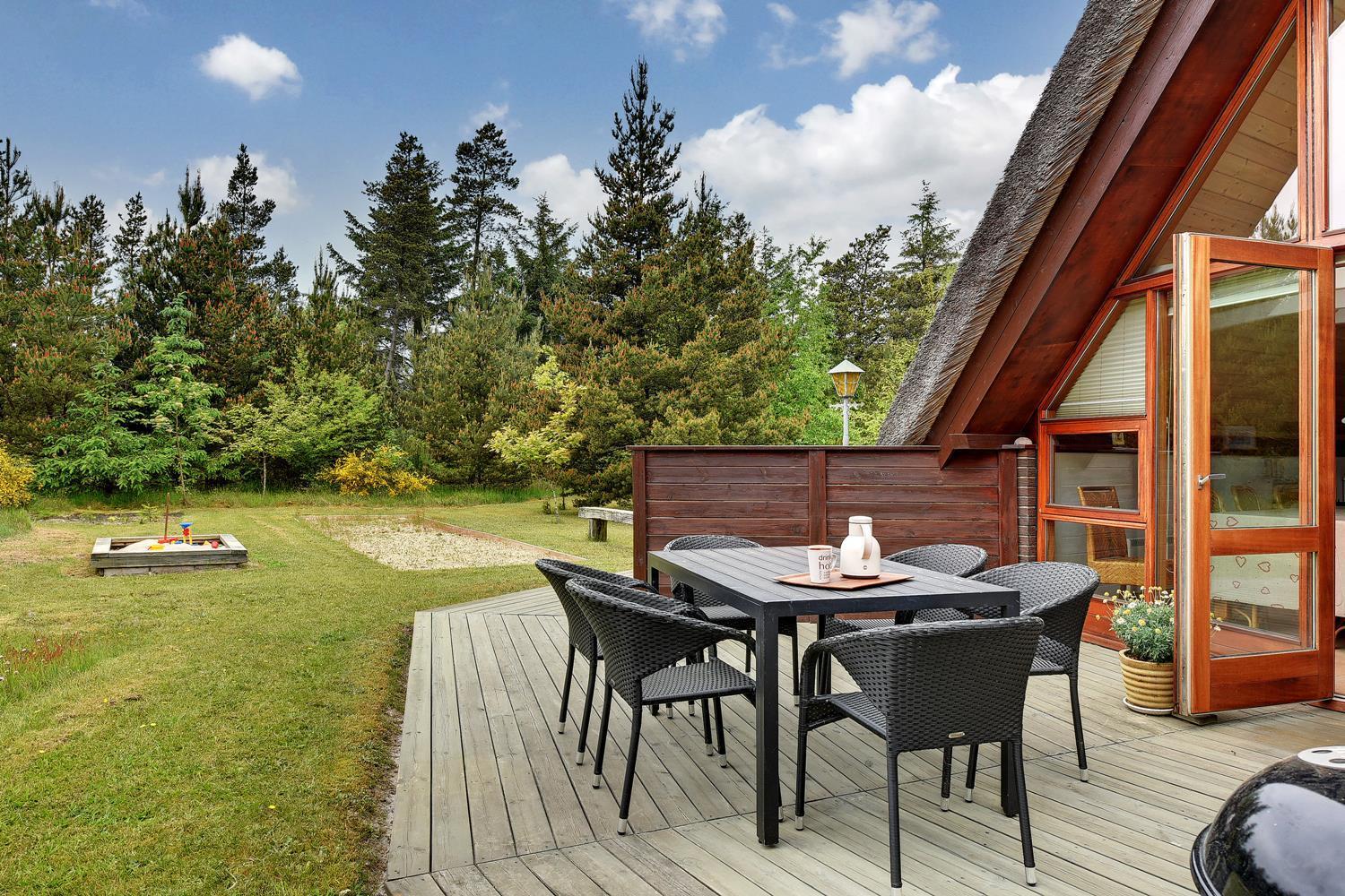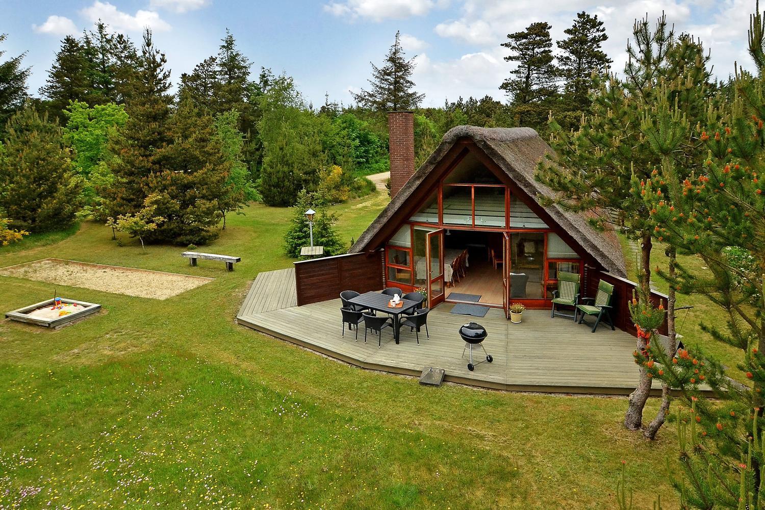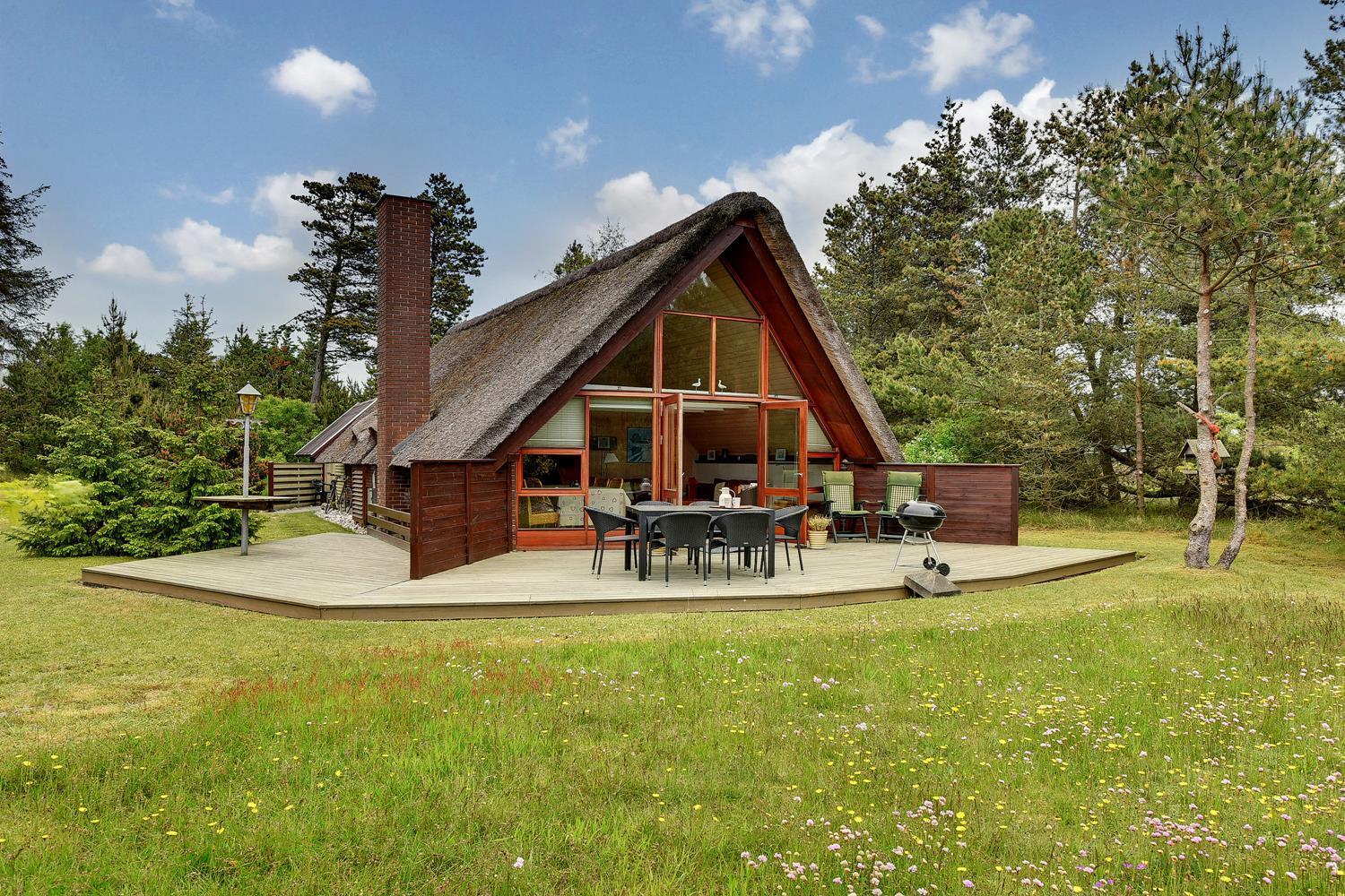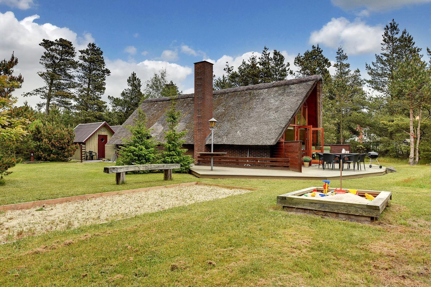 Charmerende stråtækt feriehus i Henne Strand med skøn terrasse og børnevenlig have.