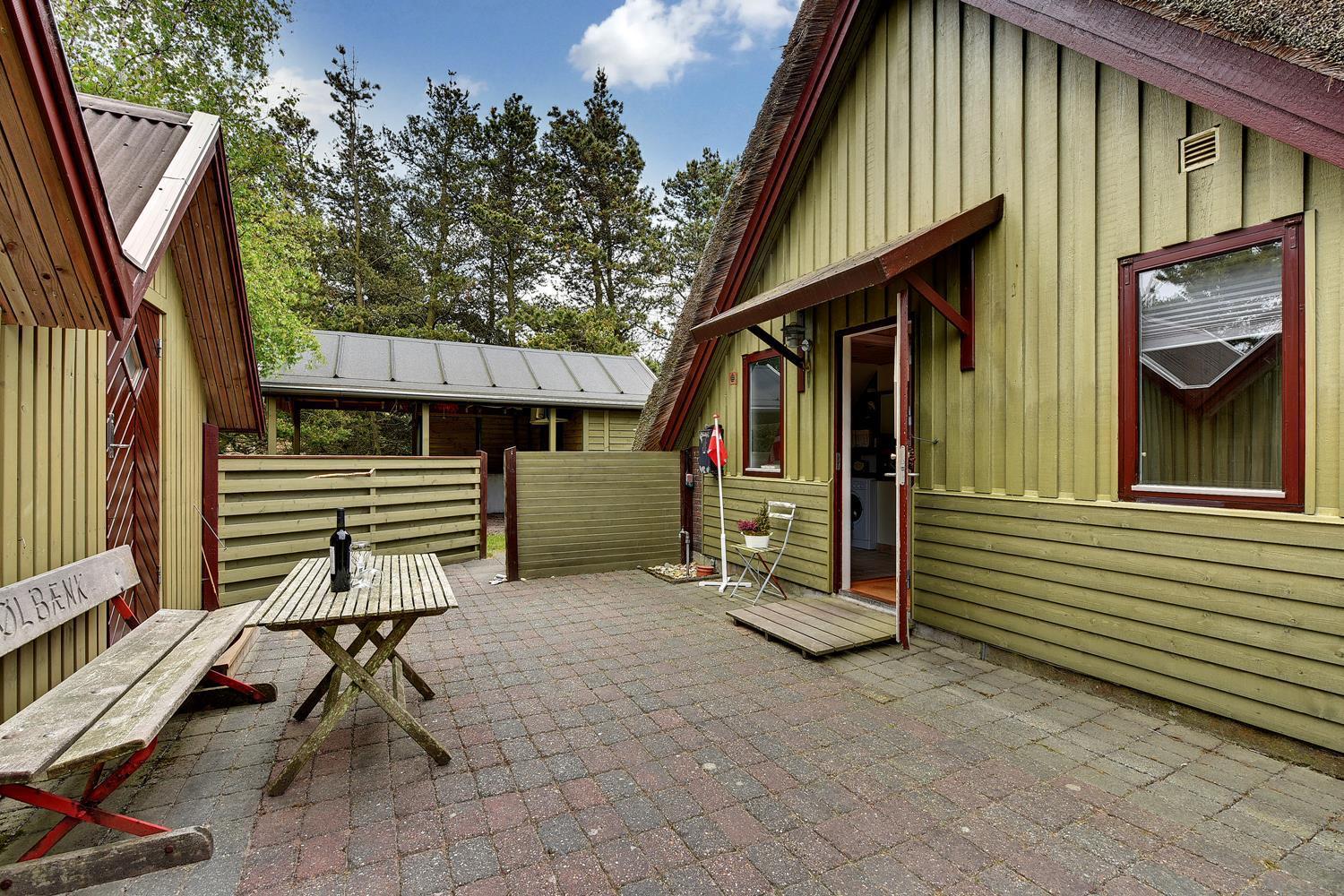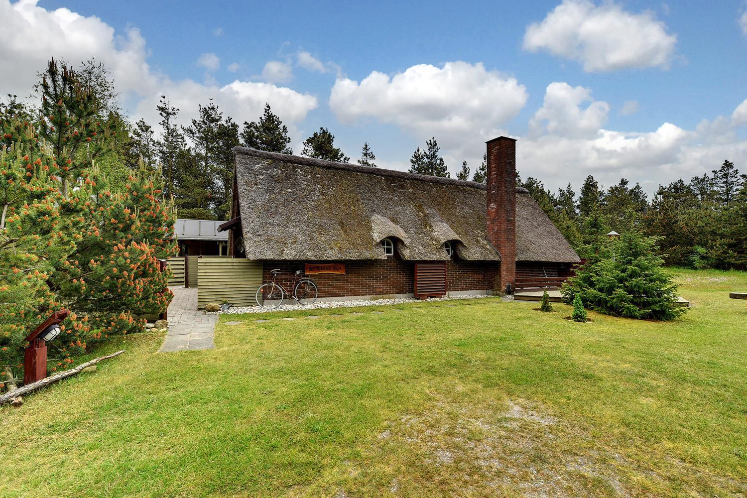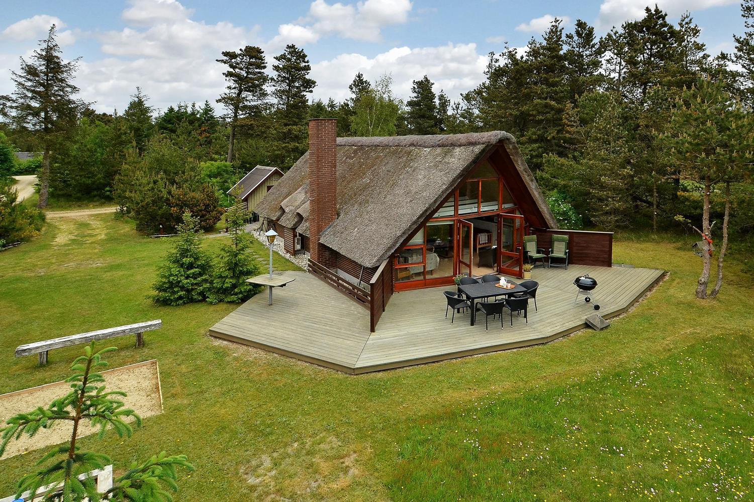 Dette dejlige stråtækte feriehus er beliggende på en børnevenlig og ugeneret grund med træer og buske. Flot badeværelse. Husets køkken er i åben forbindelse med den hyggelige stue, som er indrette med flotte og gode møbler. Der er både lukket 'gårdhave' og skøn træterrasse. 2 senge i Anneks.
