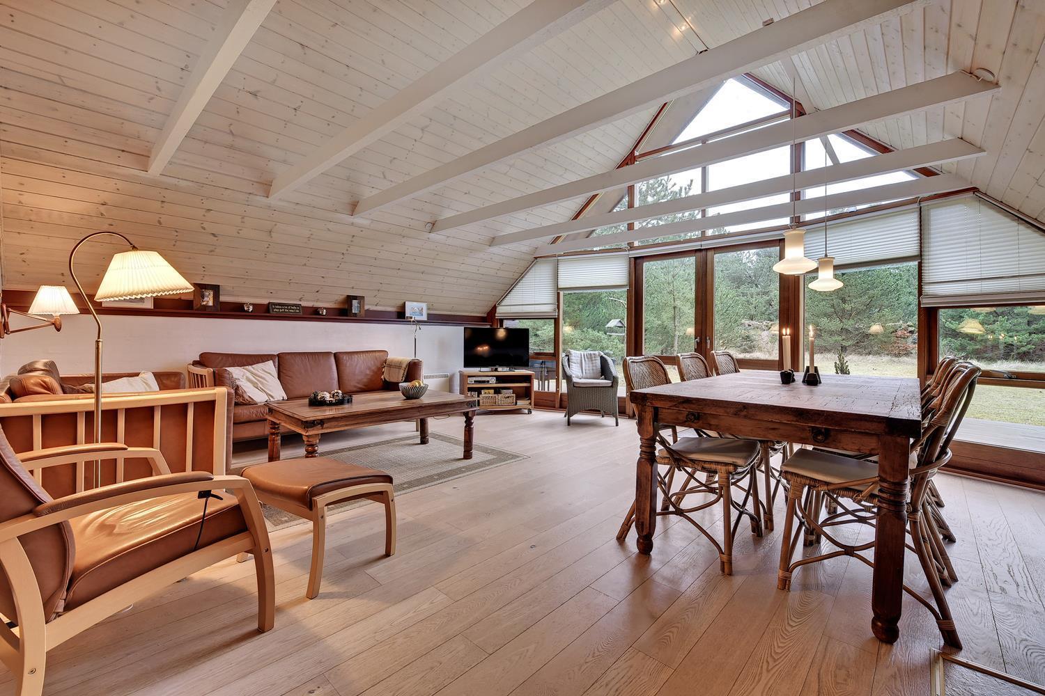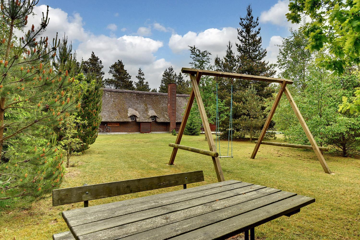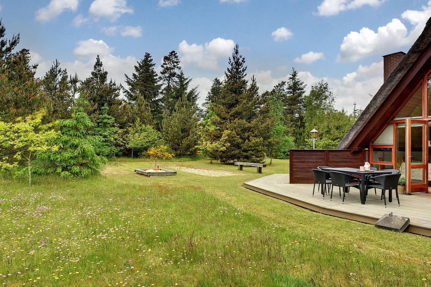 Dette dejlige stråtækte feriehus er beliggende på en børnevenlig og ugeneret grund med træer og buske. Flot badeværelse. Husets køkken er i åben forbindelse med den hyggelige stue, som er indrette med flotte og gode møbler. Der er både lukket 'gårdhave' og skøn træterrasse. 2 senge i Anneks.
