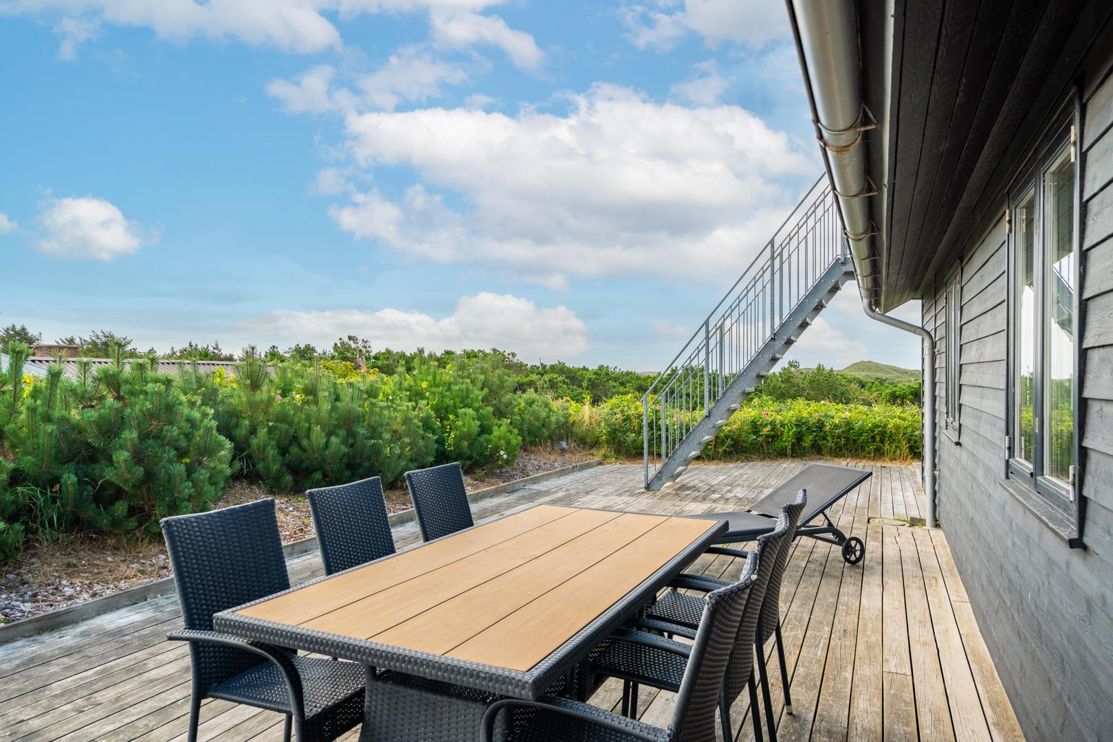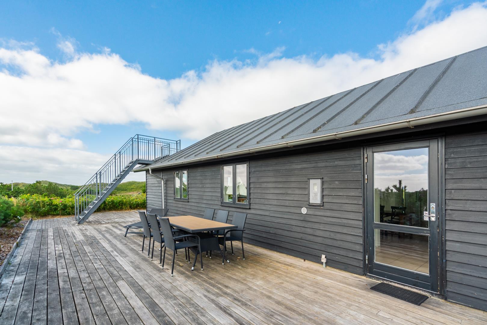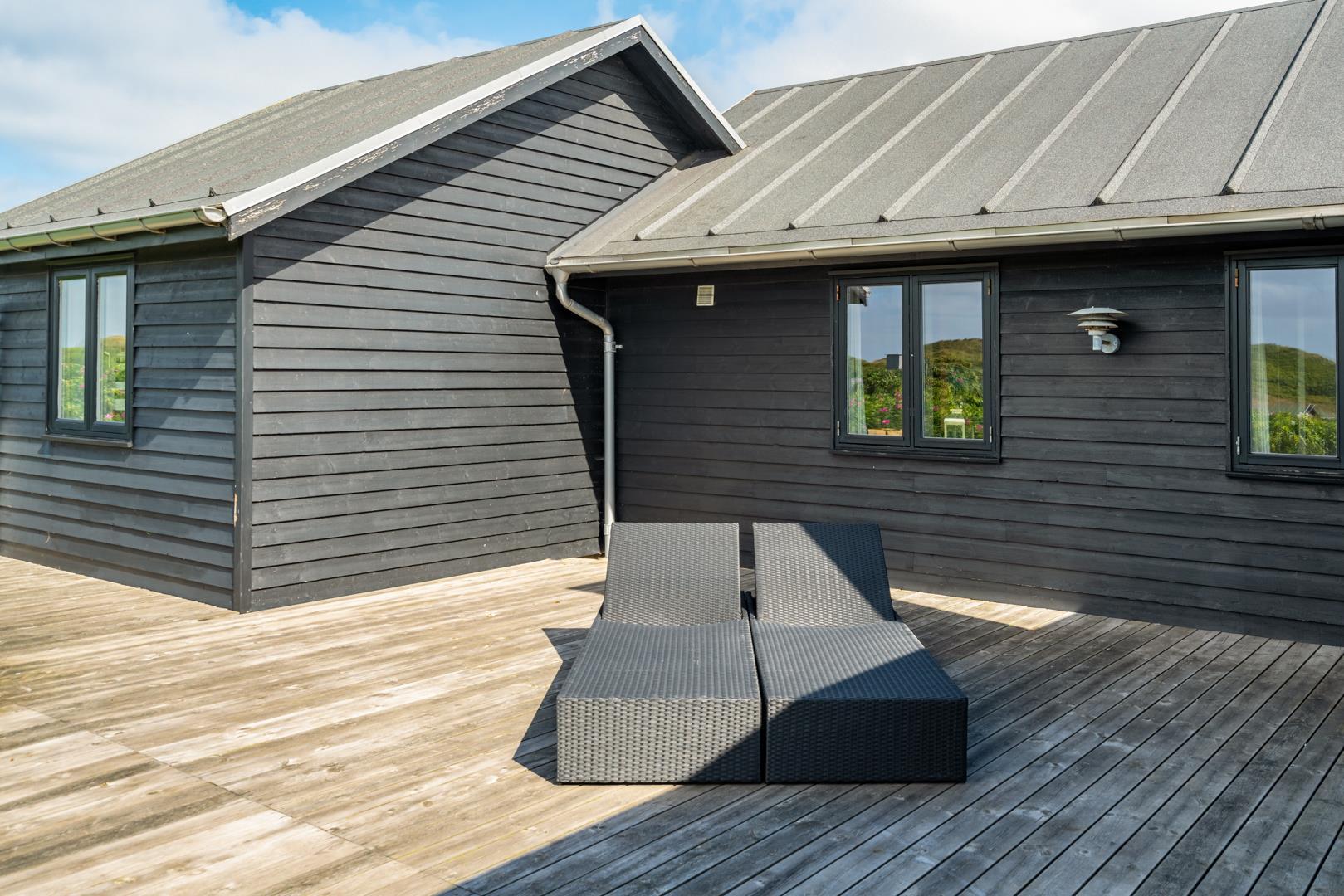 Sommerhuset ligger højt i landskabet, og de smukke omgivelser kan I nyde både gennem vinduerne, fra husets store træterrasse og ikke mindst fra sommerhusets sydvestvendte tagterrasse.