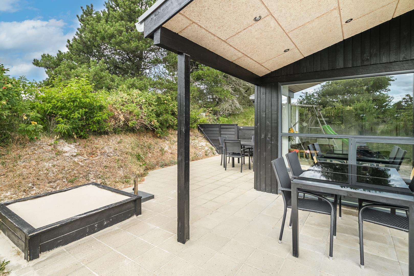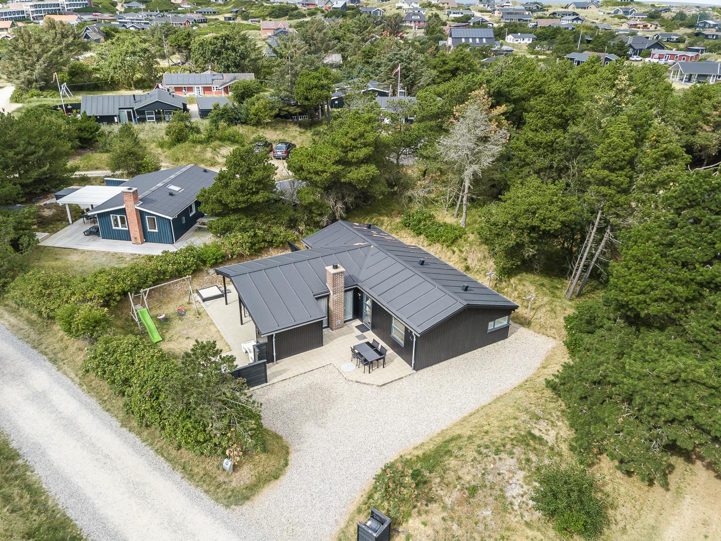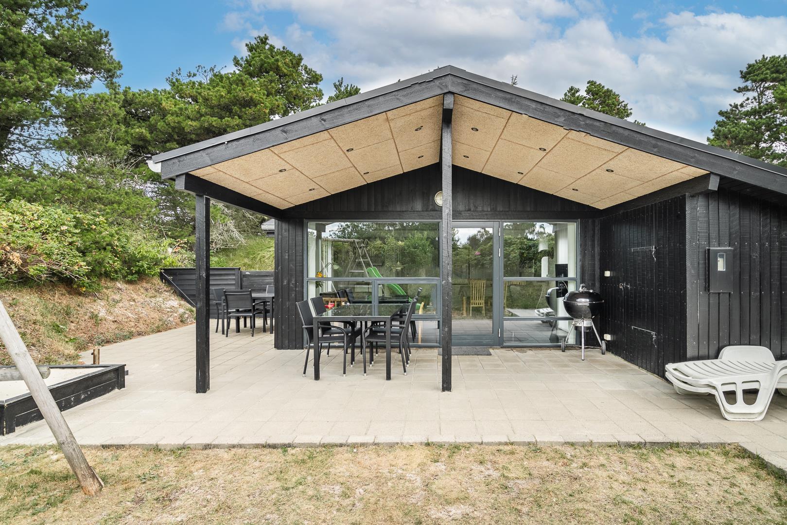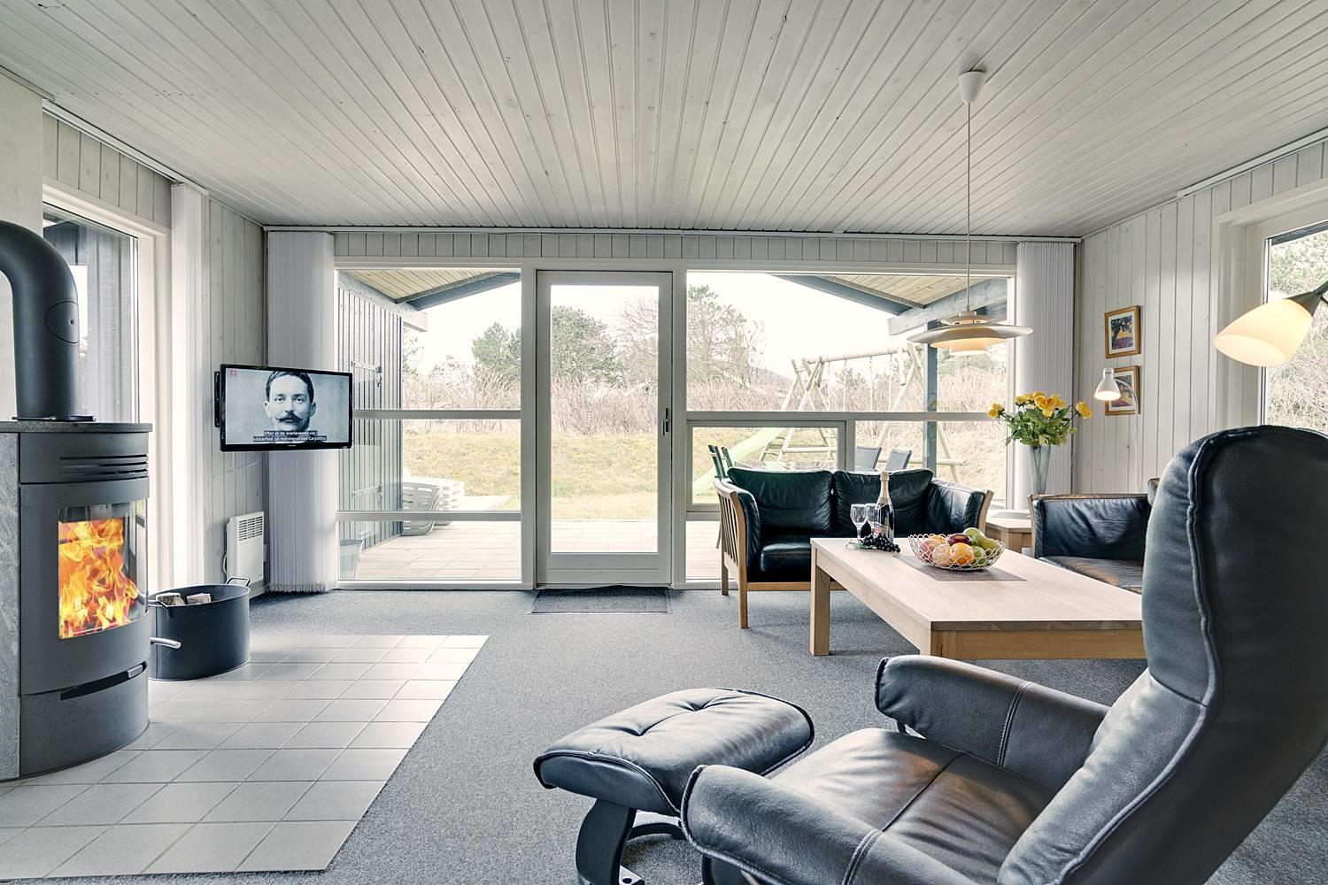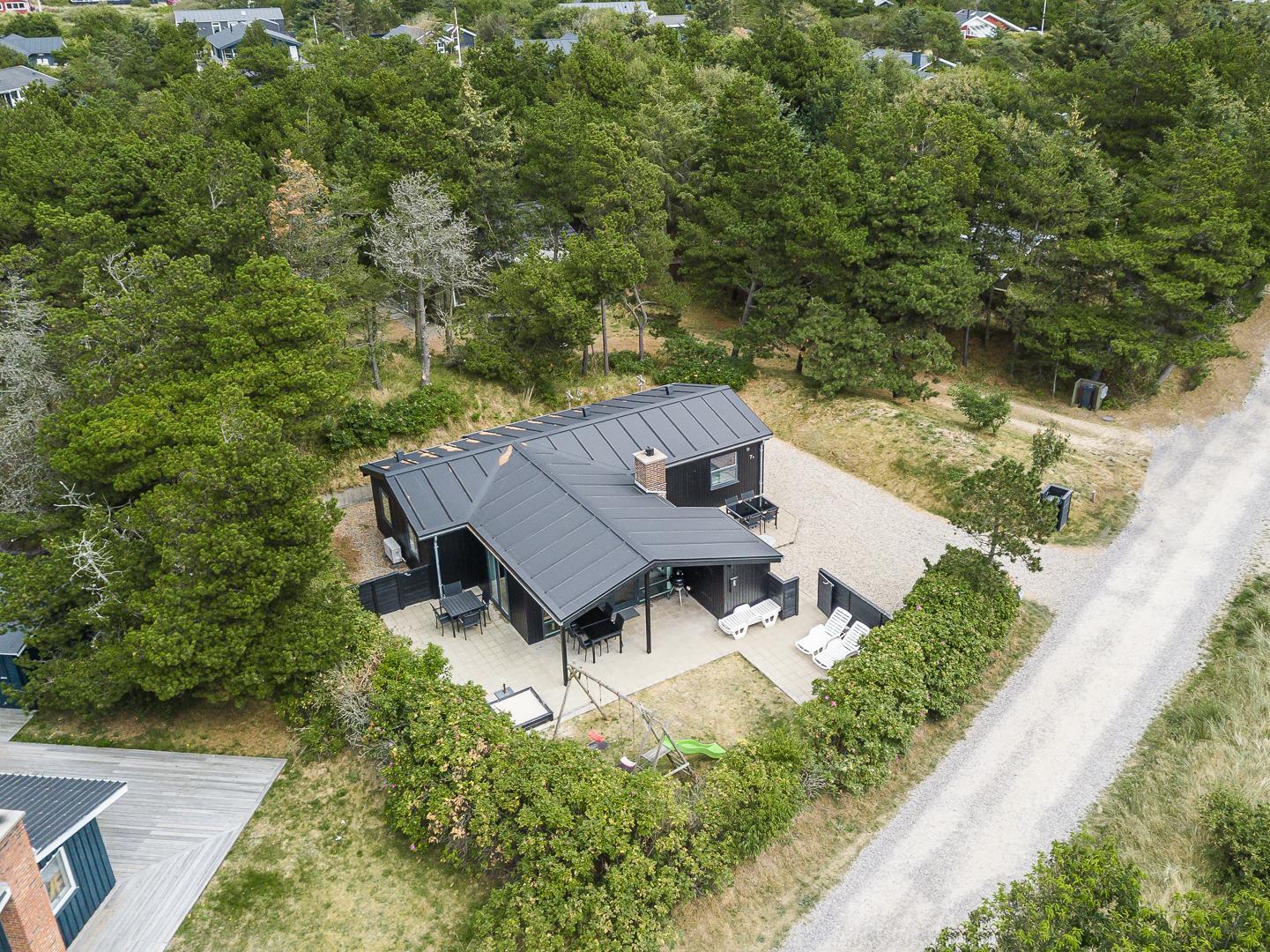 På en læfuld naturgrund omkranset af træer og busker finder I dette meget nutidige og moderniserede feriehus. Huset har en helt lukket terrasse, hvoraf en del er overdækket. På den store terrasse med masser af læ for vinden, forefindes også gynge og sandkasse til de mindste. Endnu en terrasse ved indgangspartiet. Indendørs flot, rummeligt køkken med separat fryser og opvaskemaskin. Lys og venlig stue med spiseplads og siddegruppe med gode lædermøbler og lænestol. Fra stuen er der adgang til soverum med 2 enkeltsenge. Desuden separat afdeling med 1 dobbelt seng samt badeværelse. Ligeledes afdeling med soverum med dobbeltseng og spabadeværelse med sauna samt vaskemaskine og tørretumbler. Med brændeovn og varmepumpe, er huset miljøvenligt og energi besparende. Trådløst internet i ferien findes her også.