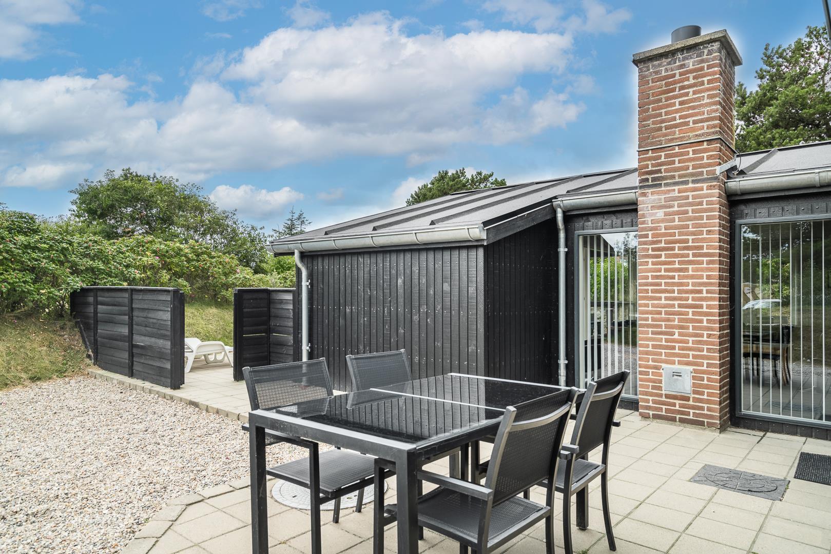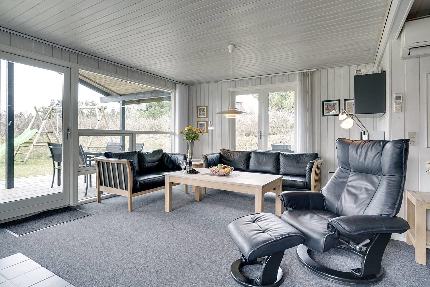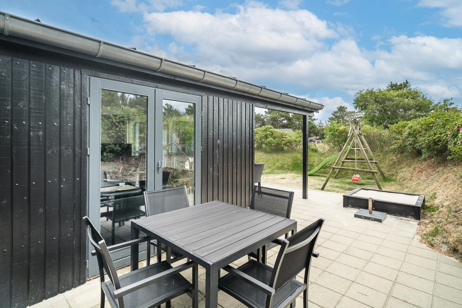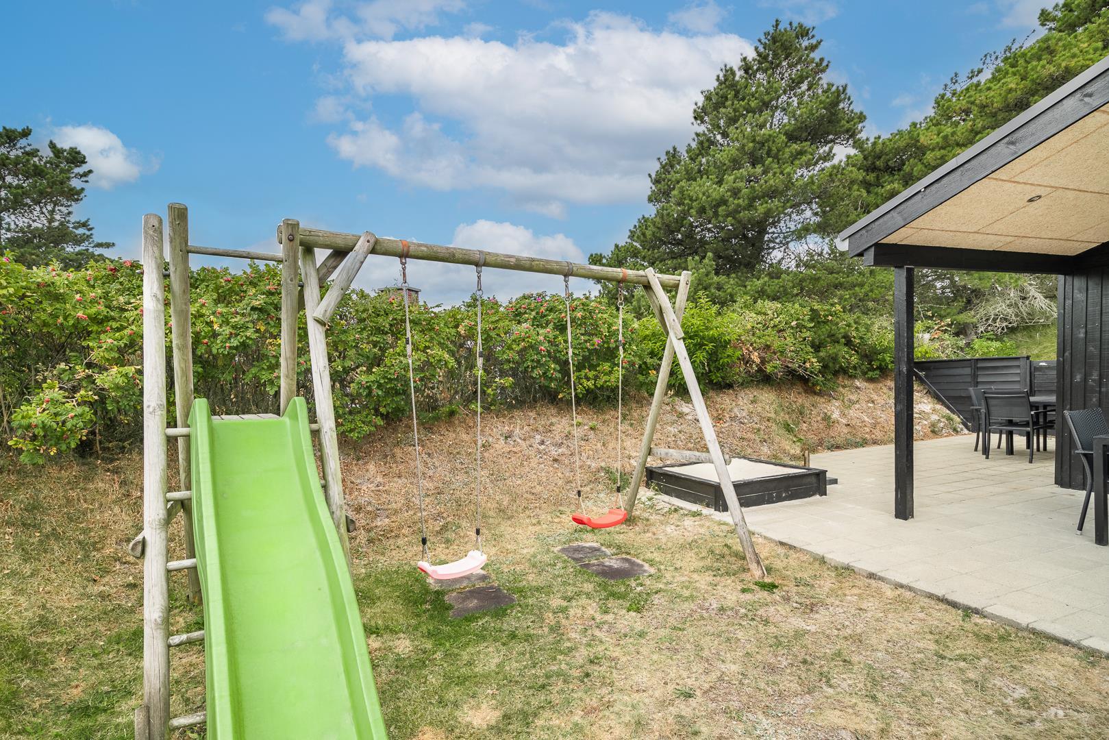 På en læfuld naturgrund omkranset af træer og busker finder I dette meget nutidige og moderniserede feriehus. Huset har en helt lukket terrasse, hvoraf en del er overdækket. På den store terrasse med masser af læ for vinden, forefindes også gynge og sandkasse til de mindste. Endnu en terrasse ved indgangspartiet. Indendørs flot, rummeligt køkken med separat fryser og opvaskemaskin. Lys og venlig stue med spiseplads og siddegruppe med gode lædermøbler og lænestol. Fra stuen er der adgang til soverum med 2 enkeltsenge. Desuden separat afdeling med 1 dobbelt seng samt badeværelse. Ligeledes afdeling med soverum med dobbeltseng og spabadeværelse med sauna samt vaskemaskine og tørretumbler. Med brændeovn og varmepumpe, er huset miljøvenligt og energi besparende. Trådløst internet i ferien findes her også.