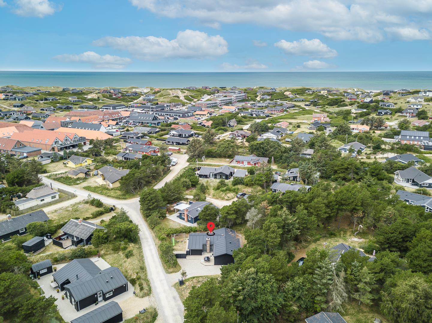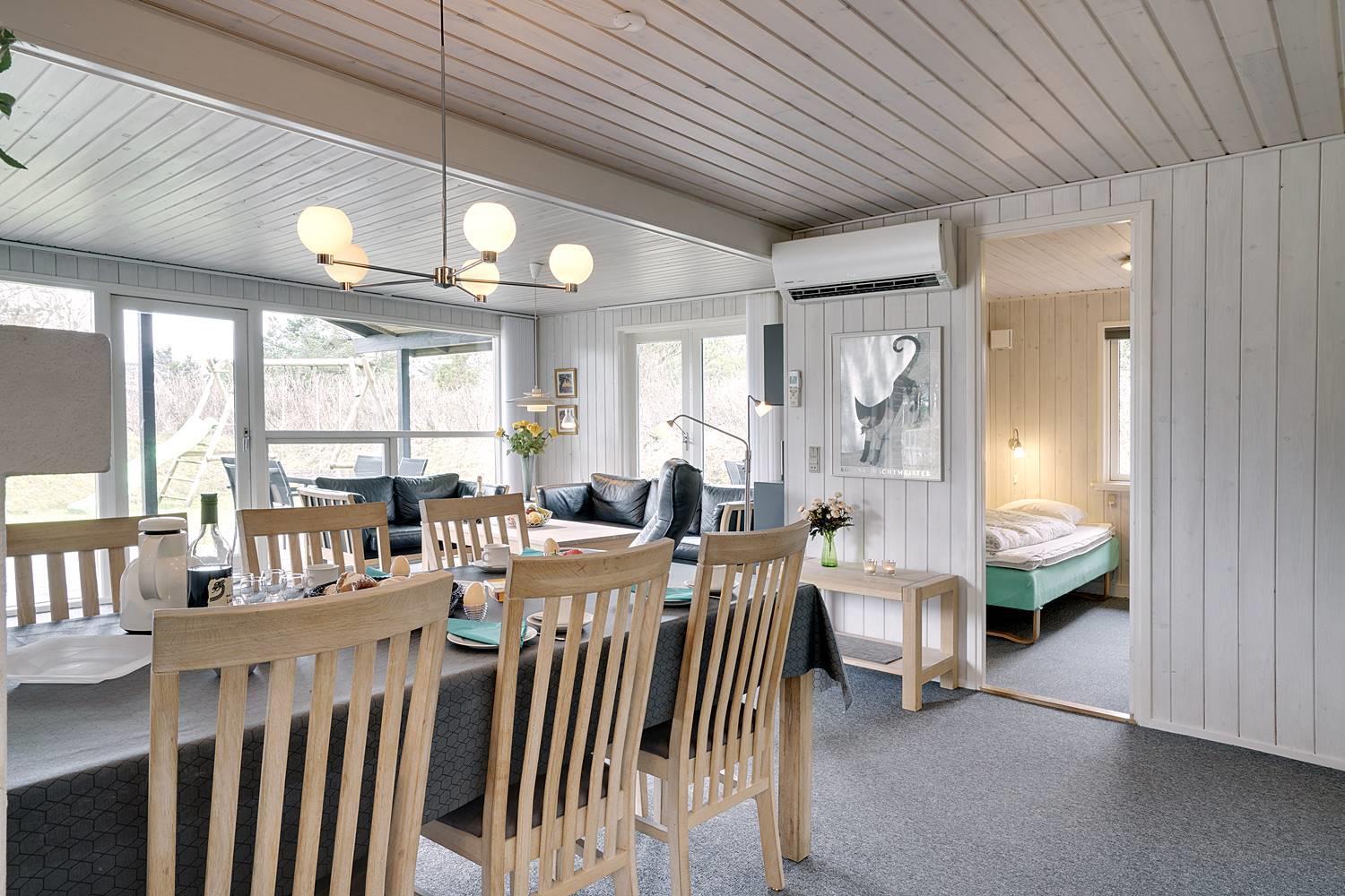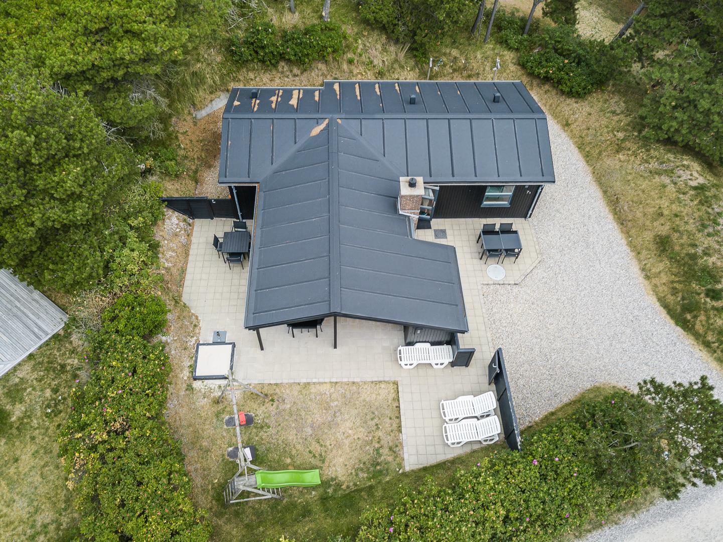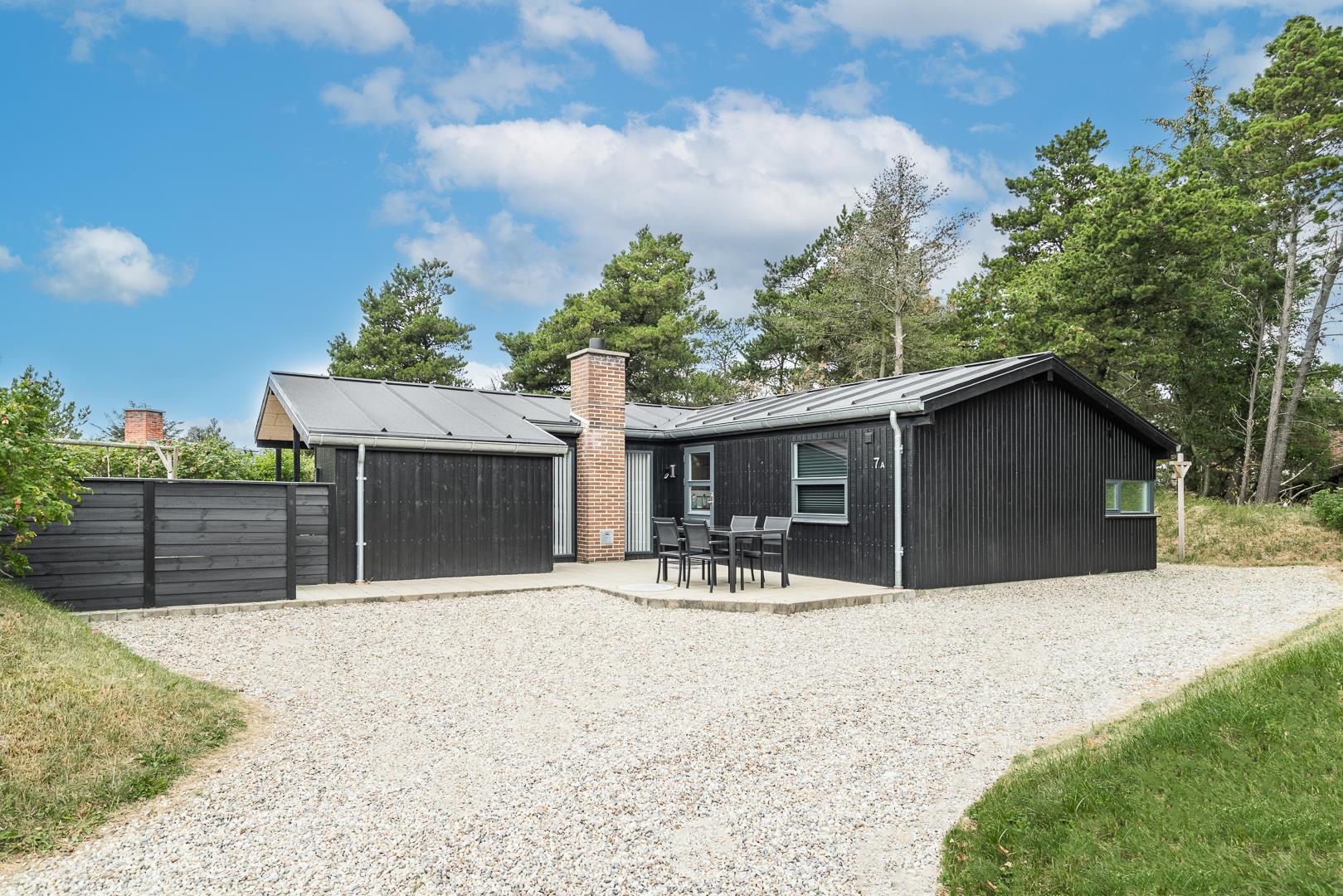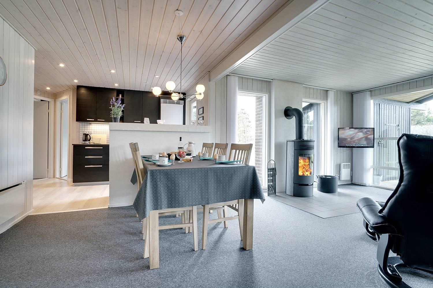 På en læfuld naturgrund omkranset af træer og busker finder I dette meget nutidige og moderniserede feriehus. Huset har en helt lukket terrasse, hvoraf en del er overdækket. På den store terrasse med masser af læ for vinden, forefindes også gynge og sandkasse til de mindste. Endnu en terrasse ved indgangspartiet. Indendørs flot, rummeligt køkken med separat fryser og opvaskemaskin. Lys og venlig stue med spiseplads og siddegruppe med gode lædermøbler og lænestol. Fra stuen er der adgang til soverum med 2 enkeltsenge. Desuden separat afdeling med 1 dobbelt seng samt badeværelse. Ligeledes afdeling med soverum med dobbeltseng og spabadeværelse med sauna samt vaskemaskine og tørretumbler. Med brændeovn og varmepumpe, er huset miljøvenligt og energi besparende. Trådløst internet i ferien findes her også.