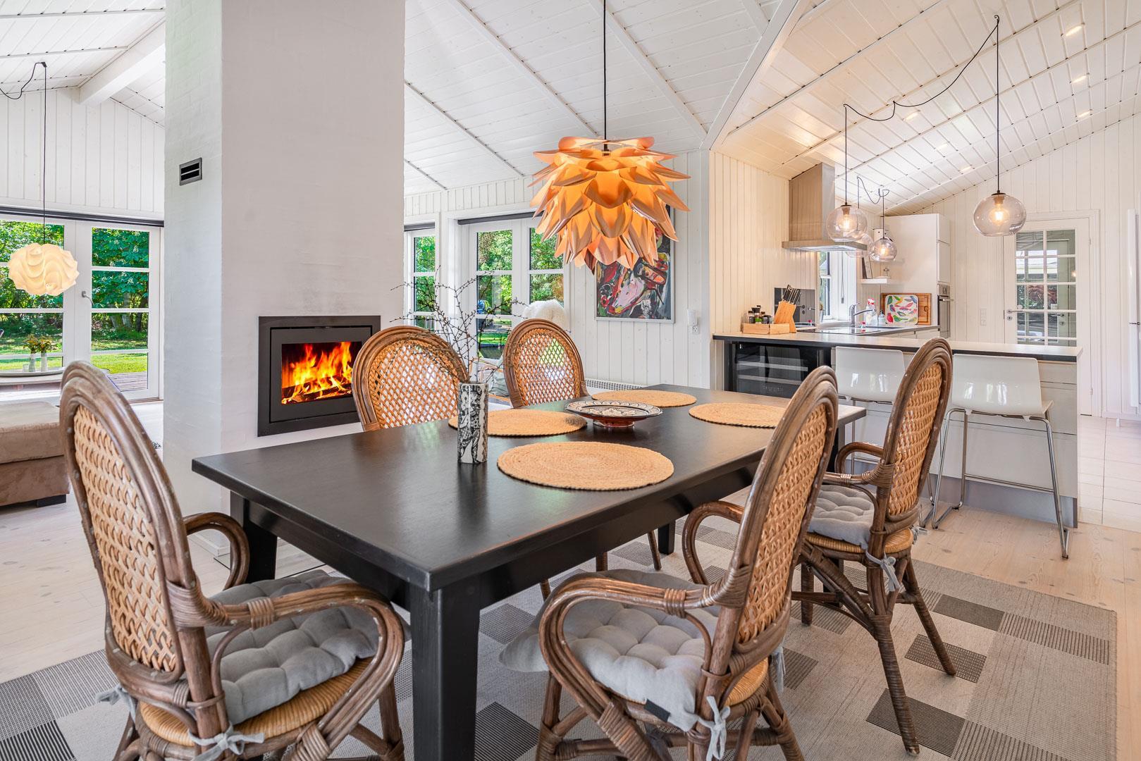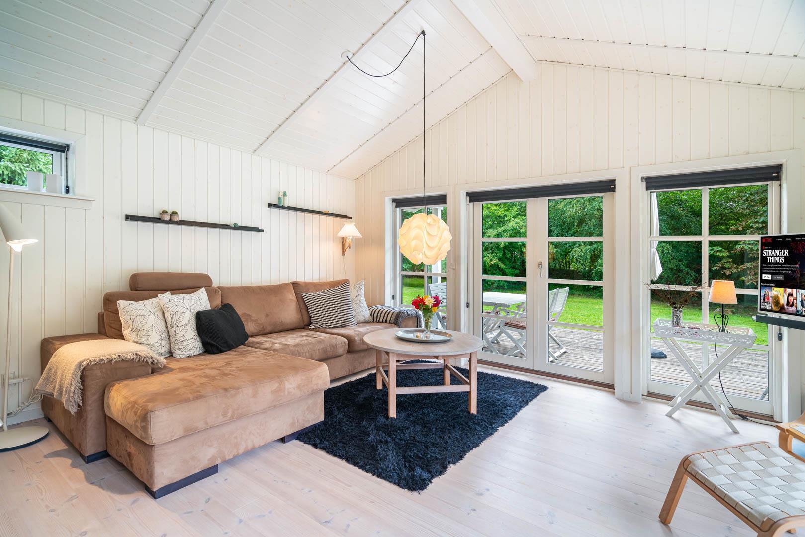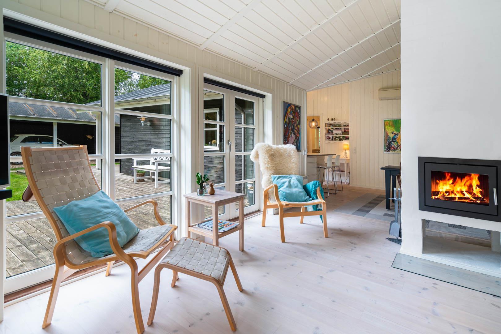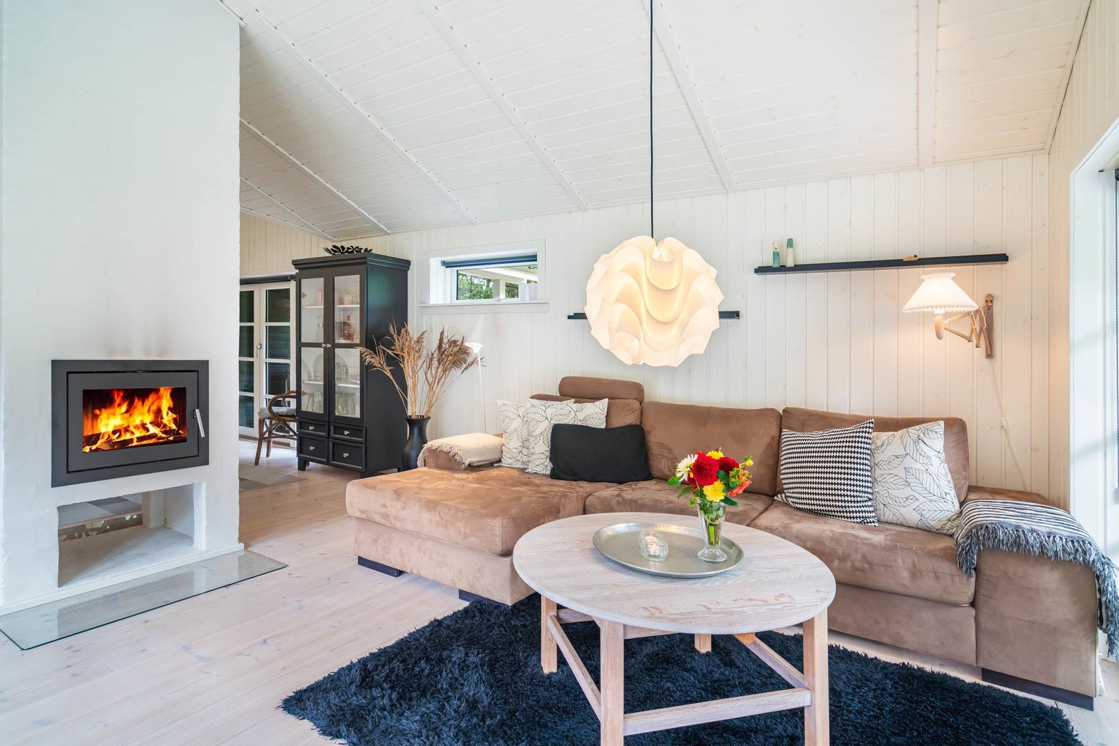 Huset er smagfuldt indrettet i skandinavisk stil, i lyse og venlige nuancer, Der er lagt vægt på kvalitet og hygge. Det dejlige køkken er åbent ind til stuen hvor store vinduer giver et godt lys, i midten af rummet står der en brændeovn. Med gode soverum, 1 badeværelser med bruseniche og badekar + et gæstetoilet, er dette et velfungerende sommerhus.
