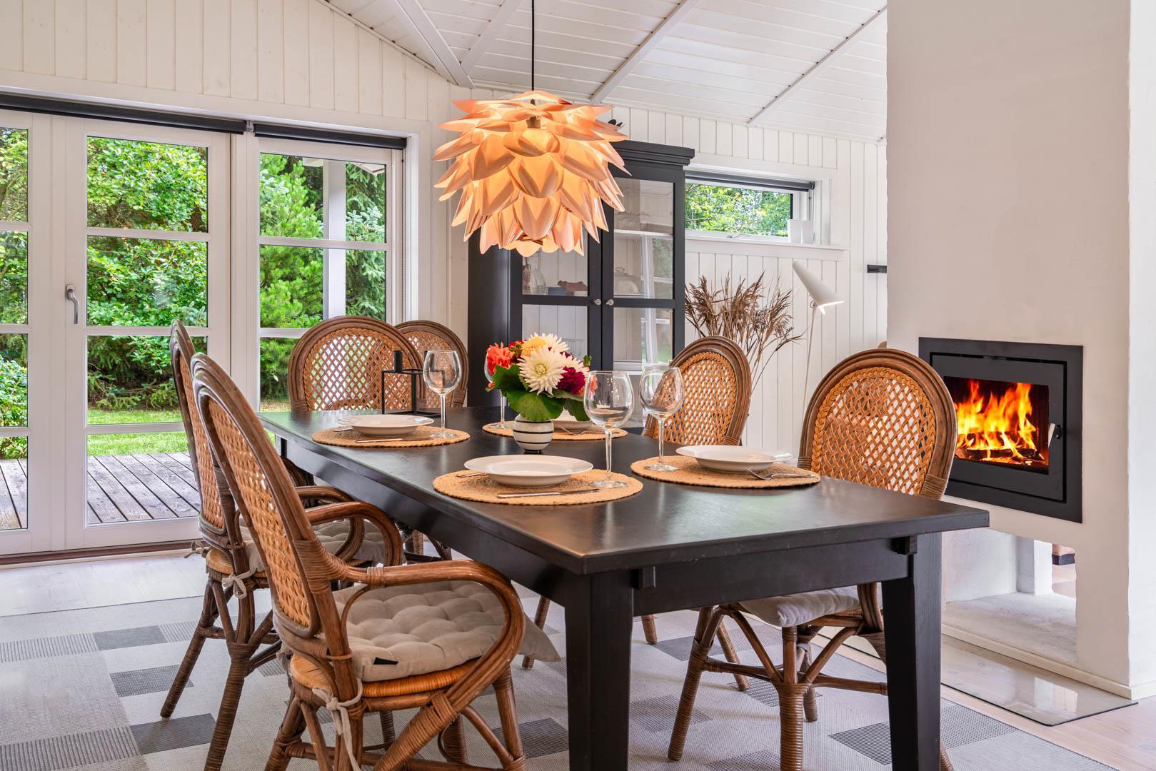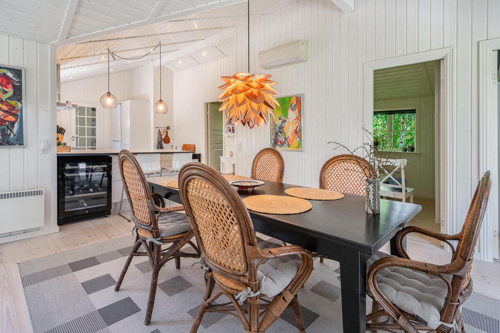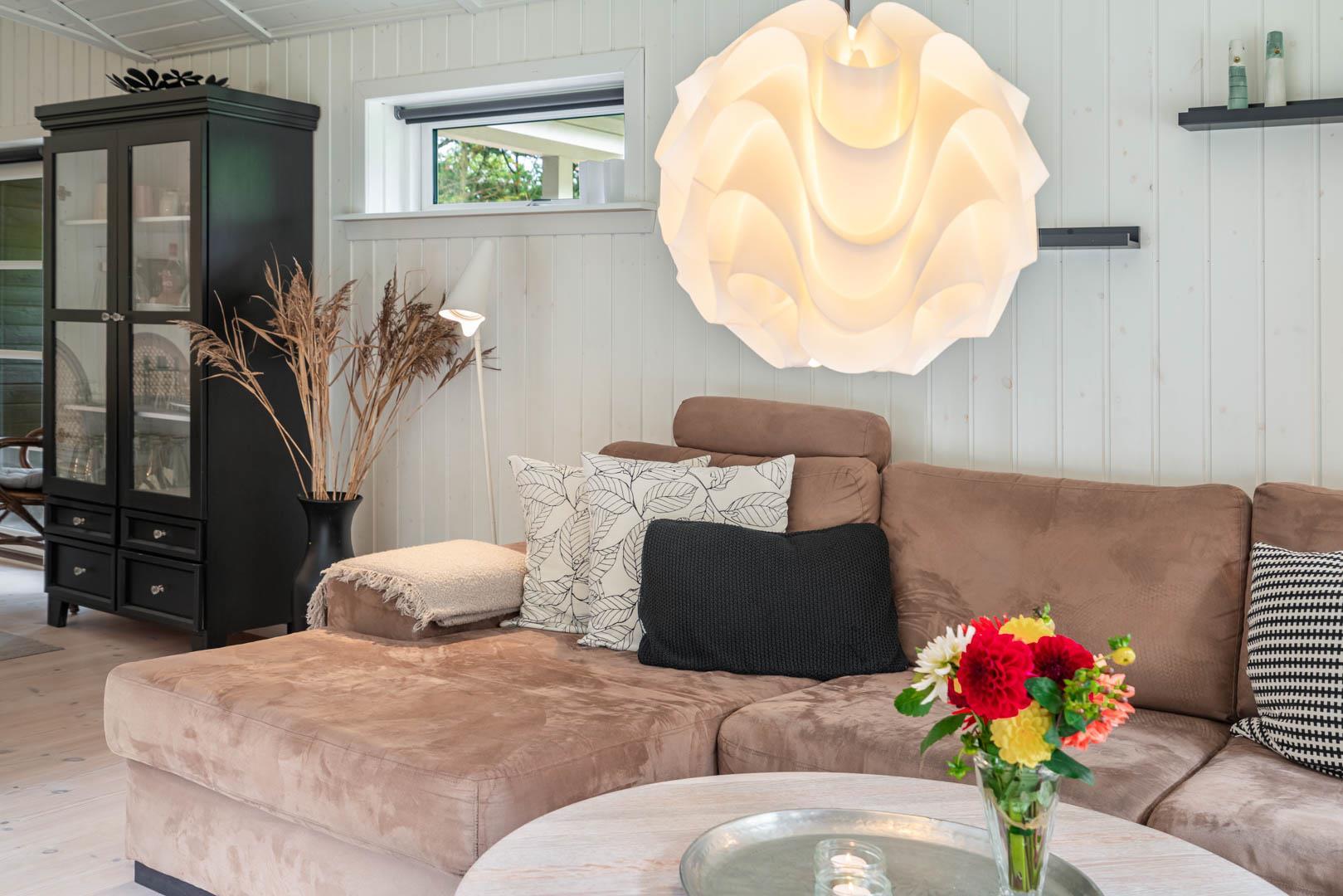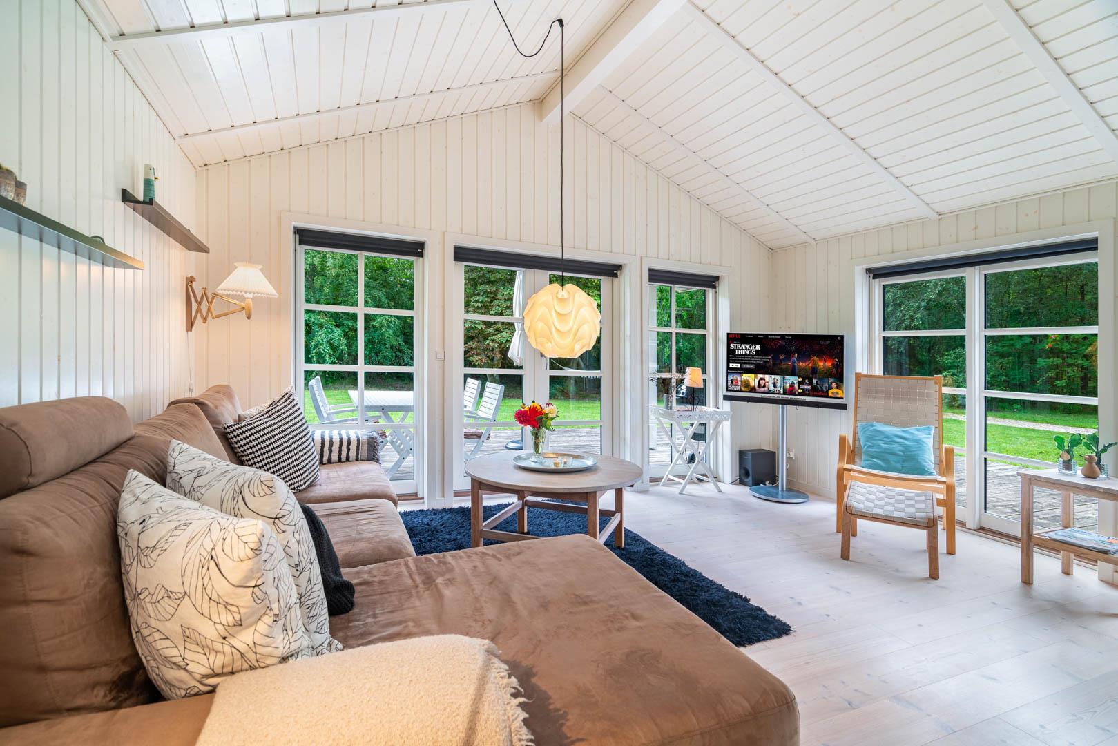 Huset er smagfuldt indrettet i skandinavisk stil, i lyse og venlige nuancer, Der er lagt vægt på kvalitet og hygge. Det dejlige køkken er åbent ind til stuen hvor store vinduer giver et godt lys, i midten af rummet står der en brændeovn. Med gode soverum, 1 badeværelser med bruseniche og badekar + et gæstetoilet, er dette et velfungerende sommerhus.