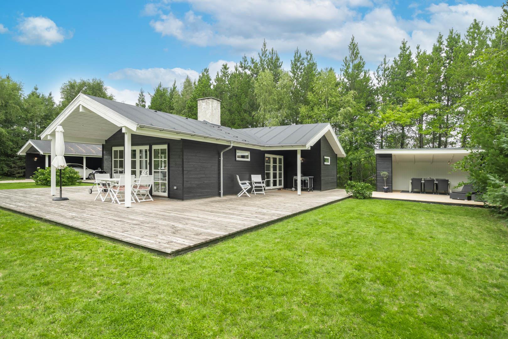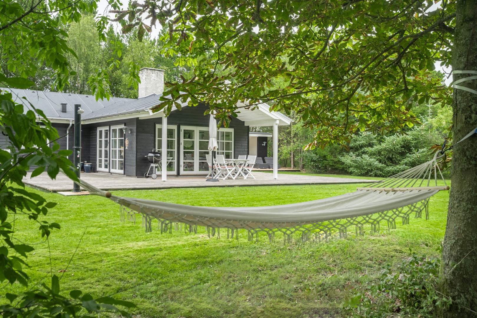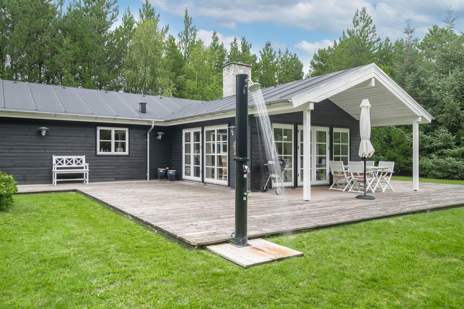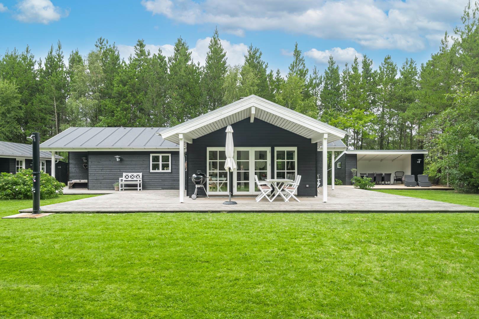 Huset ligger på en stor lukket naturgrund omkranset af træer der giver huset en særlig charme. På den dejlige terrasse findes der havemøbler og grill. Desuden findes dere et dejligt lounge-område med udekøkken, shelters med bålplads og en udendørs solbruser.