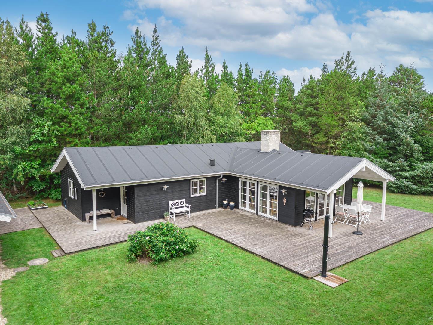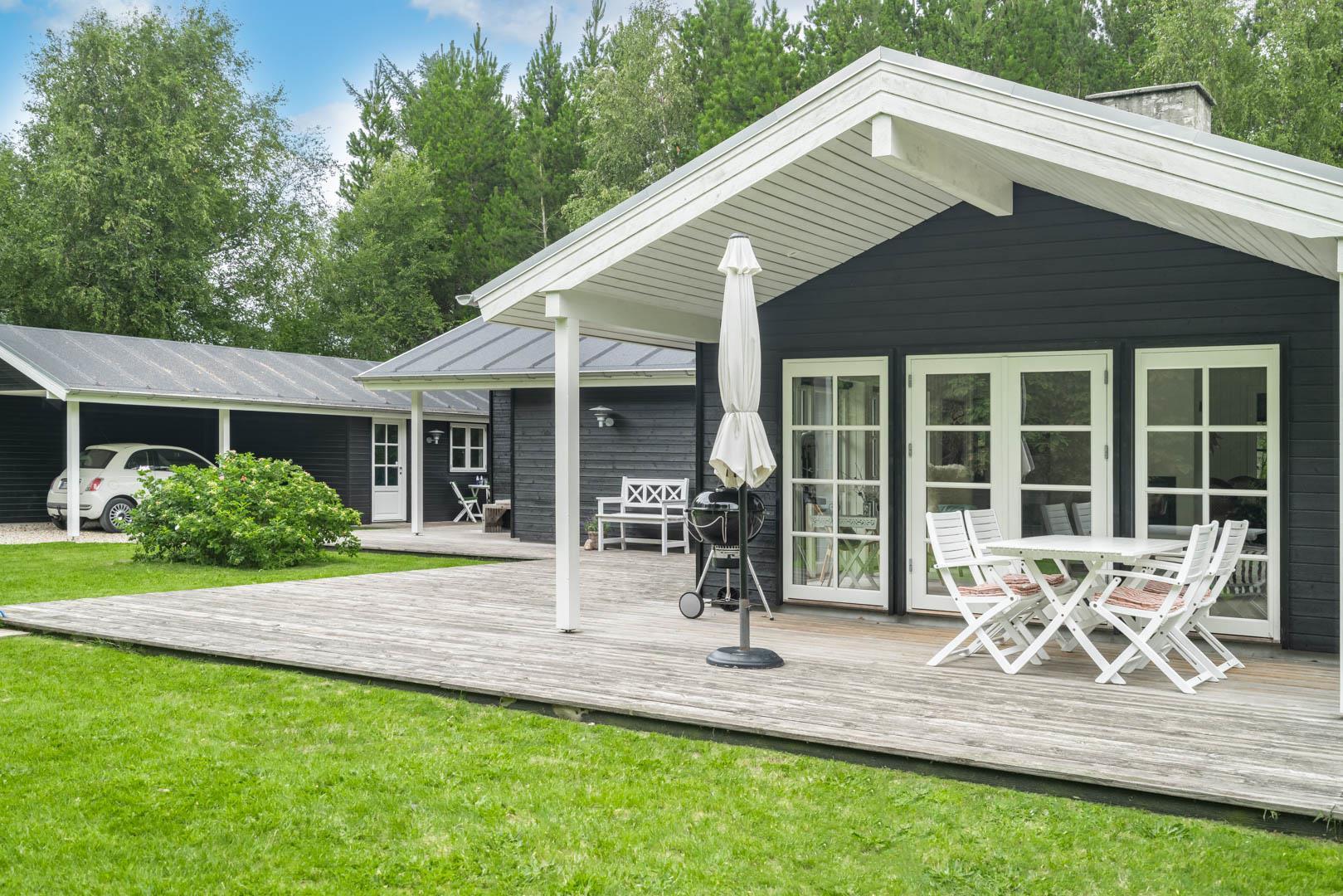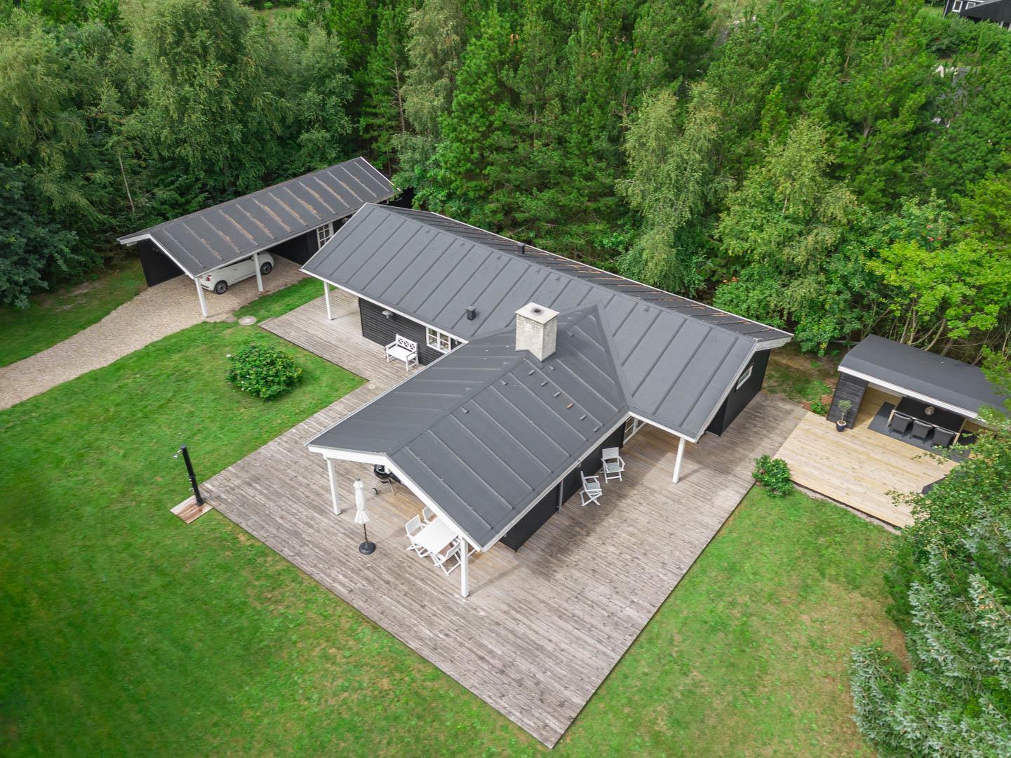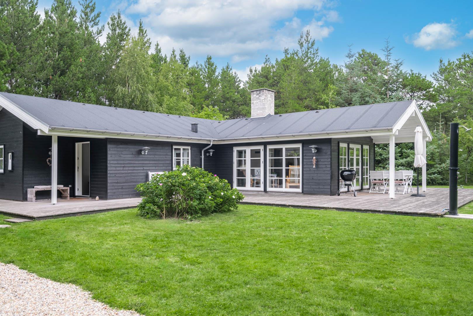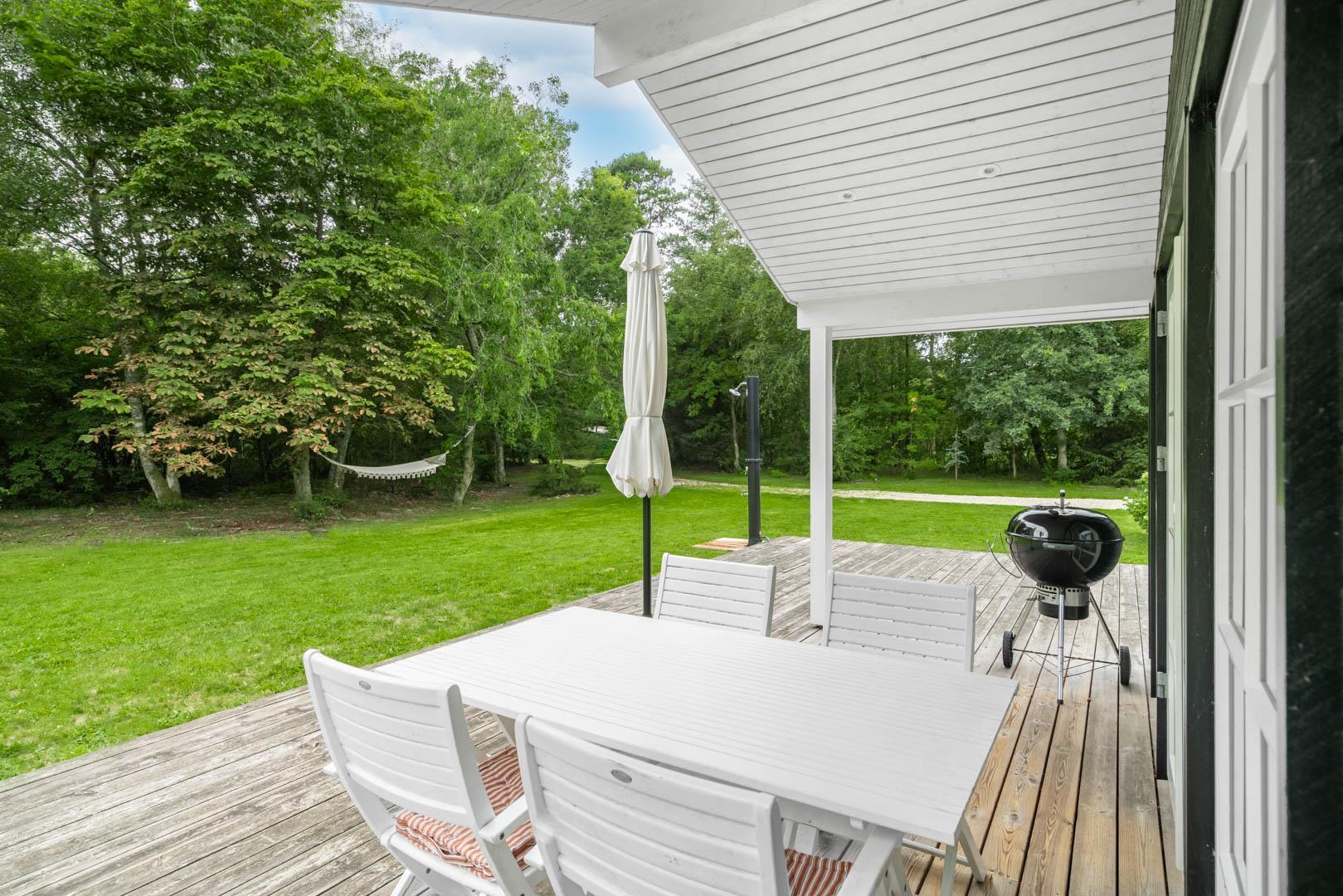 Huset ligger på en stor lukket naturgrund omkranset af træer der giver huset en særlig charme. På den dejlige terrasse findes der havemøbler og grill. Desuden findes dere et dejligt lounge-område med udekøkken, shelters med bålplads og en udendørs solbruser.