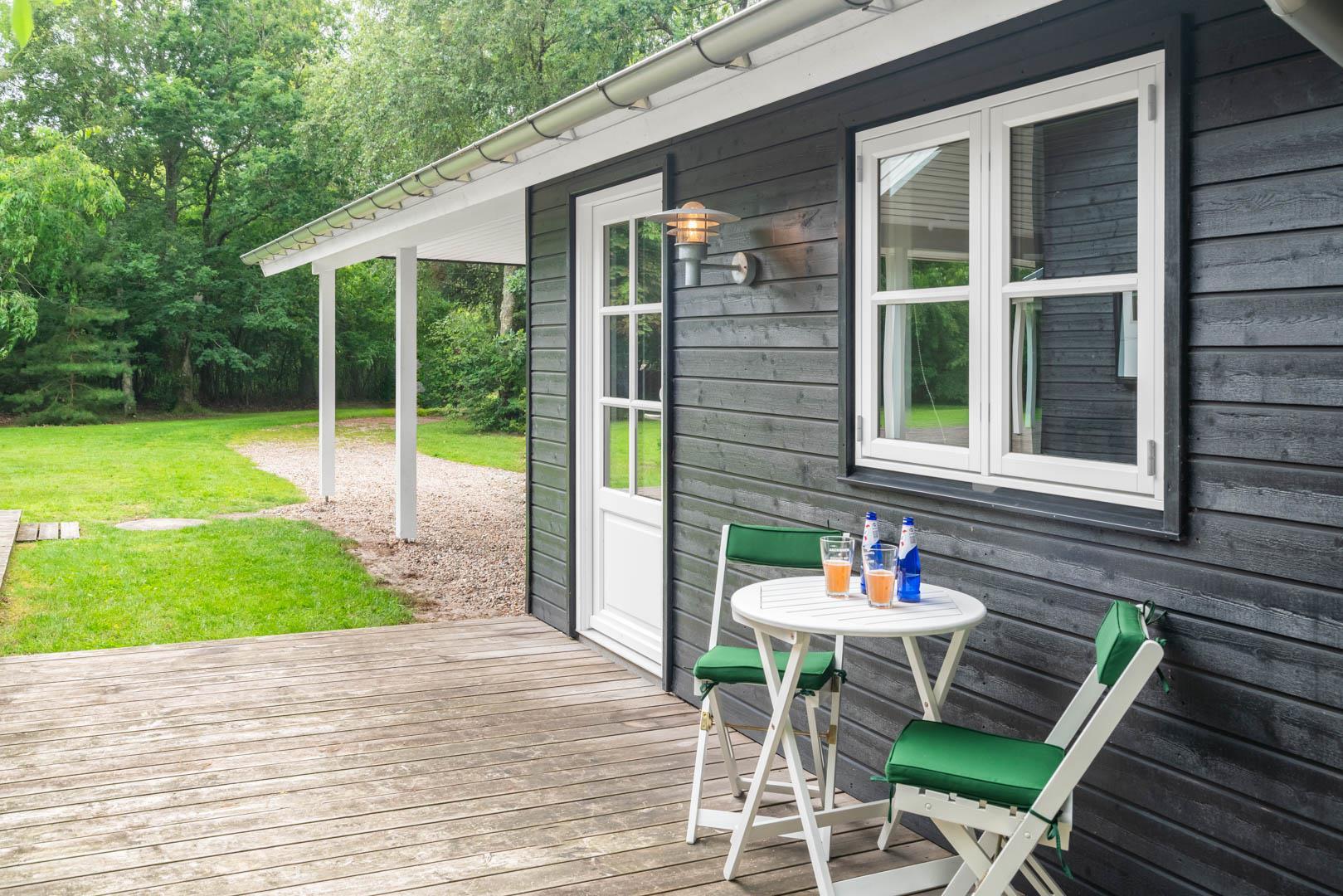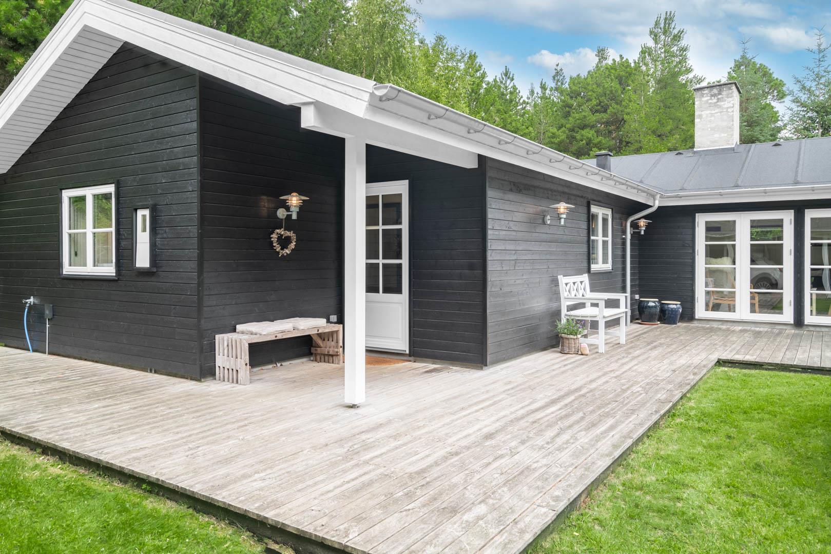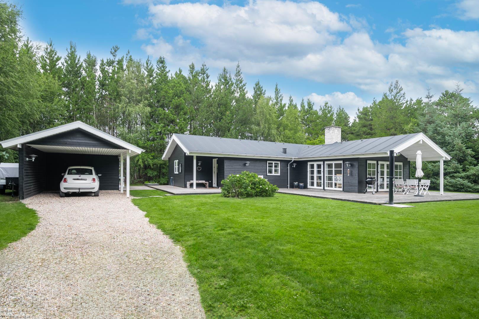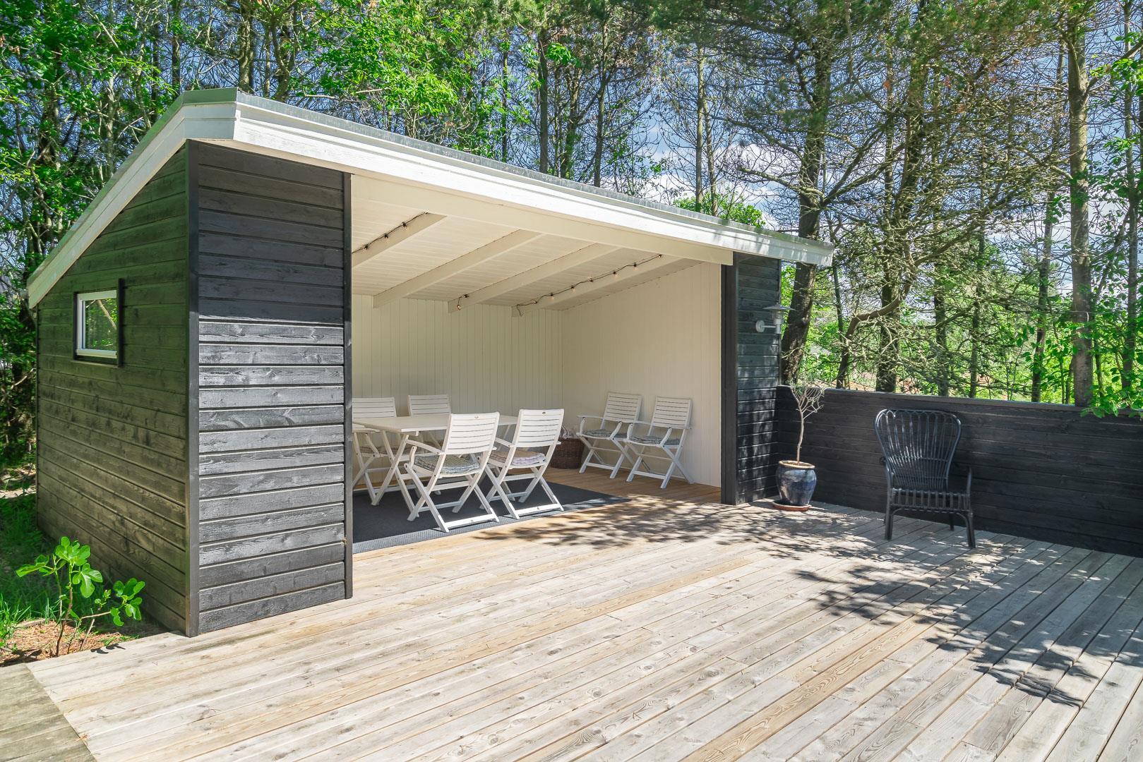 Huset ligger på en stor lukket naturgrund omkranset af træer der giver huset en særlig charme. På den dejlige terrasse findes der havemøbler og grill. Desuden findes dere et dejligt lounge-område med udekøkken, shelters med bålplads og en udendørs solbruser.