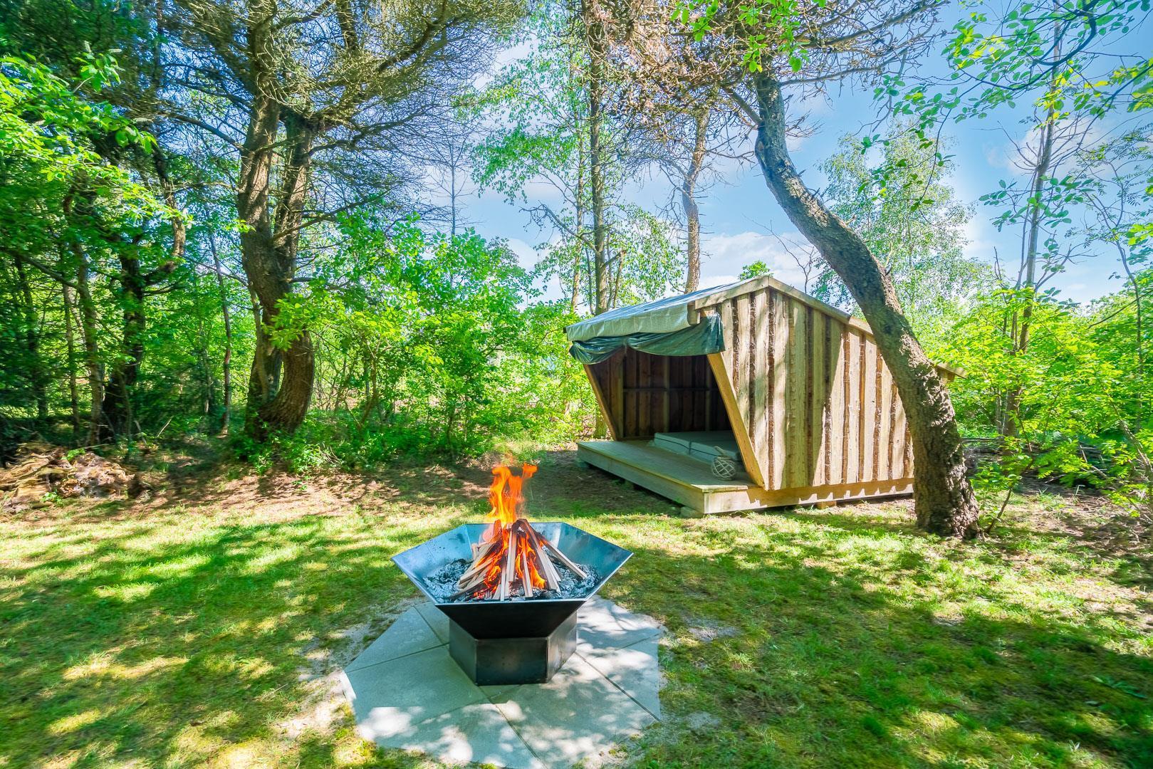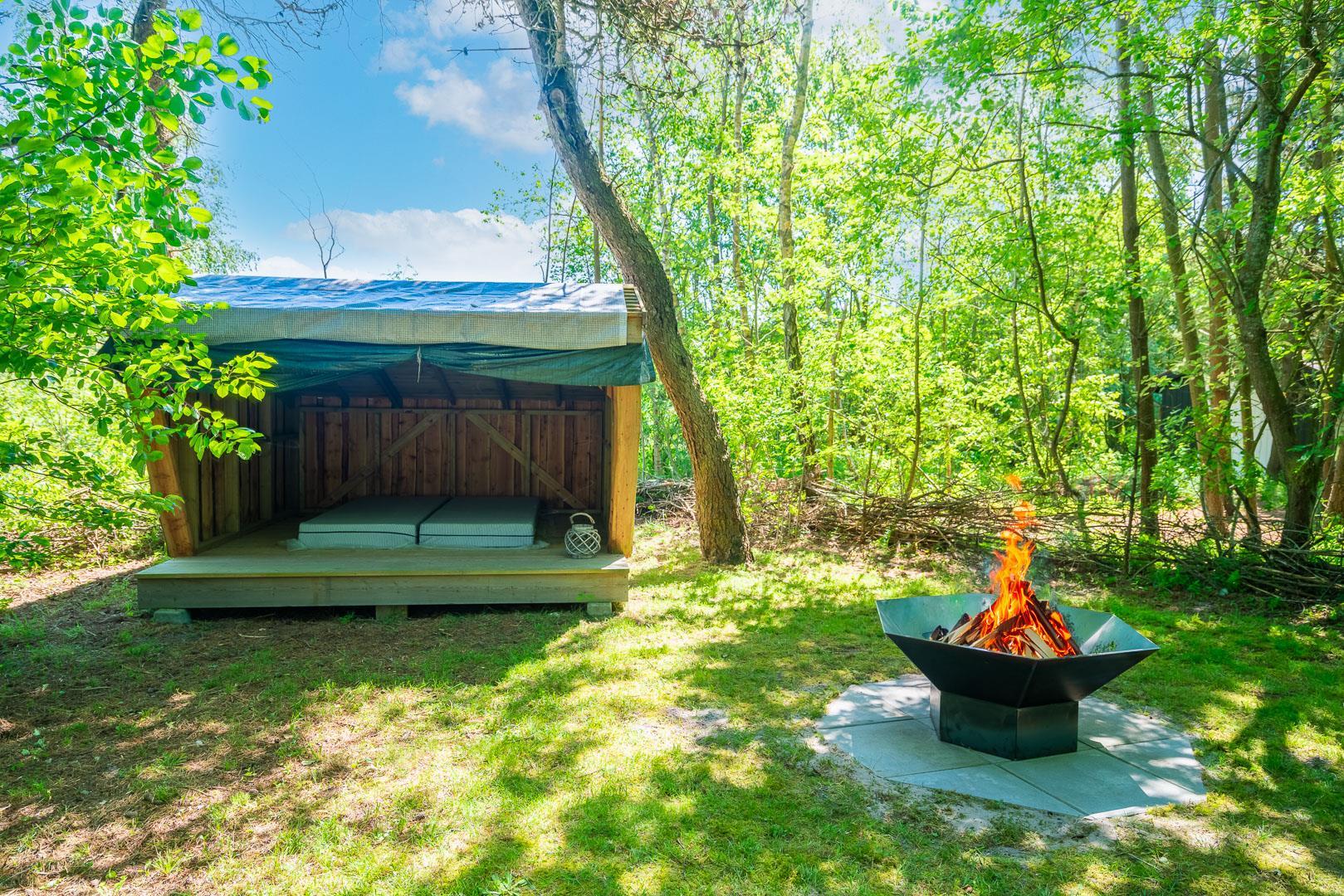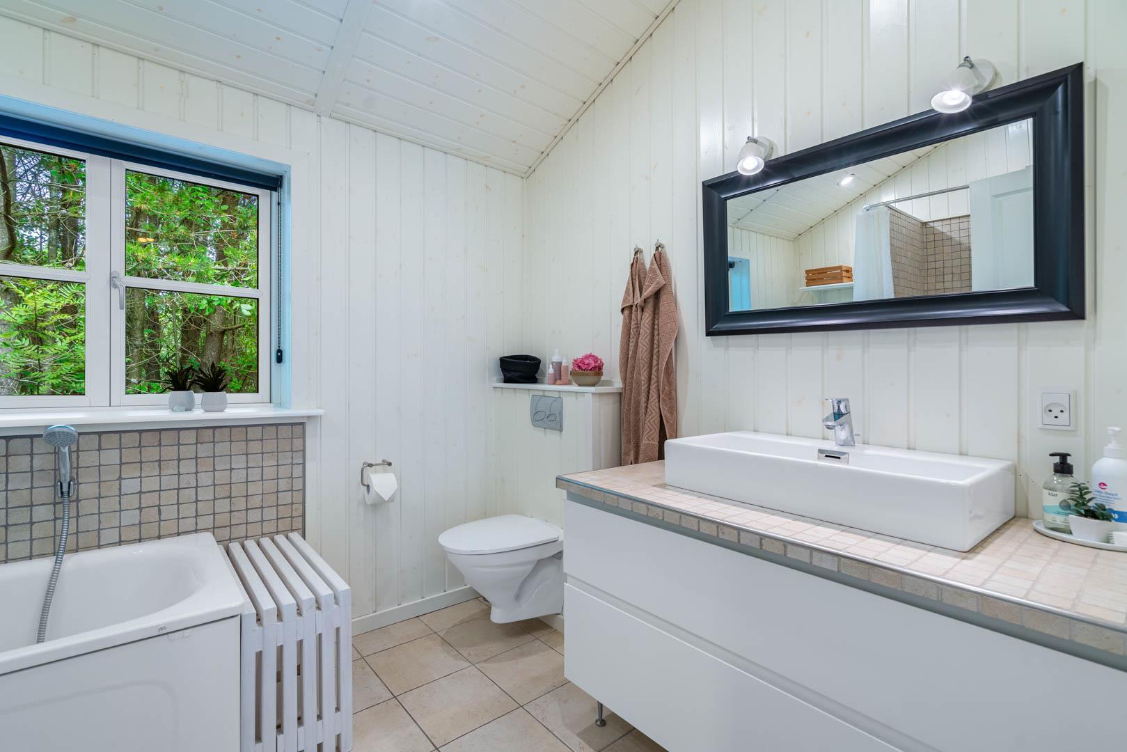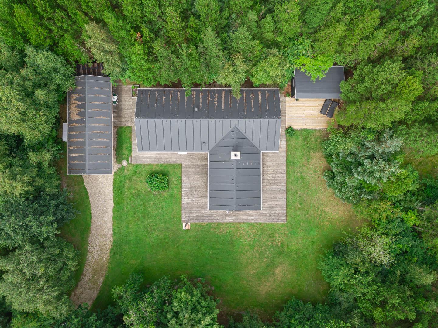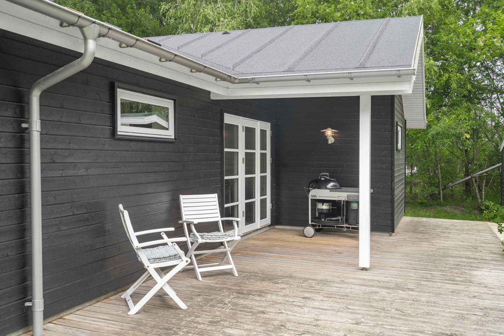 Huset ligger på en stor lukket naturgrund omkranset af træer der giver huset en særlig charme. På den dejlige terrasse findes der havemøbler og grill. Desuden findes dere et dejligt lounge-område med udekøkken, shelters med bålplads og en udendørs solbruser.