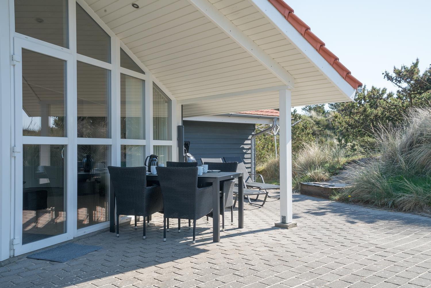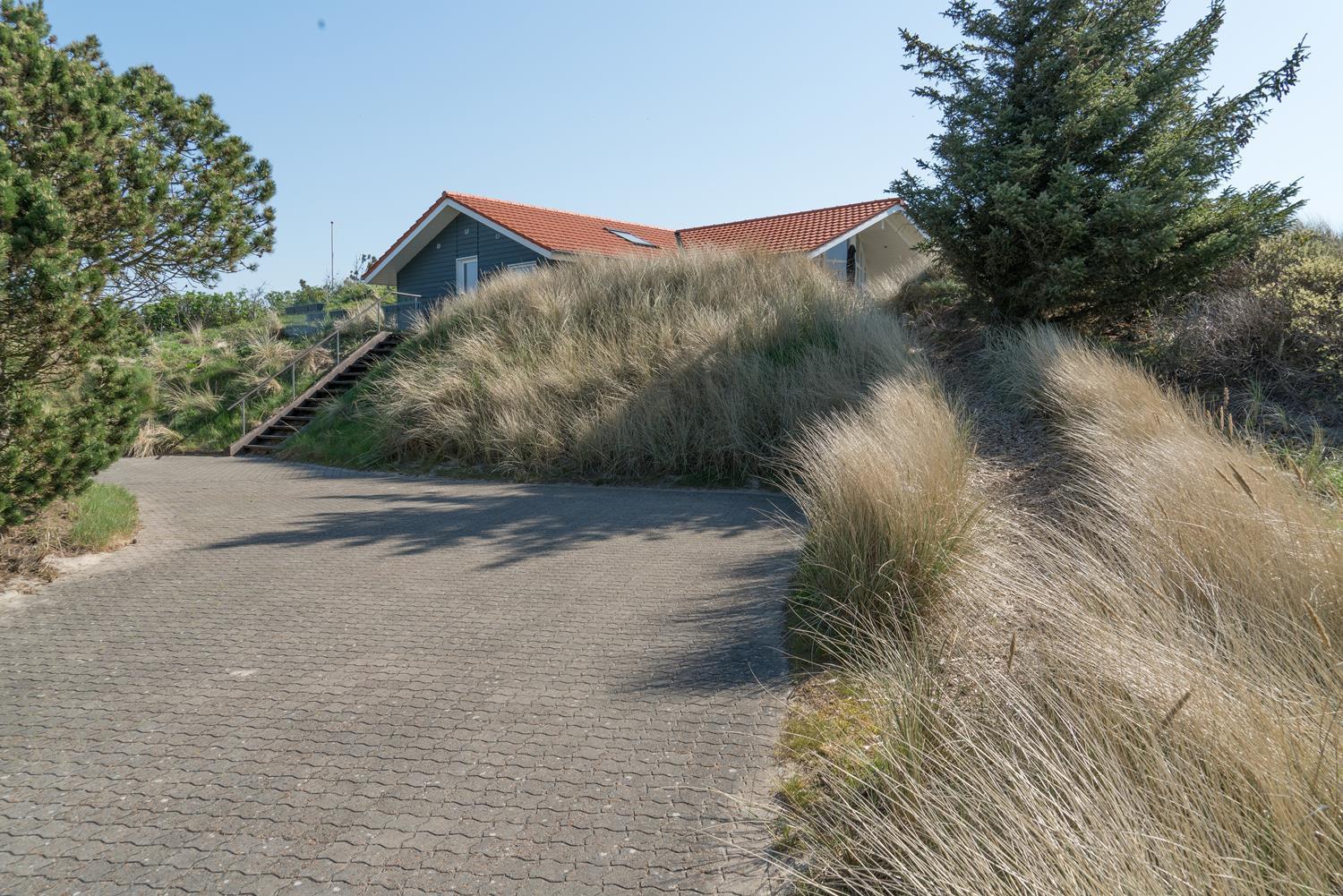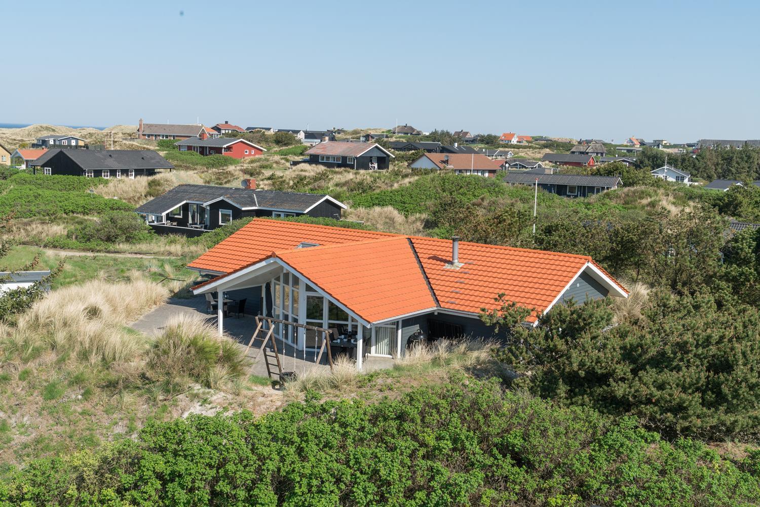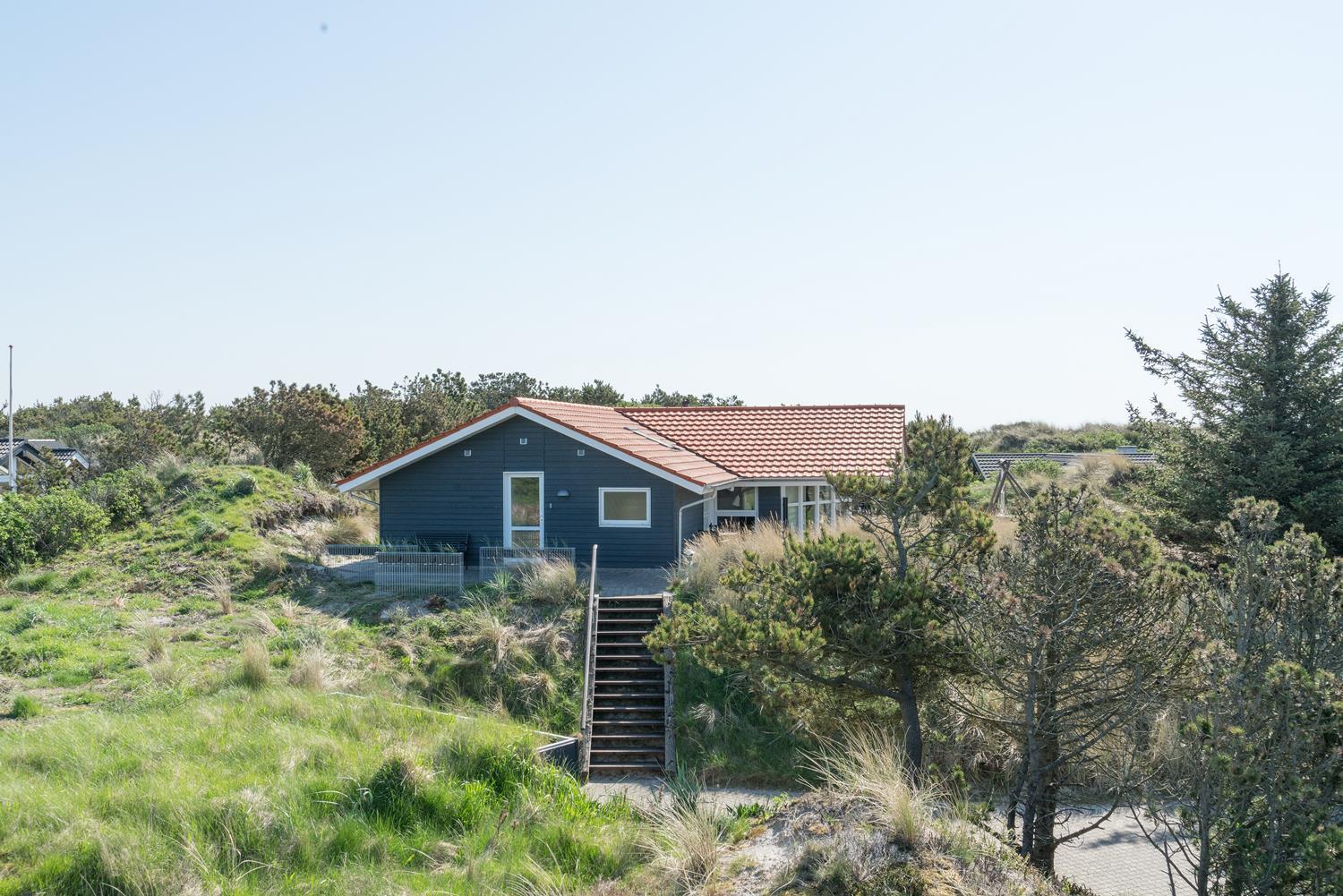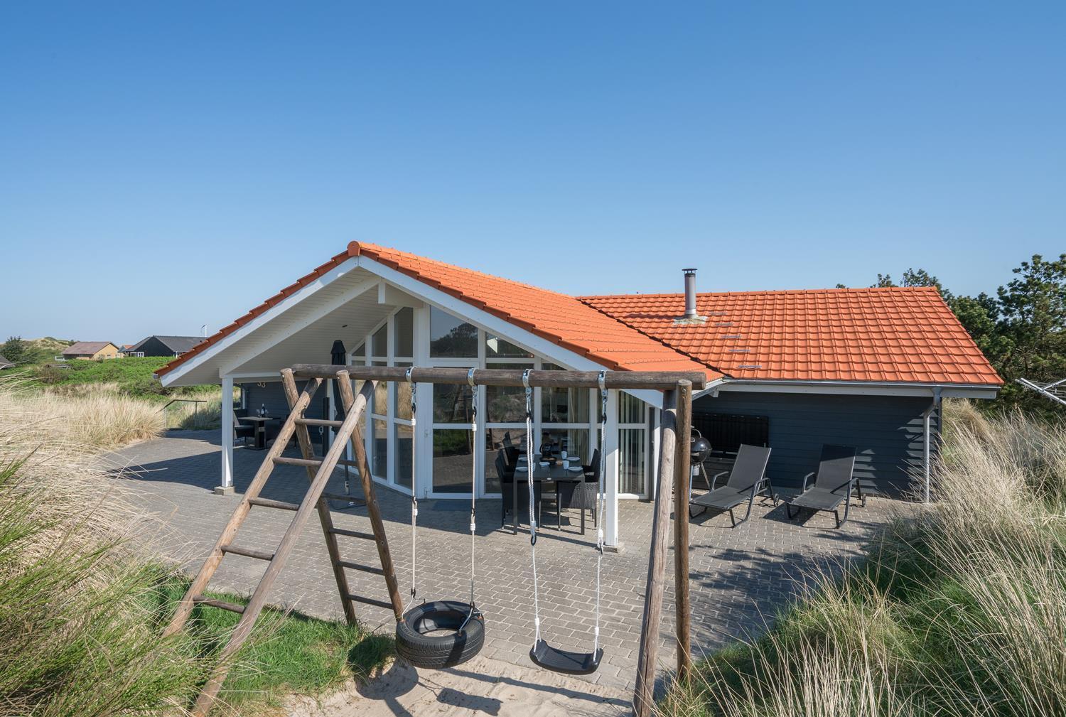 Velholdt feriehus i Henne Strand med sauna, spa, og flot udsigt fra terrasse på kuperet klitgrund.