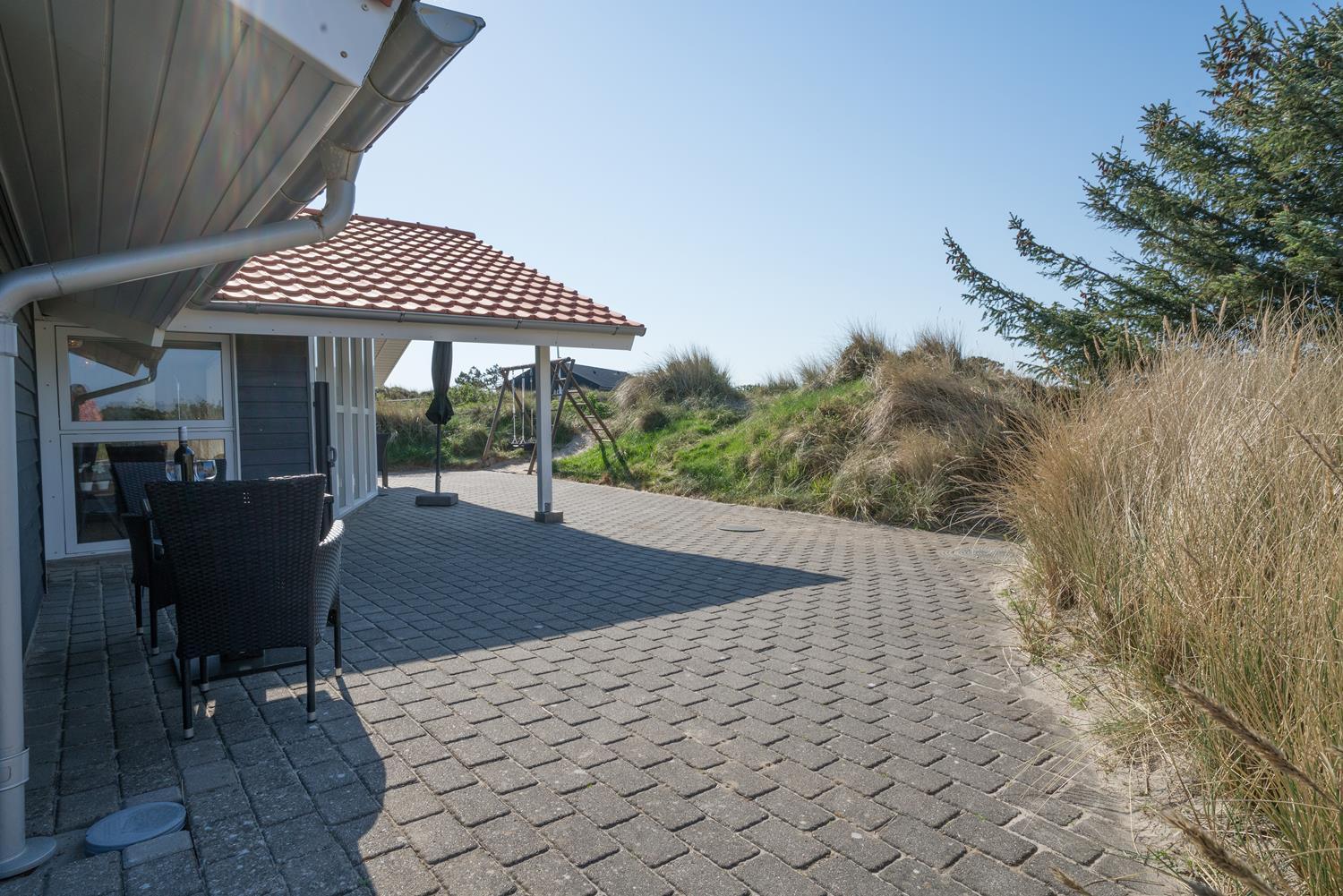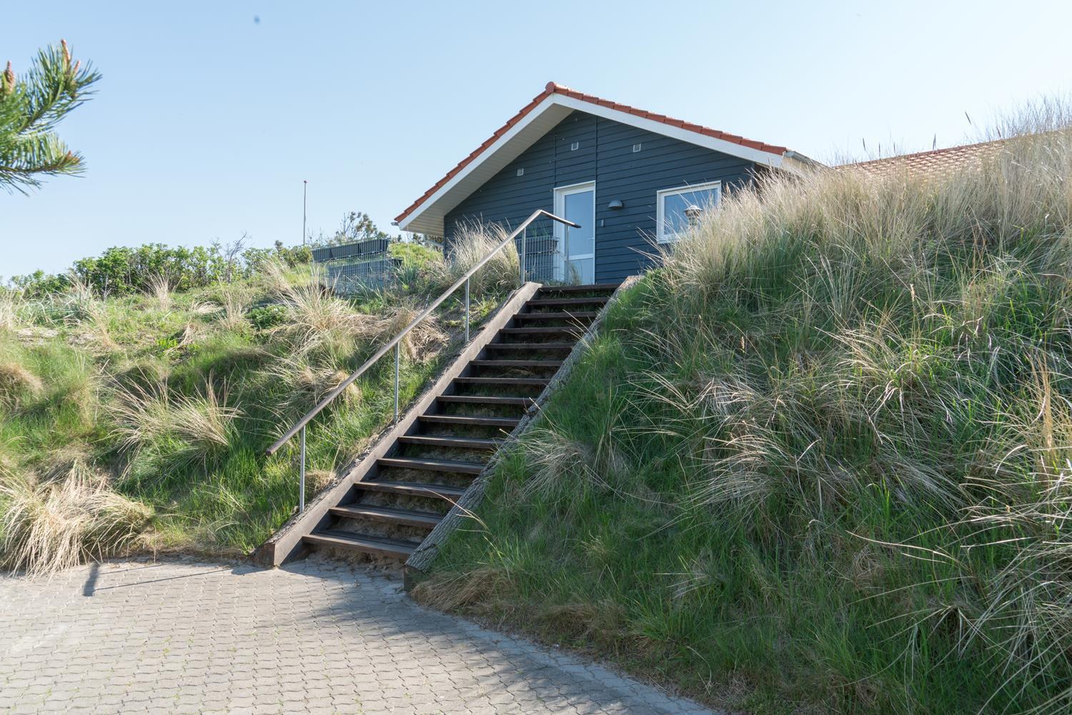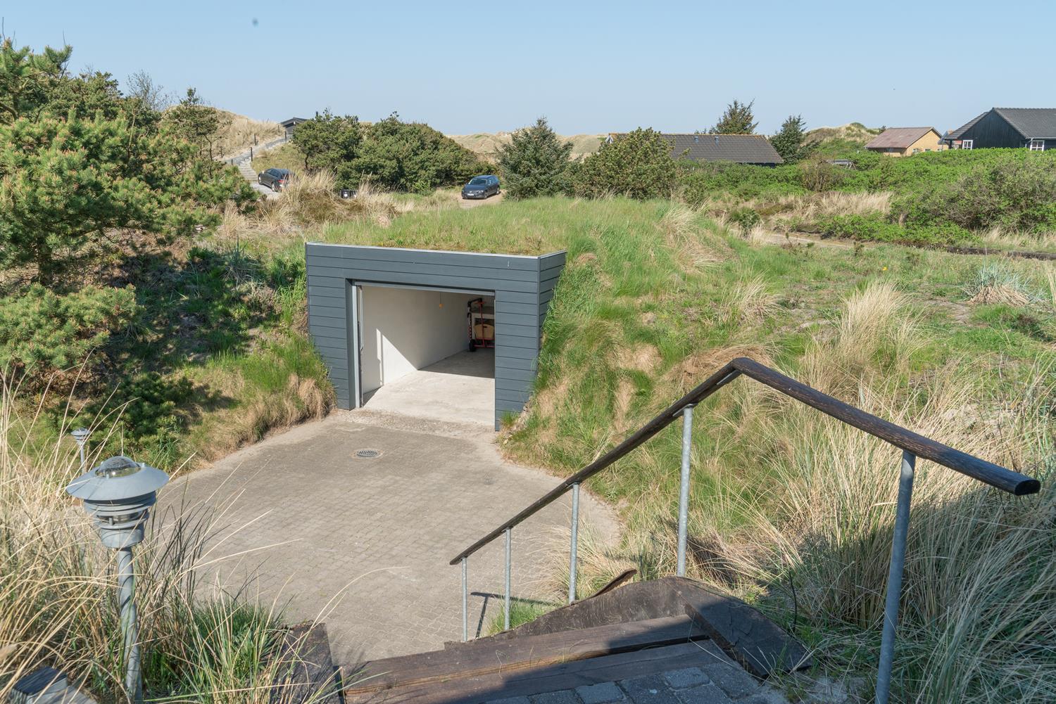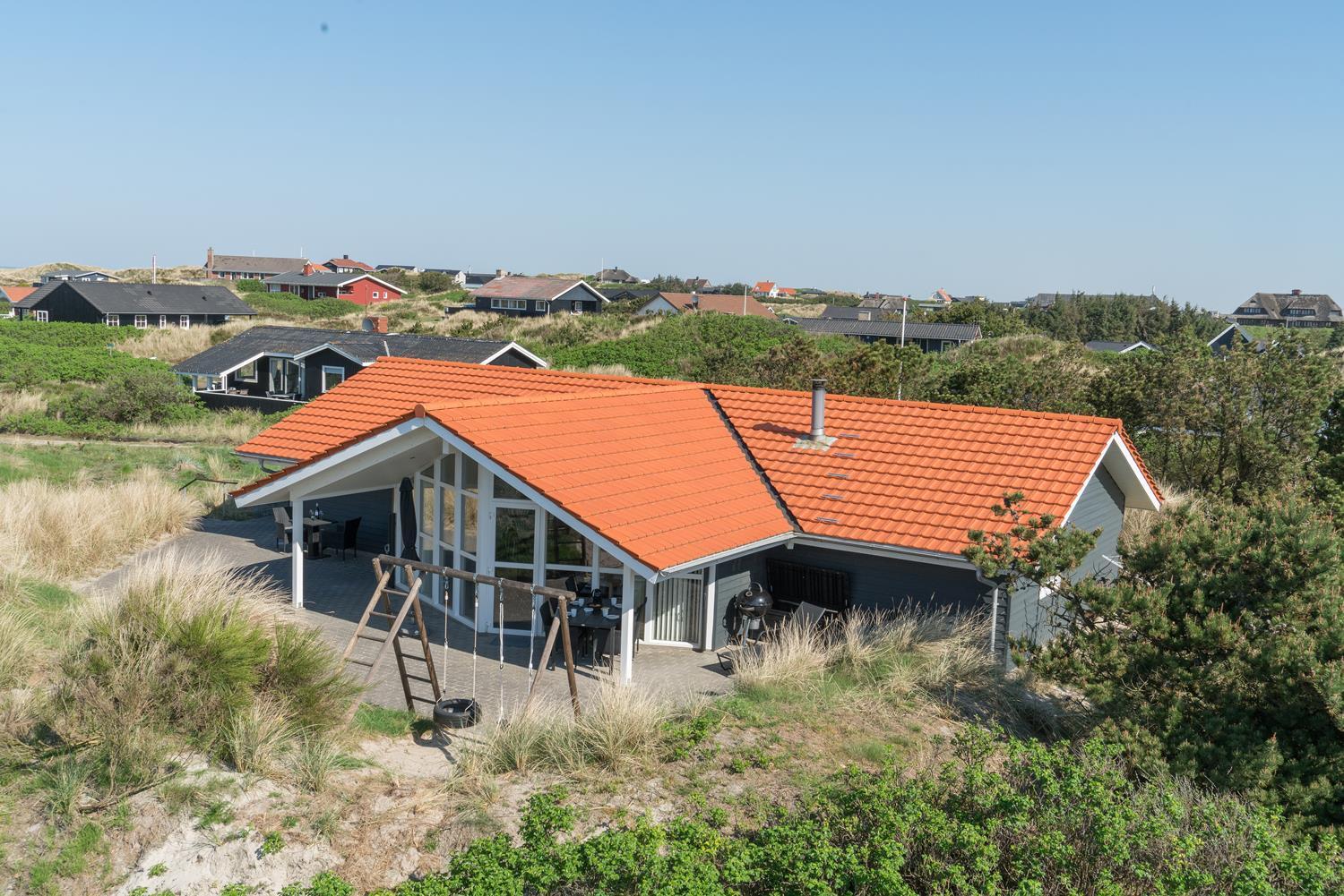 Velholdt feriehus i Henne Strand med sauna, spa, og flot udsigt fra terrasse på kuperet klitgrund.