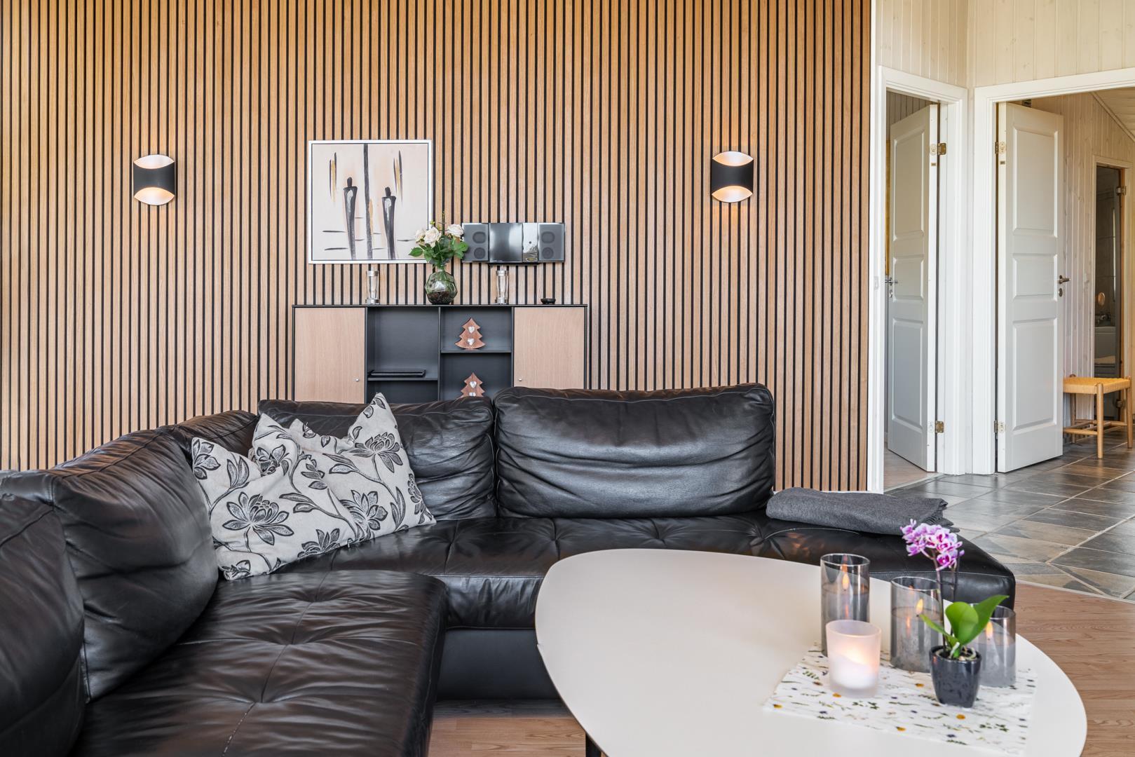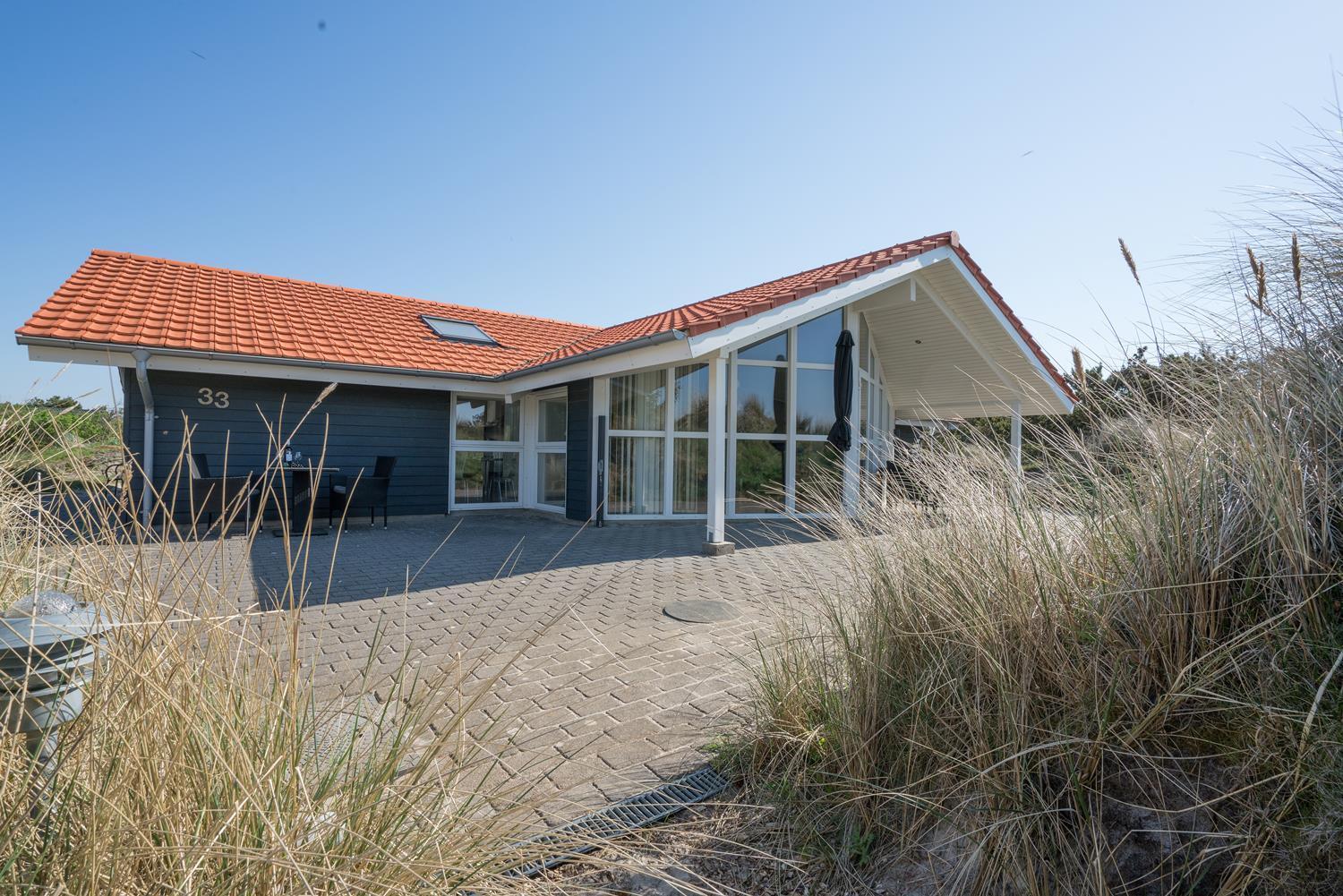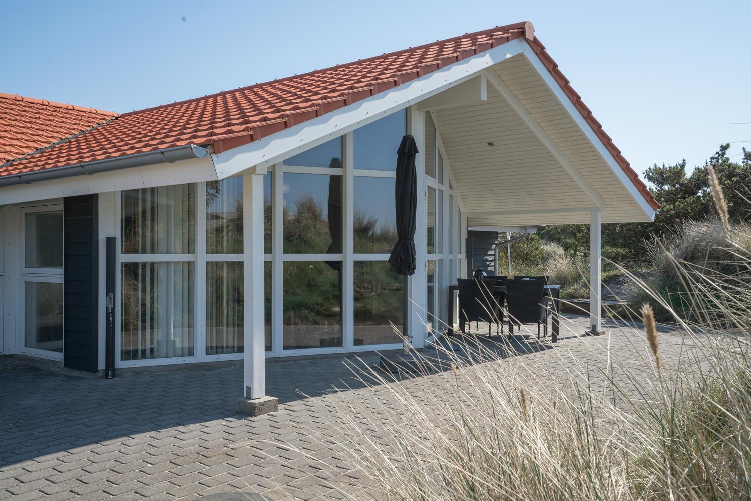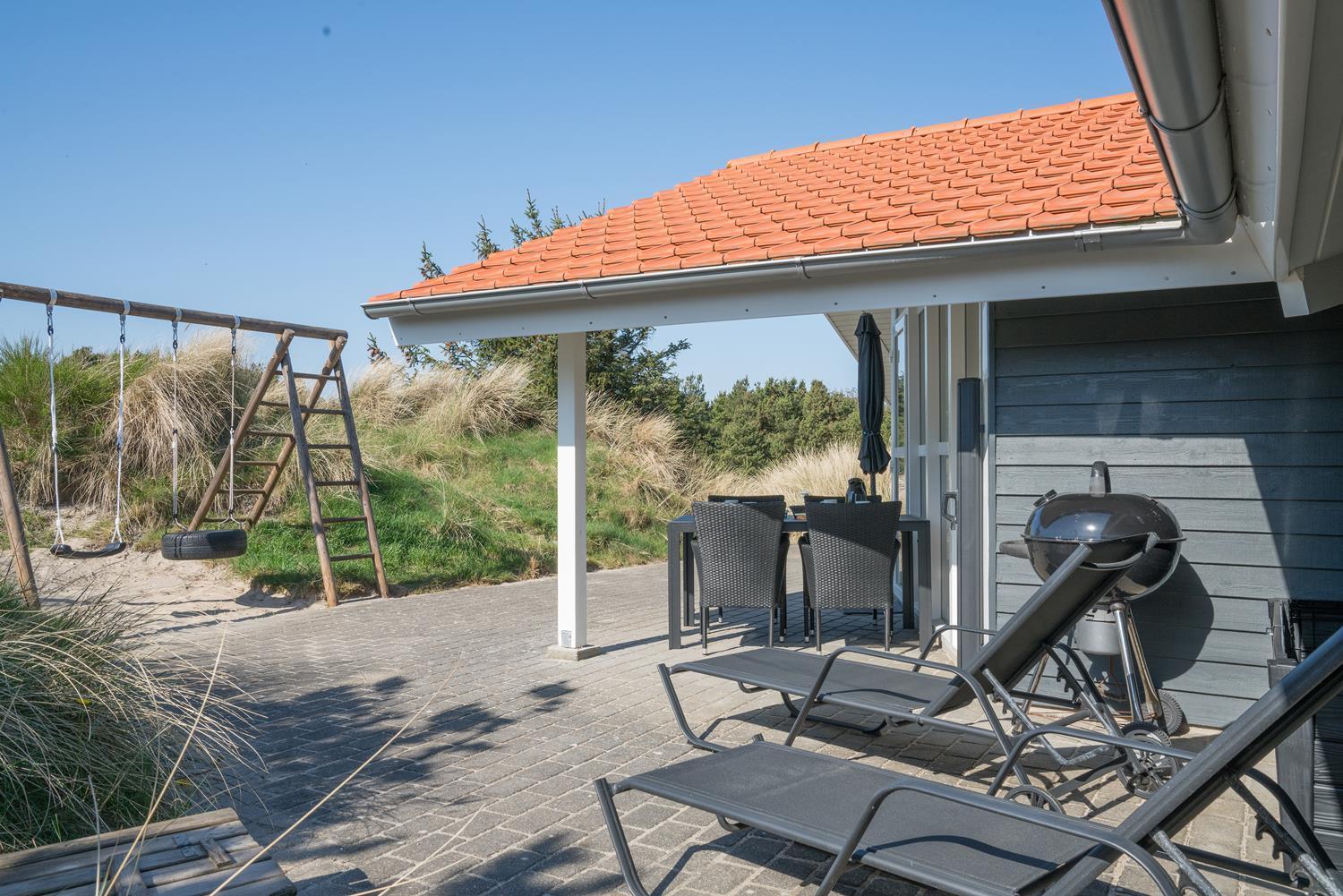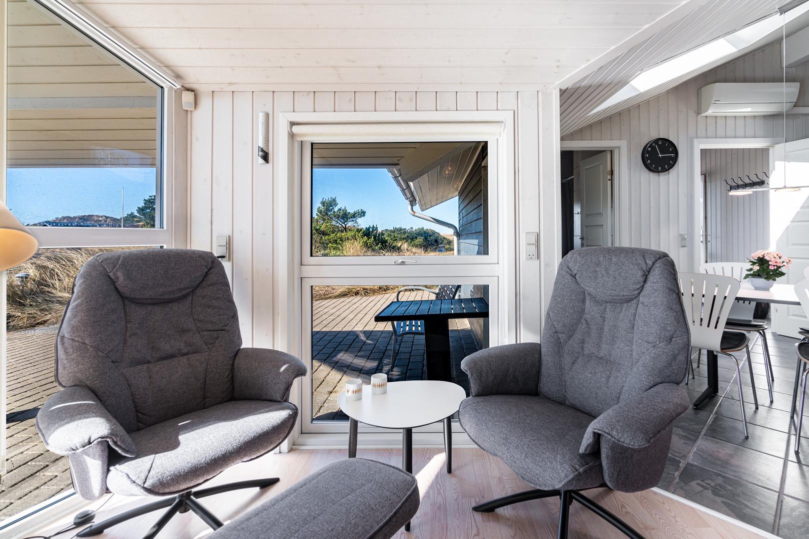 Velholdt feriehus i Henne Strand med sauna, spa, og flot udsigt fra terrasse på kuperet klitgrund.