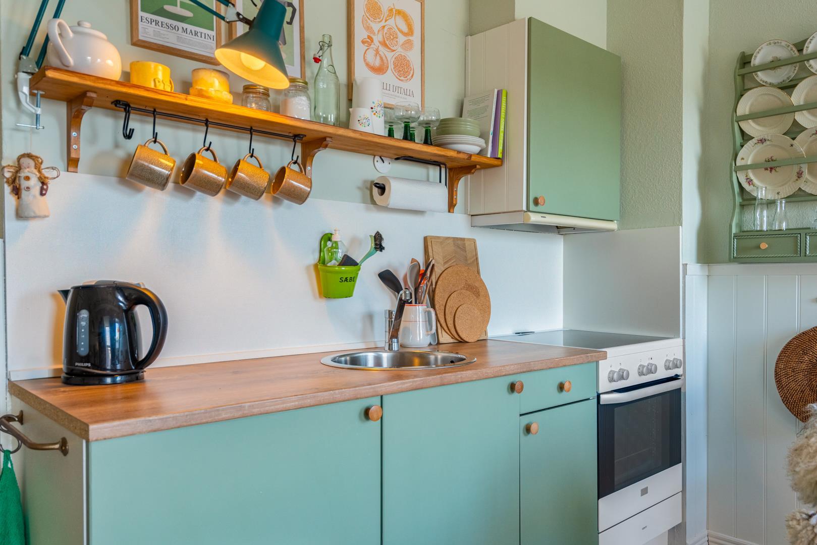 Et lille men vedudstyret køkken gør det let at lave hyggelige måltider. Badeværelset har bruser, toilet, vaskemaskine og tørretumbler, hvilket gør lejligheden ideel til både korte og længere ophold i Henne Strand.