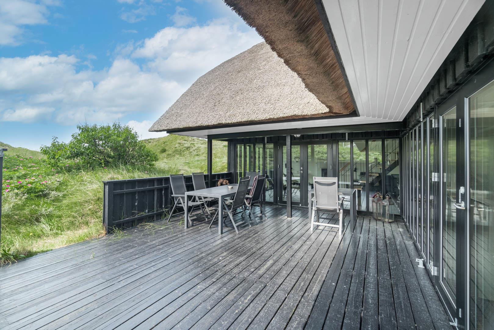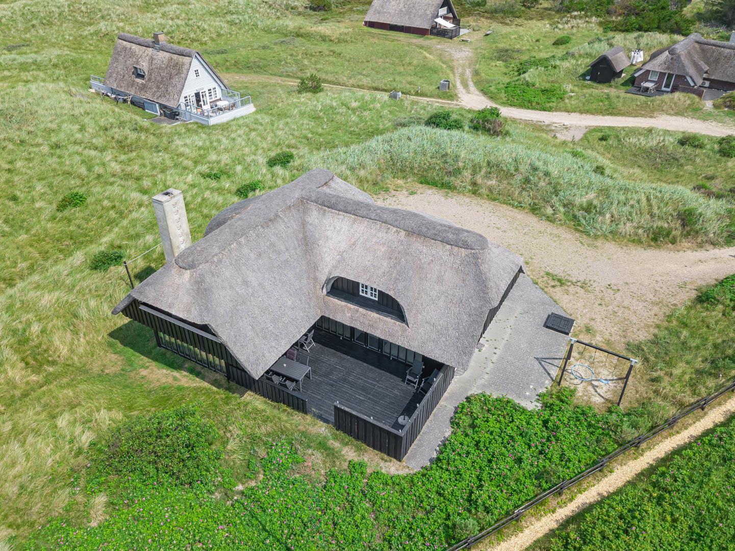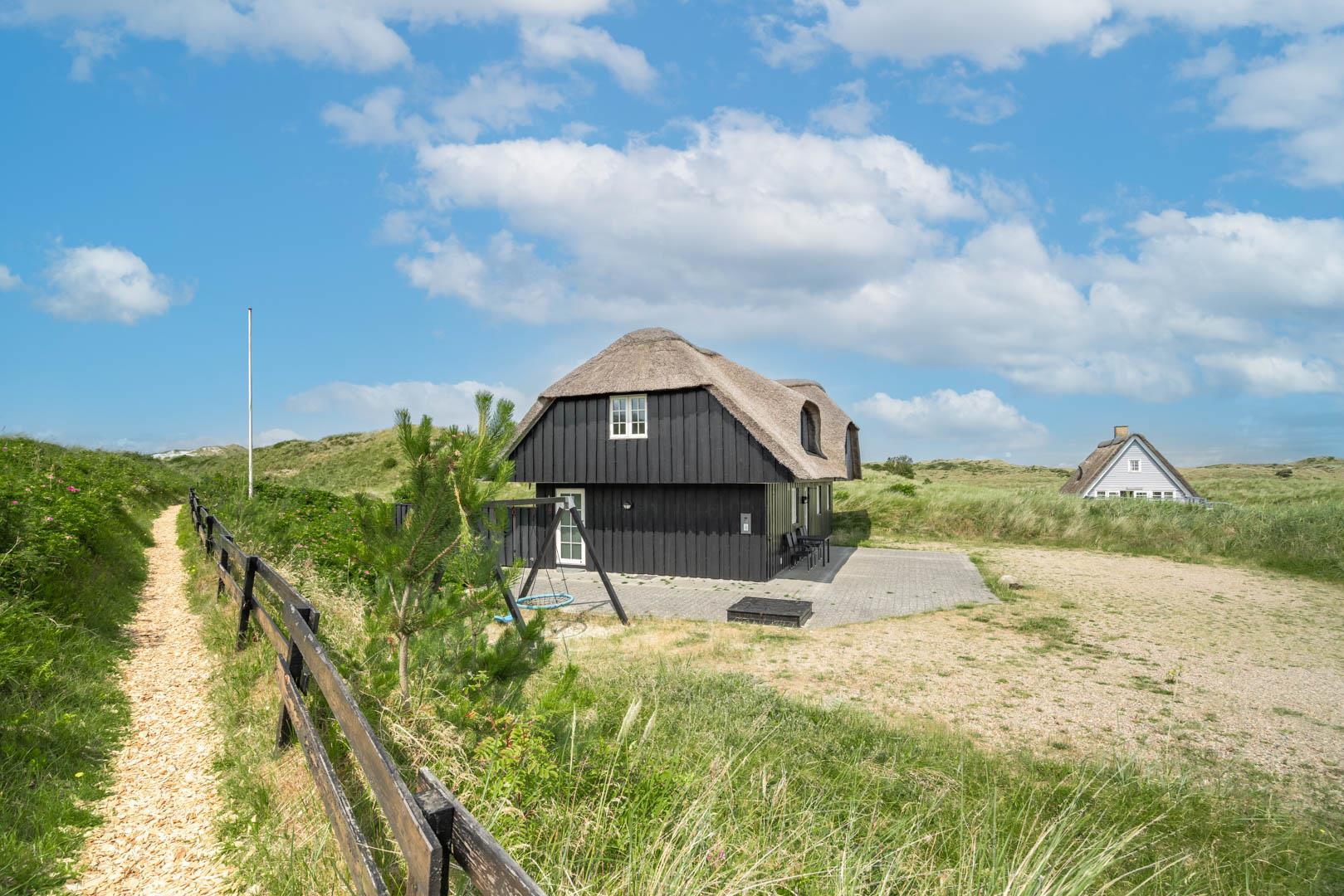 Sommerhusets charmerende ydre med stråtag, sortmalet træbeklædning og hvide sprossevinduer er som en lille reminder om en tid, hvor alt var mere simpelt, hvor himlen var mere blå og solen skinnede hele sommeren. Og det føles næsten også som en mere simpel tid, når man er på ferie her, for naturens rolige lyde, og den måde marehalmen vajer i vinden på, udenfor de store panoramavinduer, gør, at man automatisk sænker skuldrene og slipper hverdagens travlhed og bekymringer.