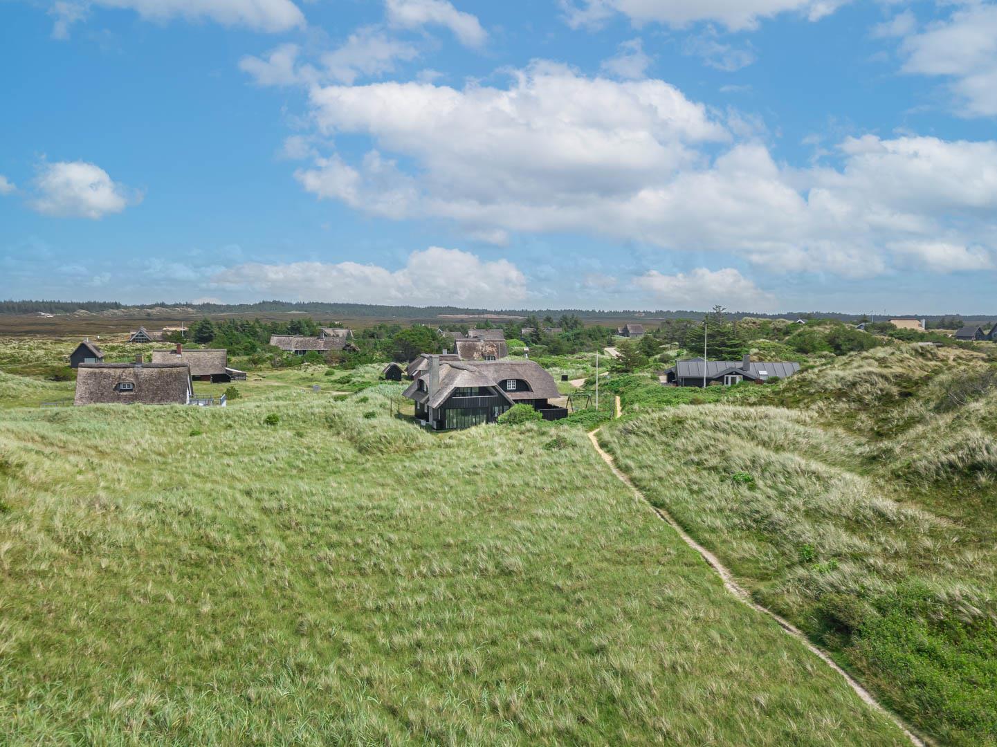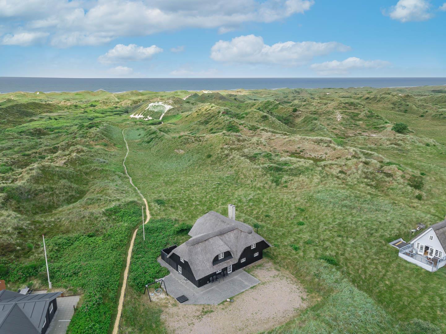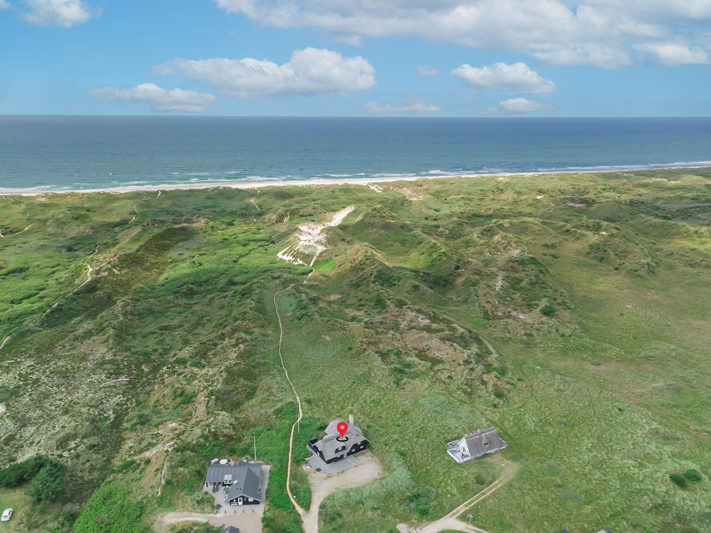 Nord for feriehuset strækker den enestående, uspolerede natur sig hele vejen op til Bjerregård ved Hvide Sande du kan faktisk gå langs stranden eller på naturstierne i omtrent tre timer, før du rammer den næste bebyggelse. Østpå ligger Blåbjerg Plantage og mod vest har du Hennes brede sandstrand indenfor ti minutters slentretur gennem ugeneret natur. Endelig ligger den stemningsfulde ferieby Henne med forretninger og spisesteder blot halvanden kilometer syd for huset.