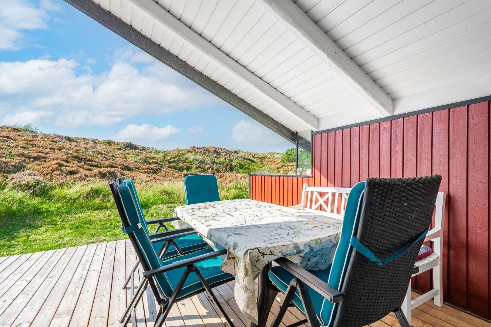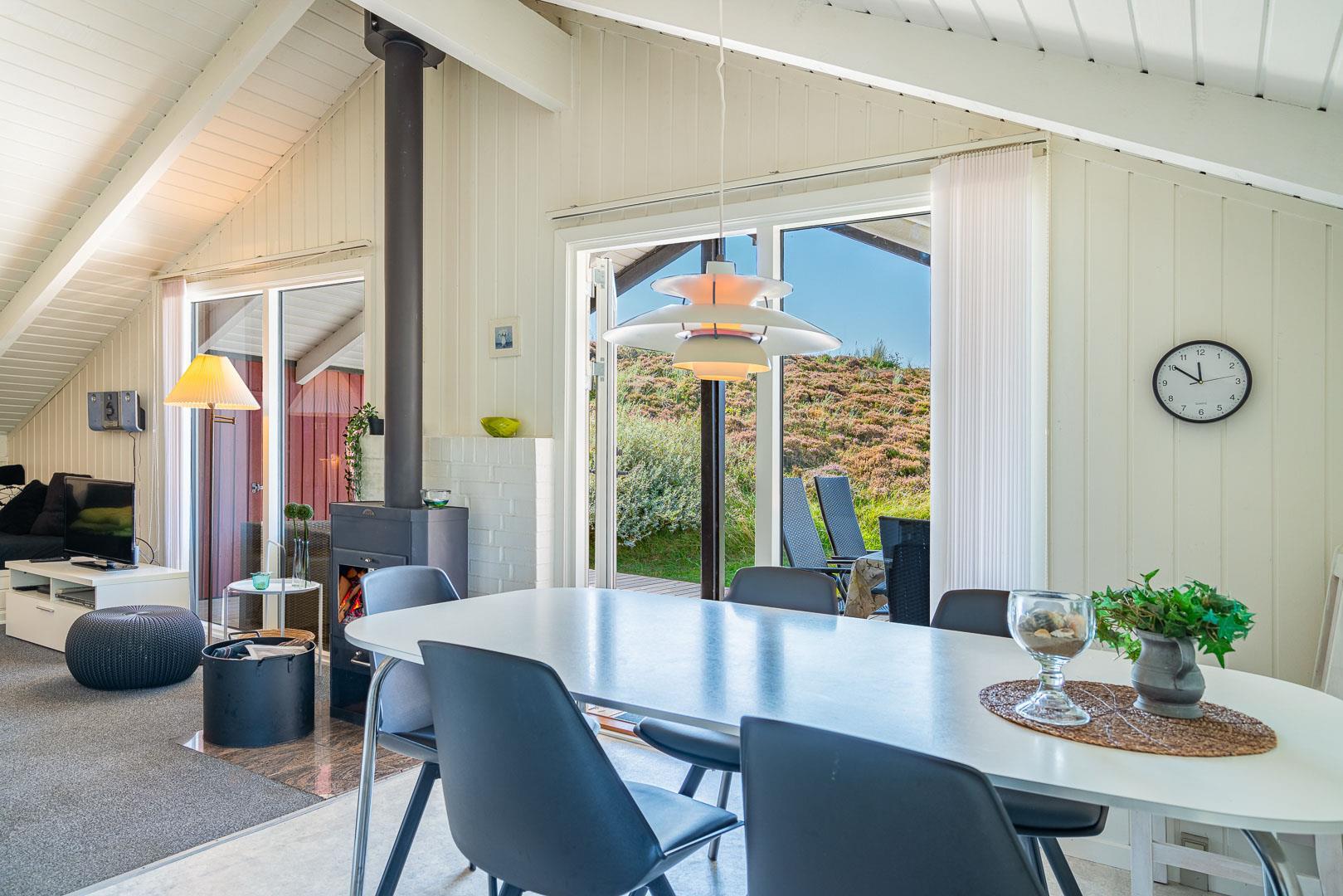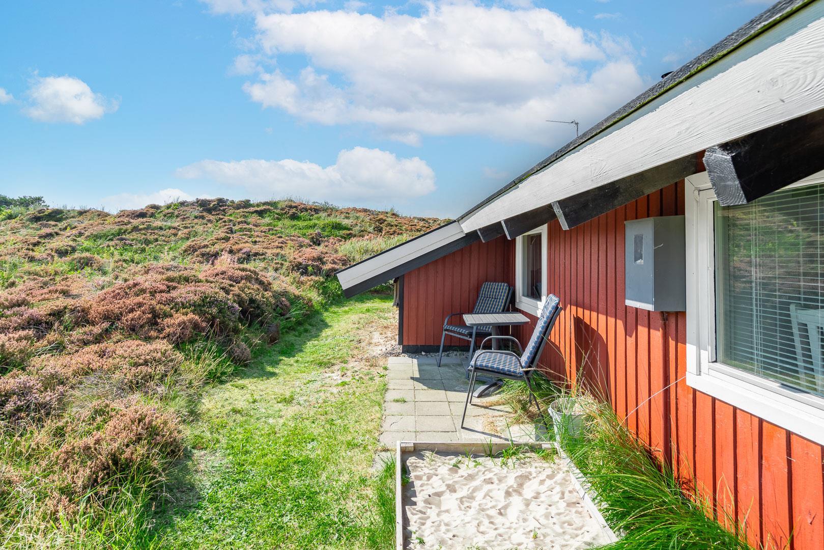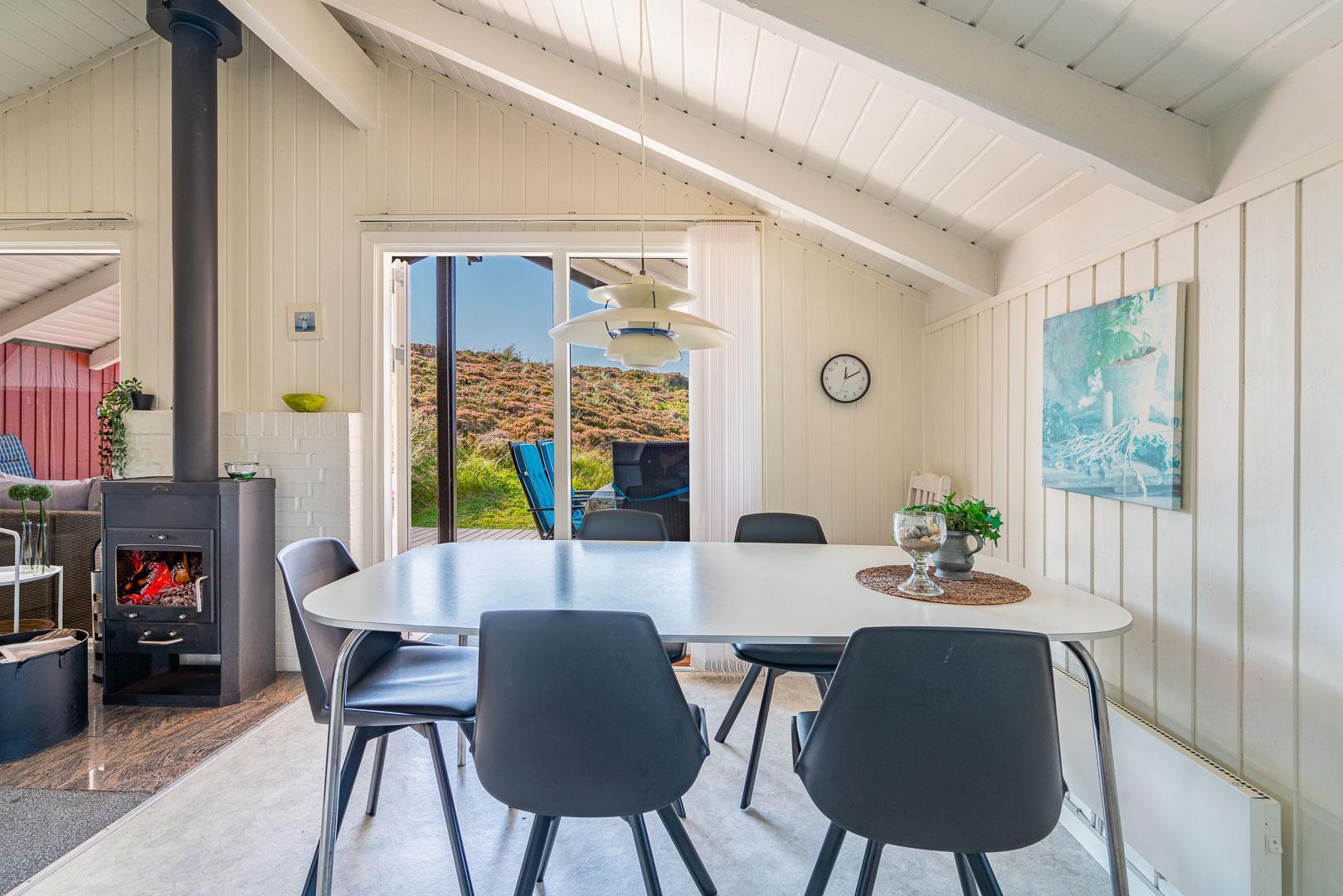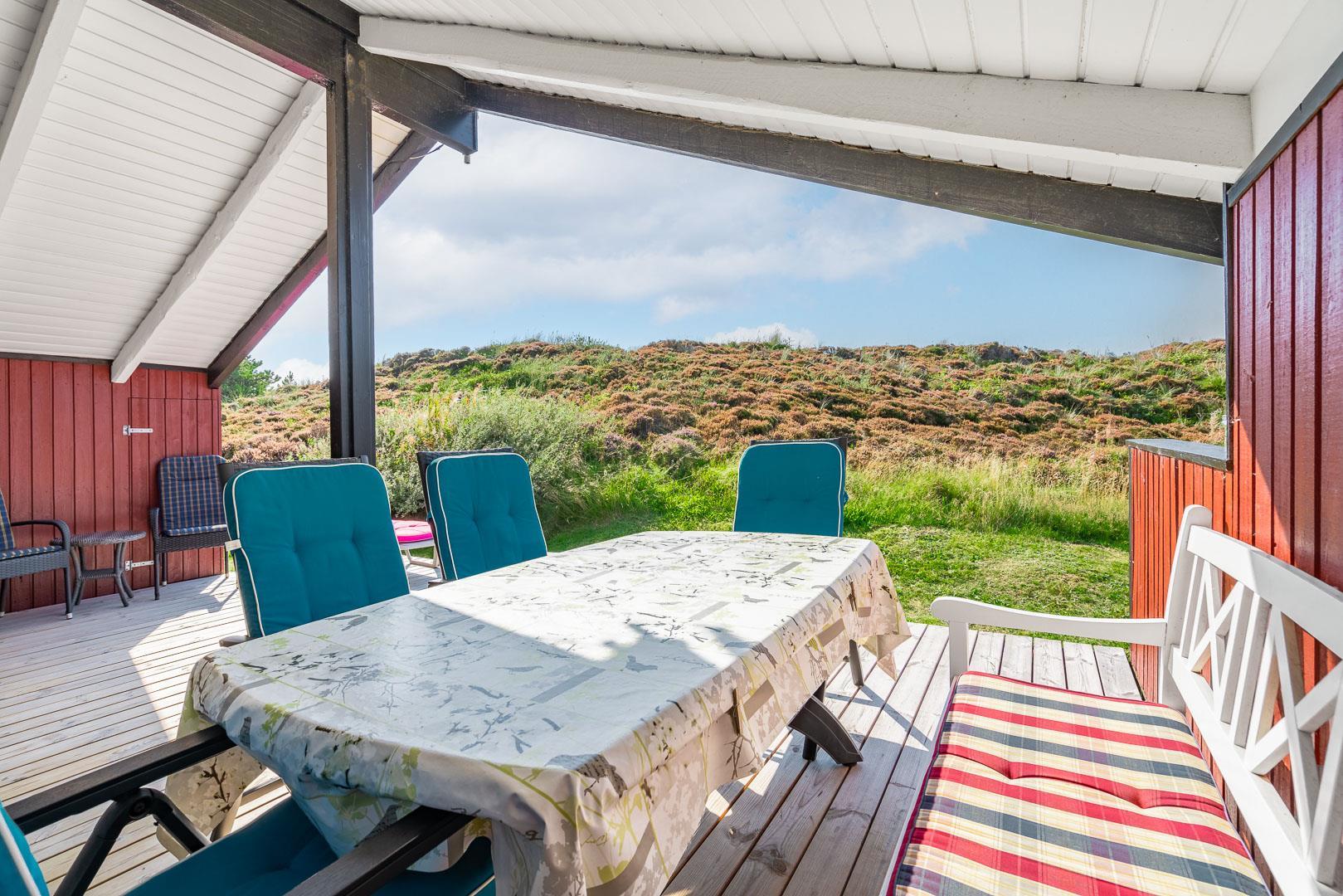 Dette velpassede feriehus med dejlig badeværelse, er beliggende på en kuperet klitgrund. Kombineret køkken -spisekrog og hyggelig stue med loft til kip og brændeovn, og som er indrettet med pæne og gode møbler. Der er dejlige og ugeneret delvis overdækket træterrasse.