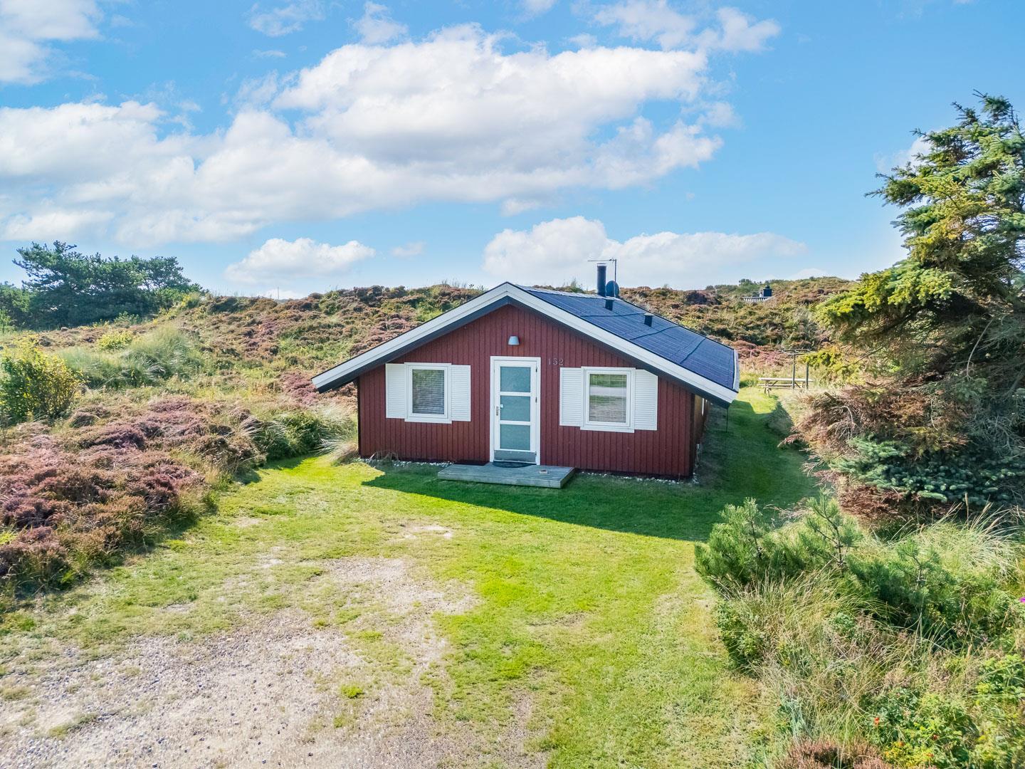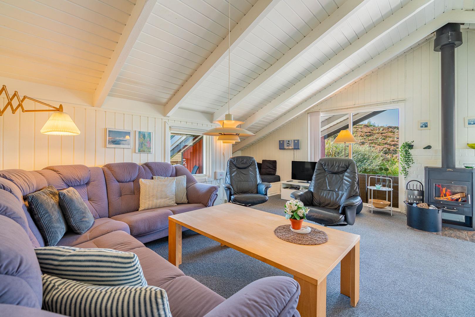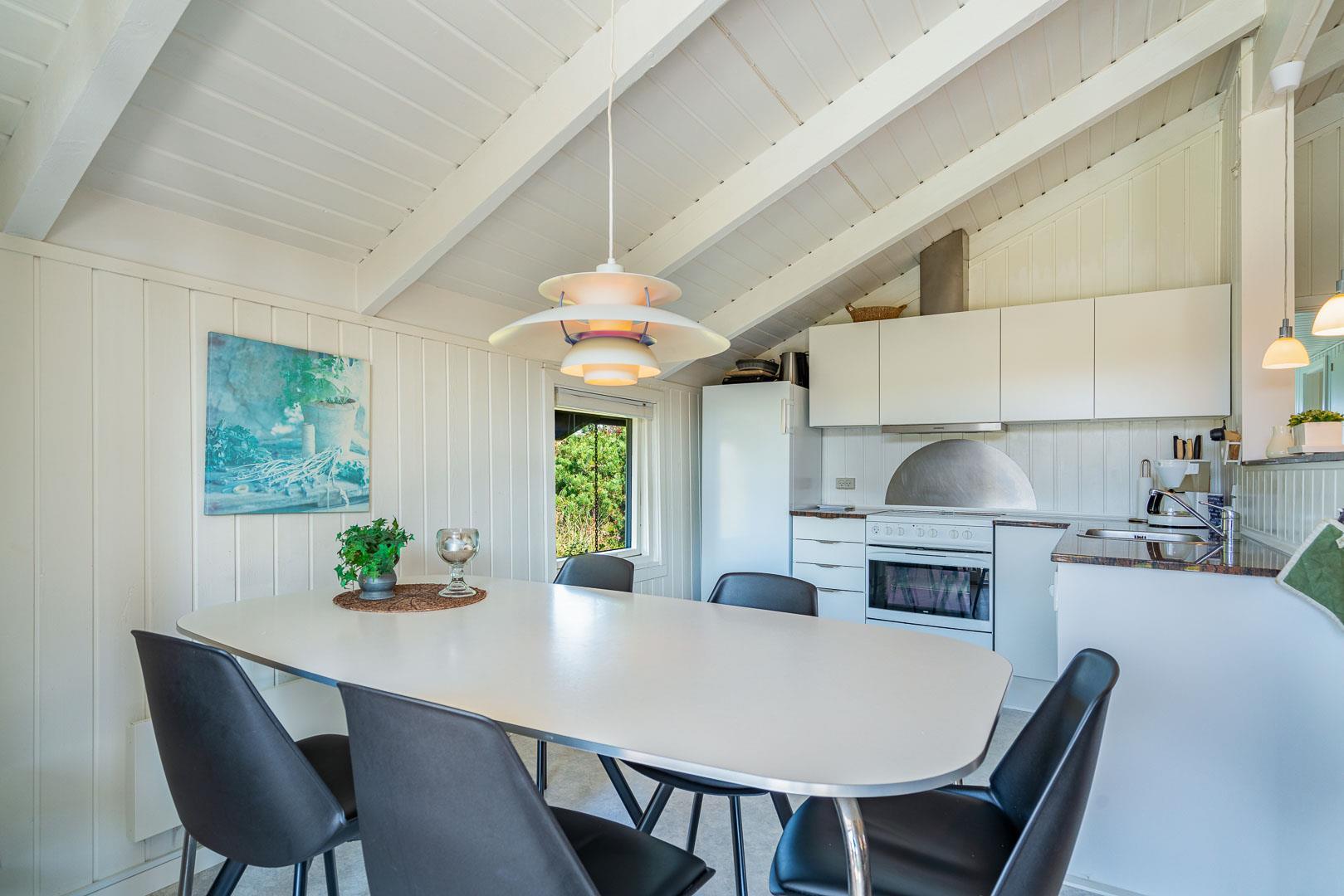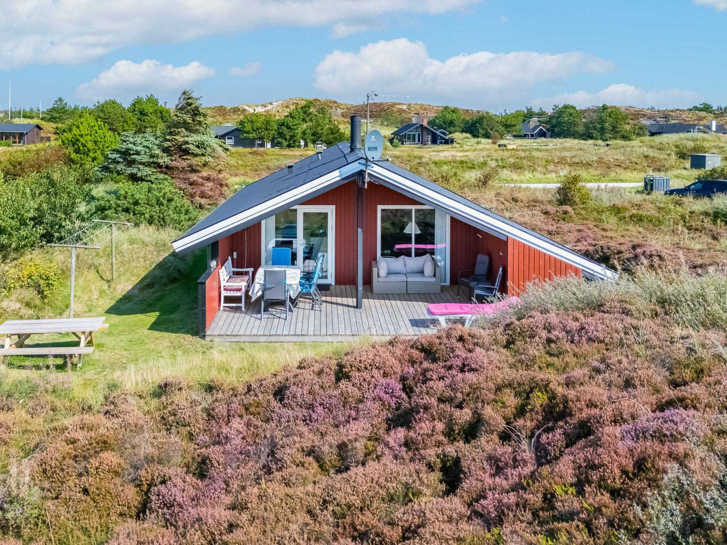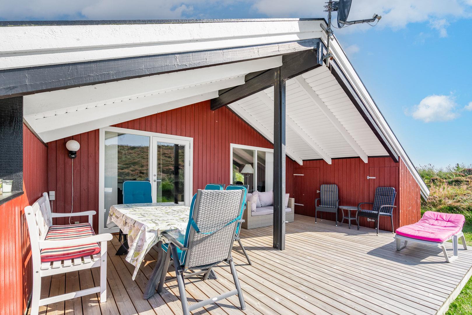 Dette velpassede feriehus med dejlig badeværelse, er beliggende på en kuperet klitgrund. Kombineret køkken -spisekrog og hyggelig stue med loft til kip og brændeovn, og som er indrettet med pæne og gode møbler. Der er dejlige og ugeneret delvis overdækket træterrasse.