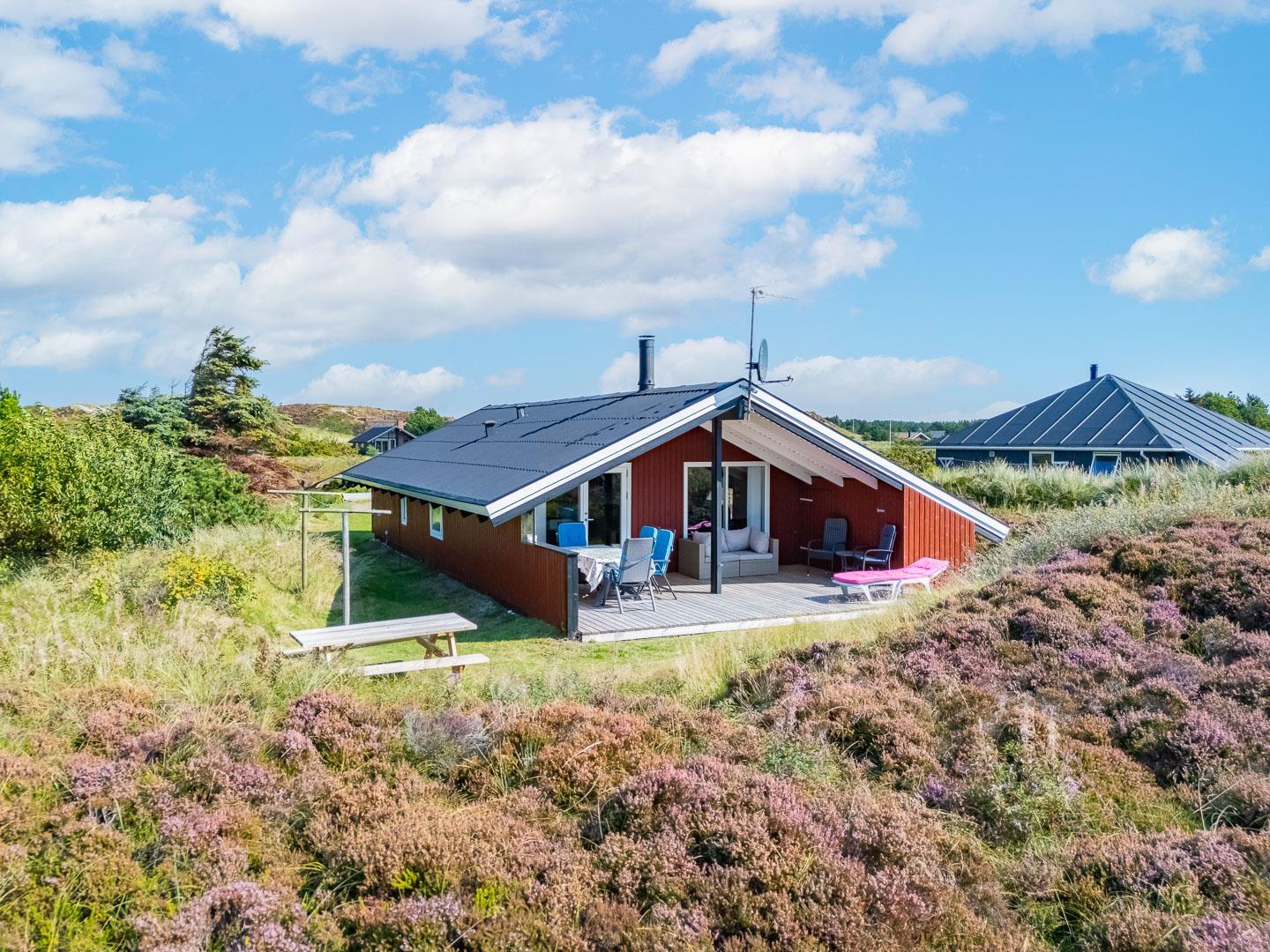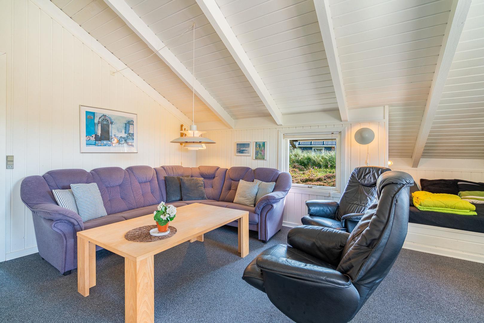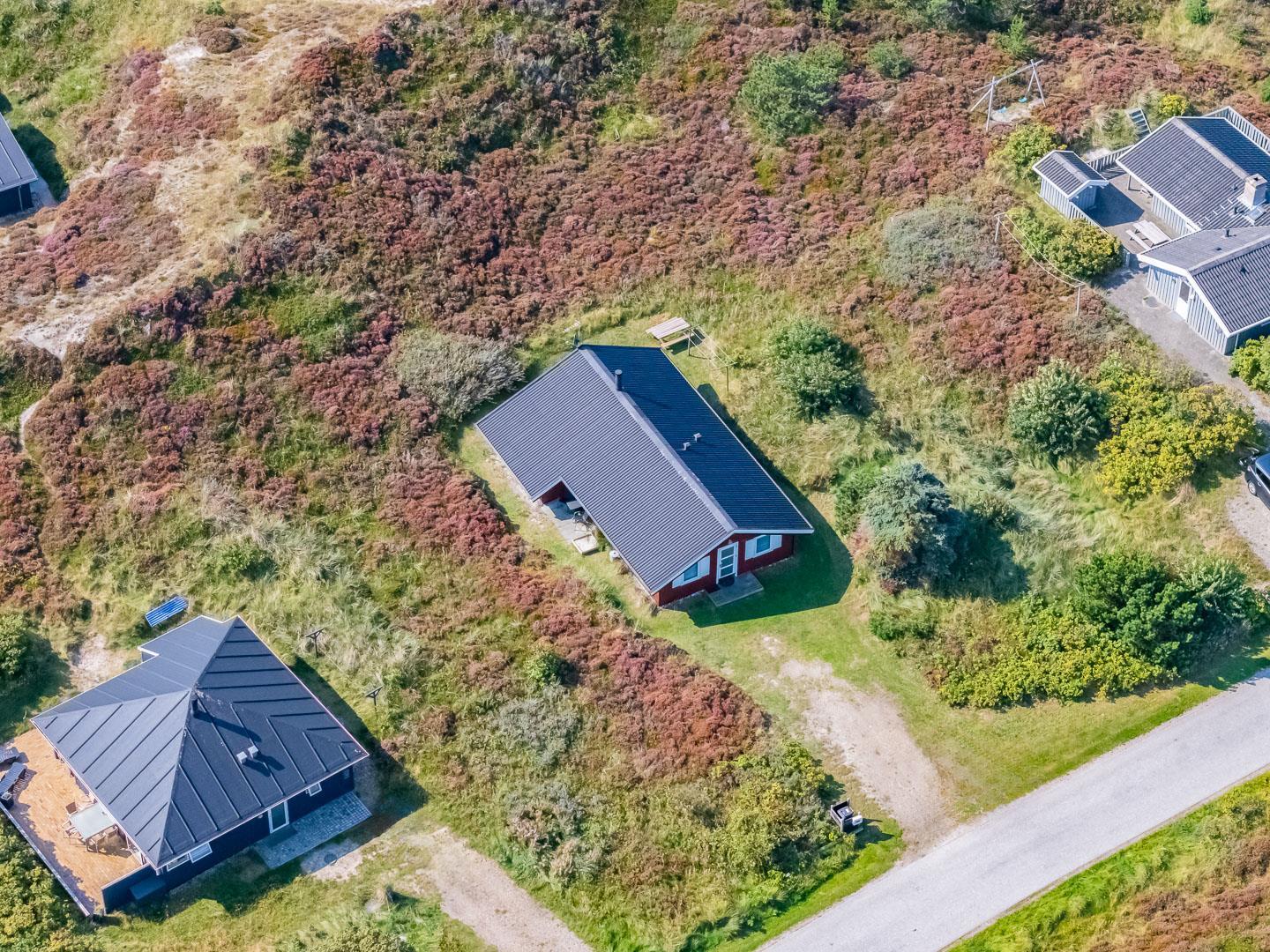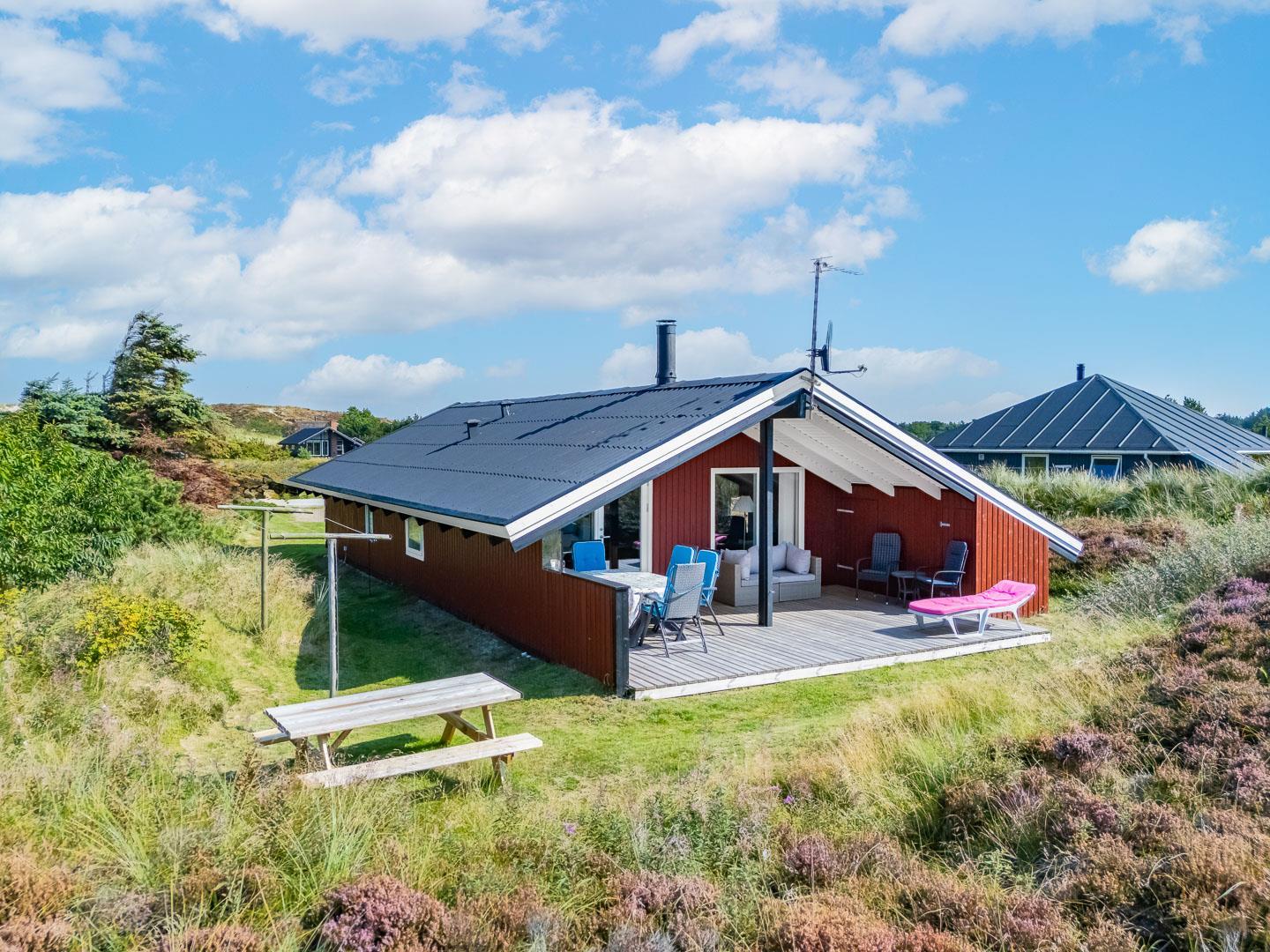 Dette velpassede feriehus med dejlig badeværelse, er beliggende på en kuperet klitgrund. Kombineret køkken -spisekrog og hyggelig stue med loft til kip og brændeovn, og som er indrettet med pæne og gode møbler. Der er dejlige og ugeneret delvis overdækket træterrasse.