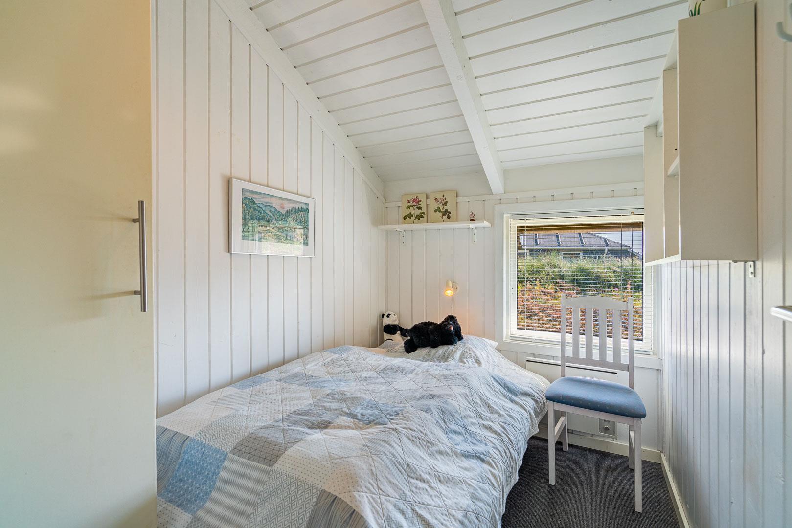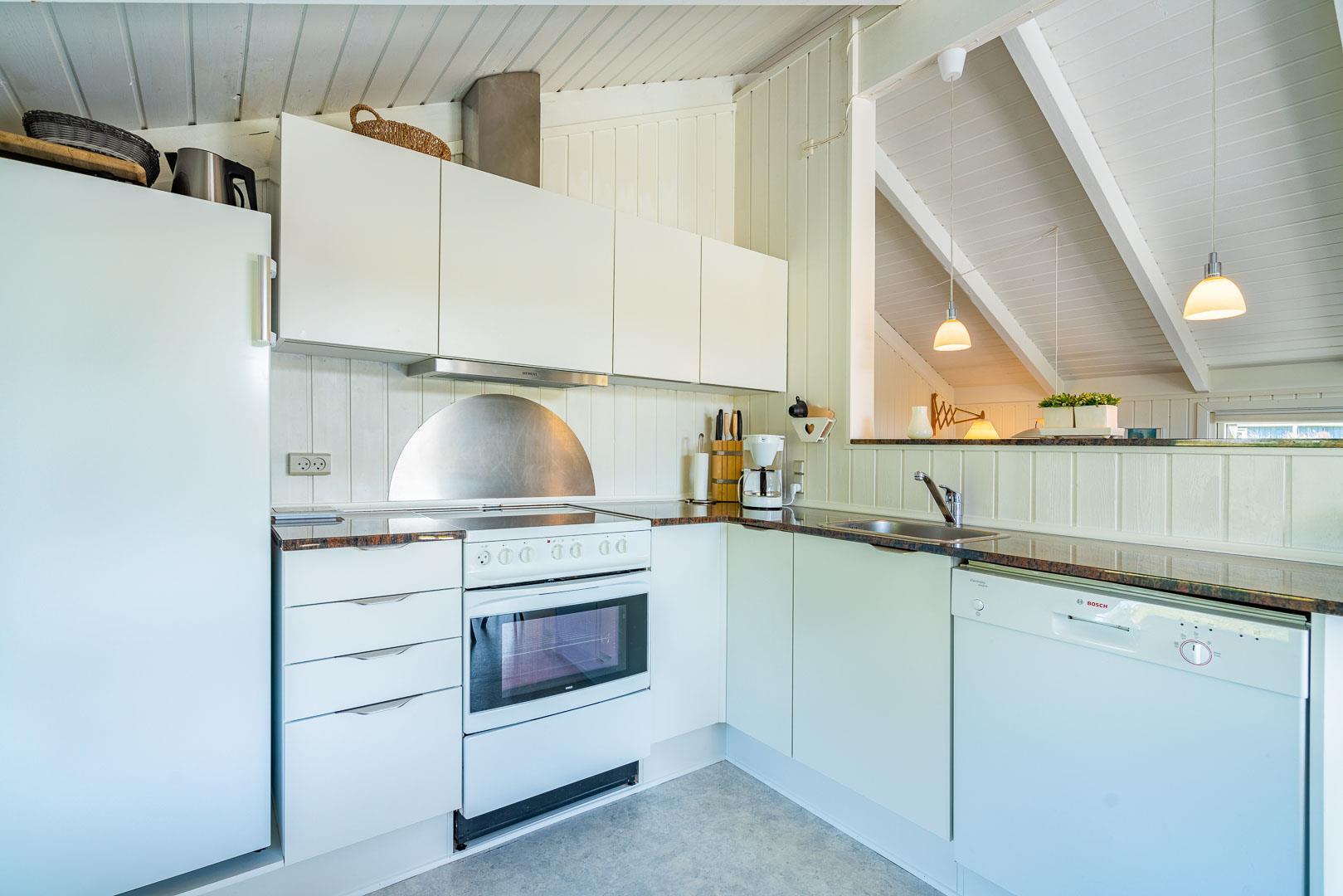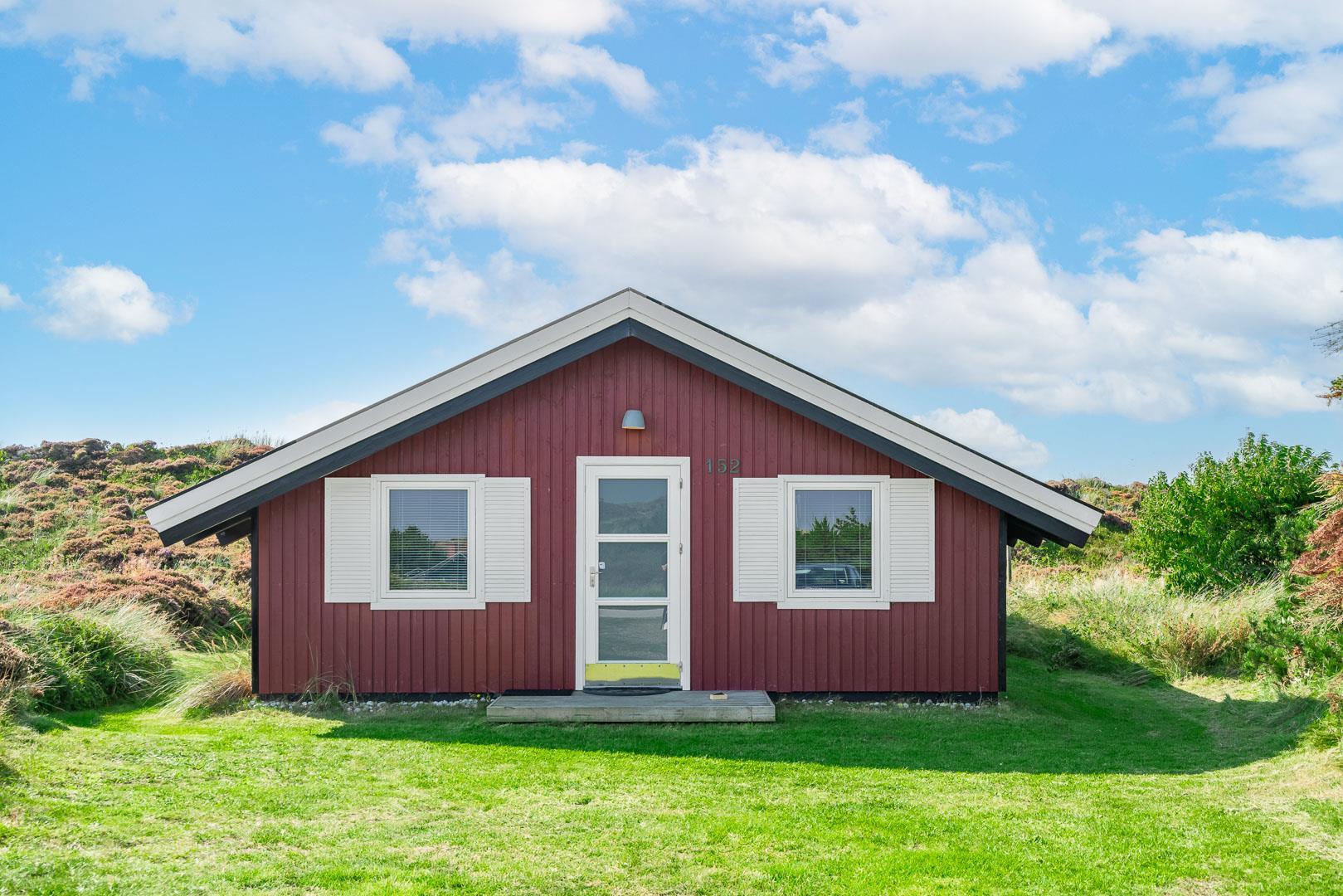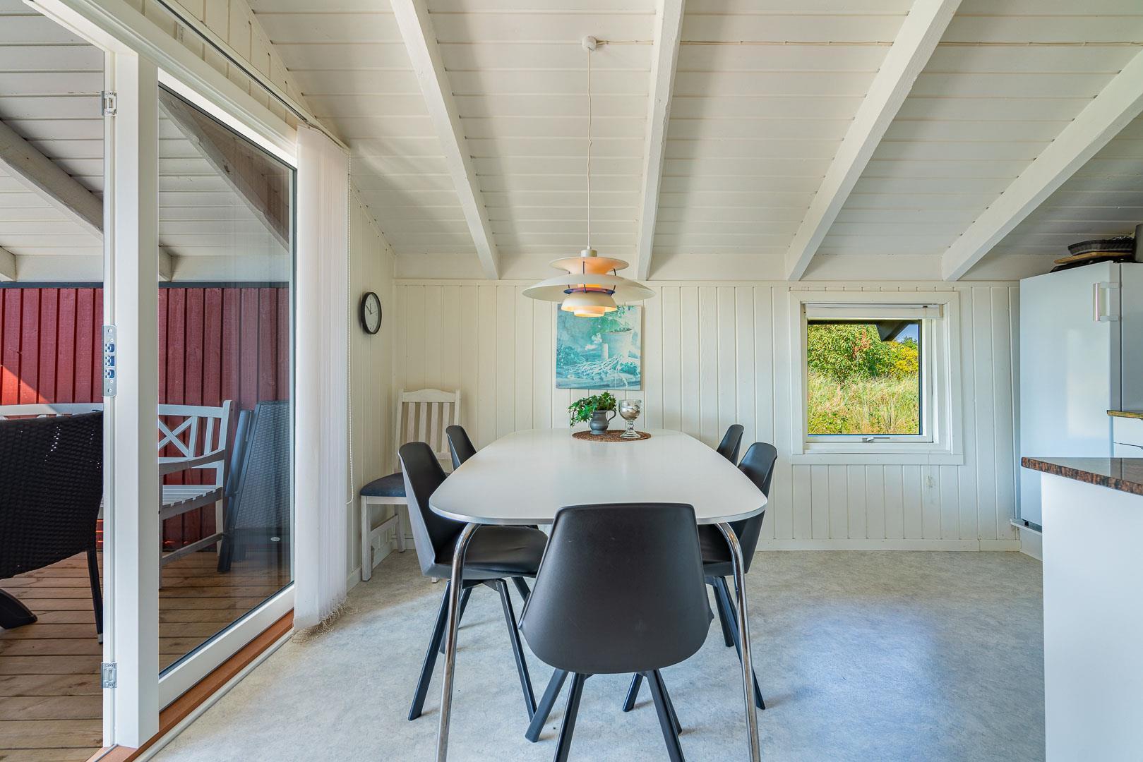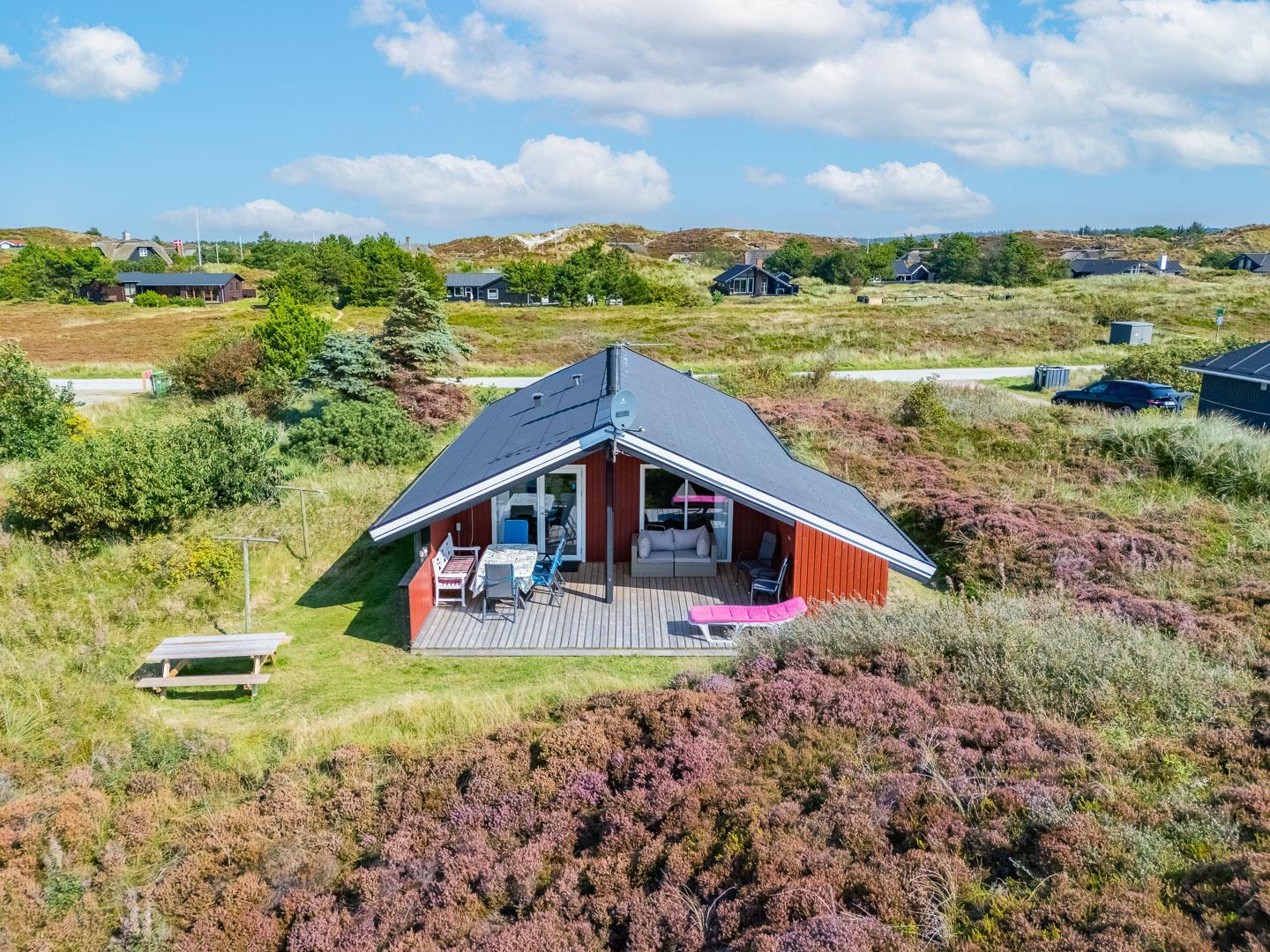 Dette velpassede feriehus med dejlig badeværelse, er beliggende på en kuperet klitgrund. Kombineret køkken -spisekrog og hyggelig stue med loft til kip og brændeovn, og som er indrettet med pæne og gode møbler. Der er dejlige og ugeneret delvis overdækket træterrasse.