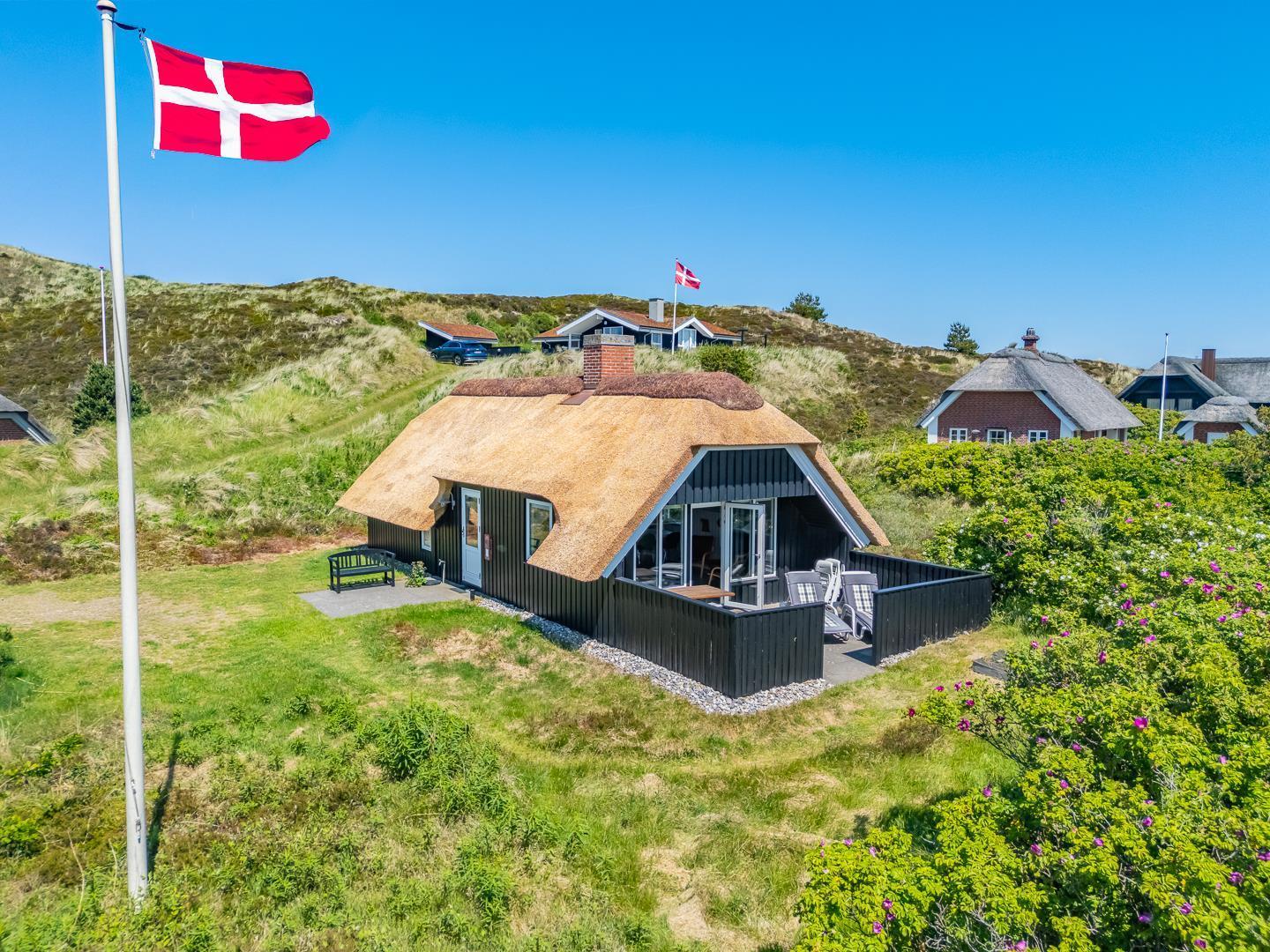 Hyggeligt og velholdt stråtækt feriehus nær Henne Strand med terrasse og brændeovn på stor klitgrund.