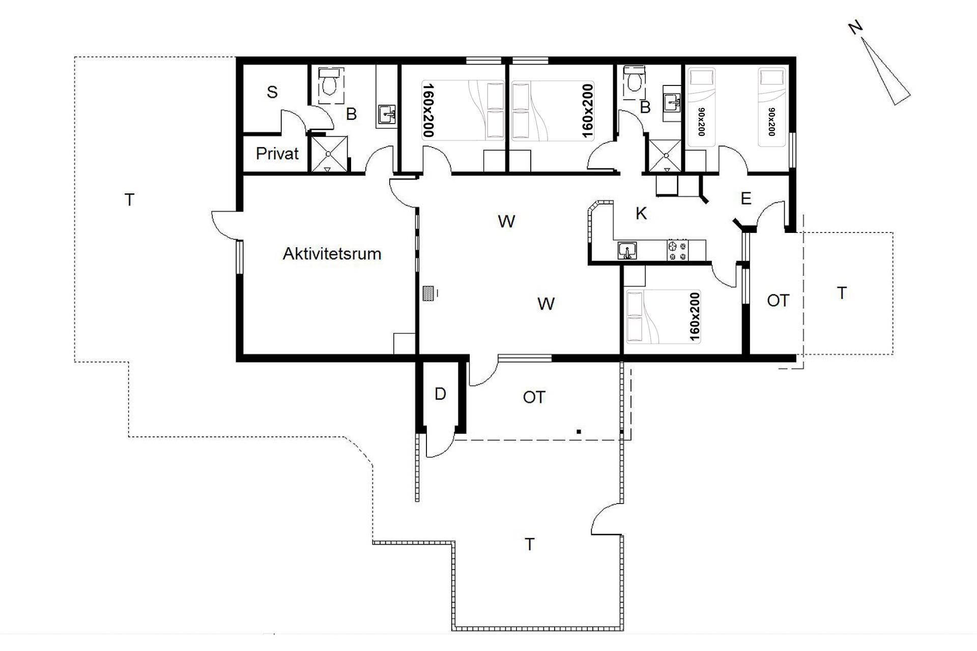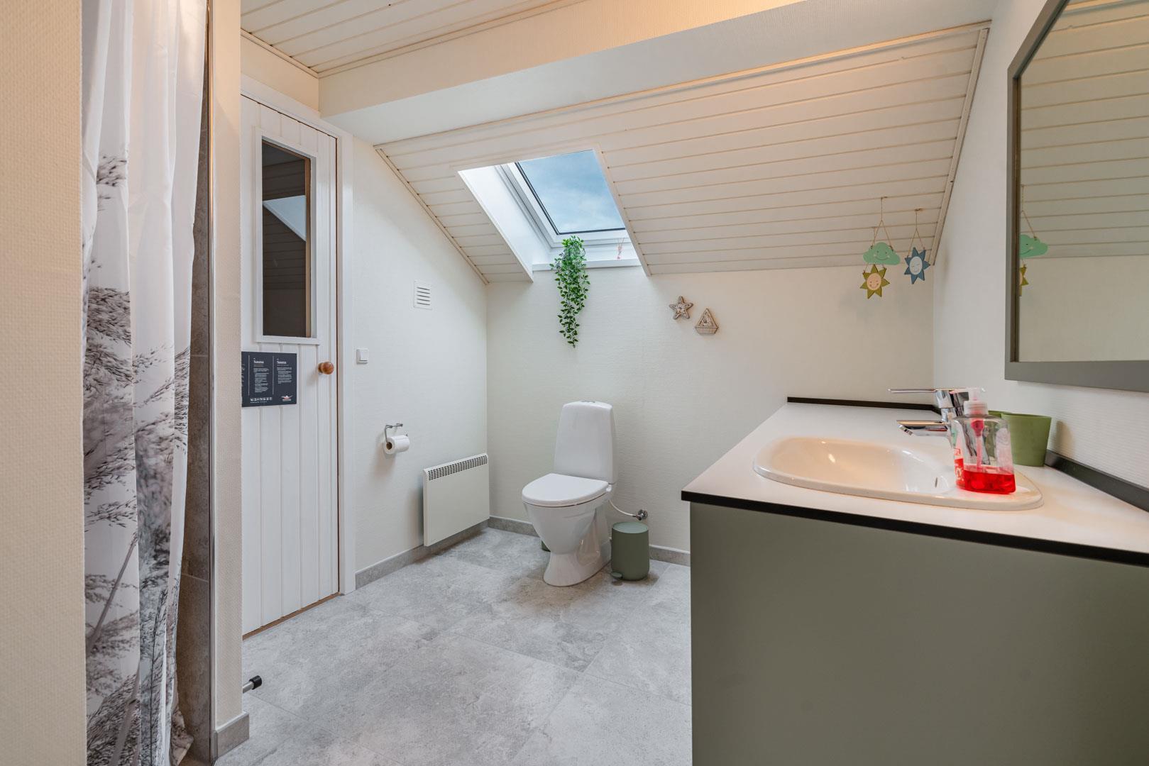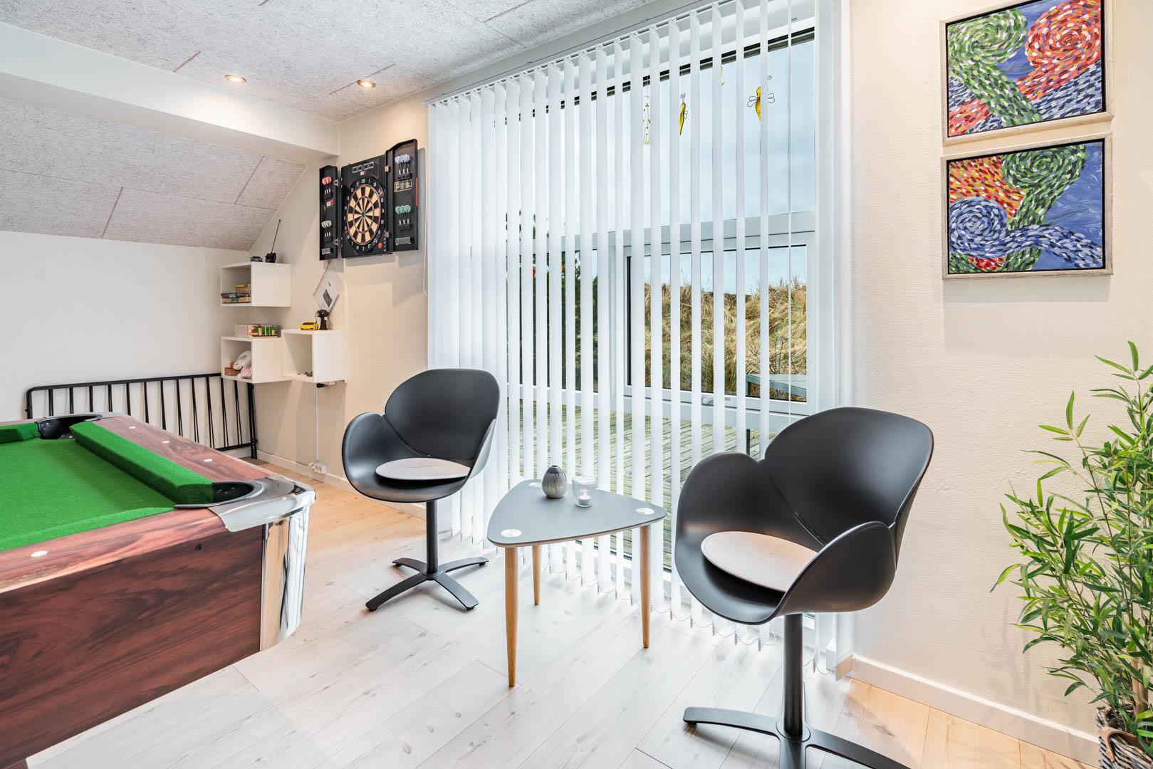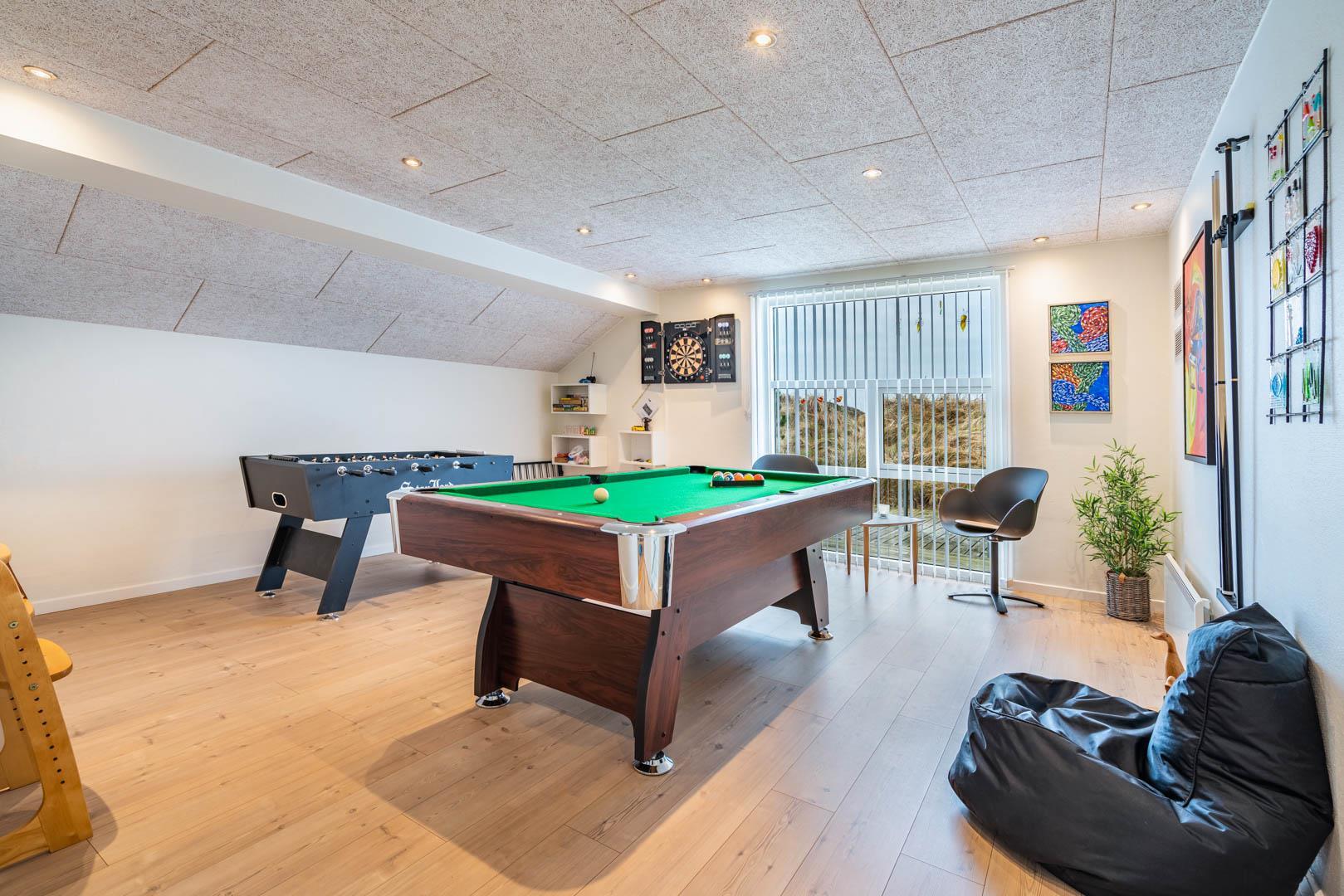 Et af husets højdepunkter er det rummelige aktivitetsrum, som er udstyret med billardbord, dart og bordfodbold. I direkte forbindelse findes et moderne badeværelse med sauna – ideelt til afslapning efter en aktiv dag. I den modsatte ende af huset er der et ekstra badeværelse med bruser – praktisk til familier eller mindre grupper.