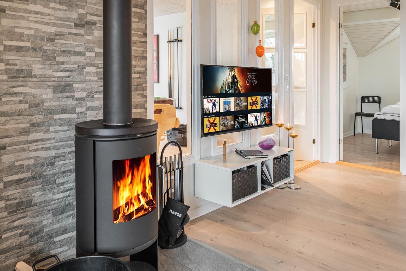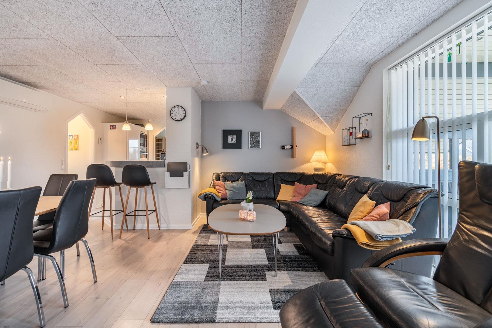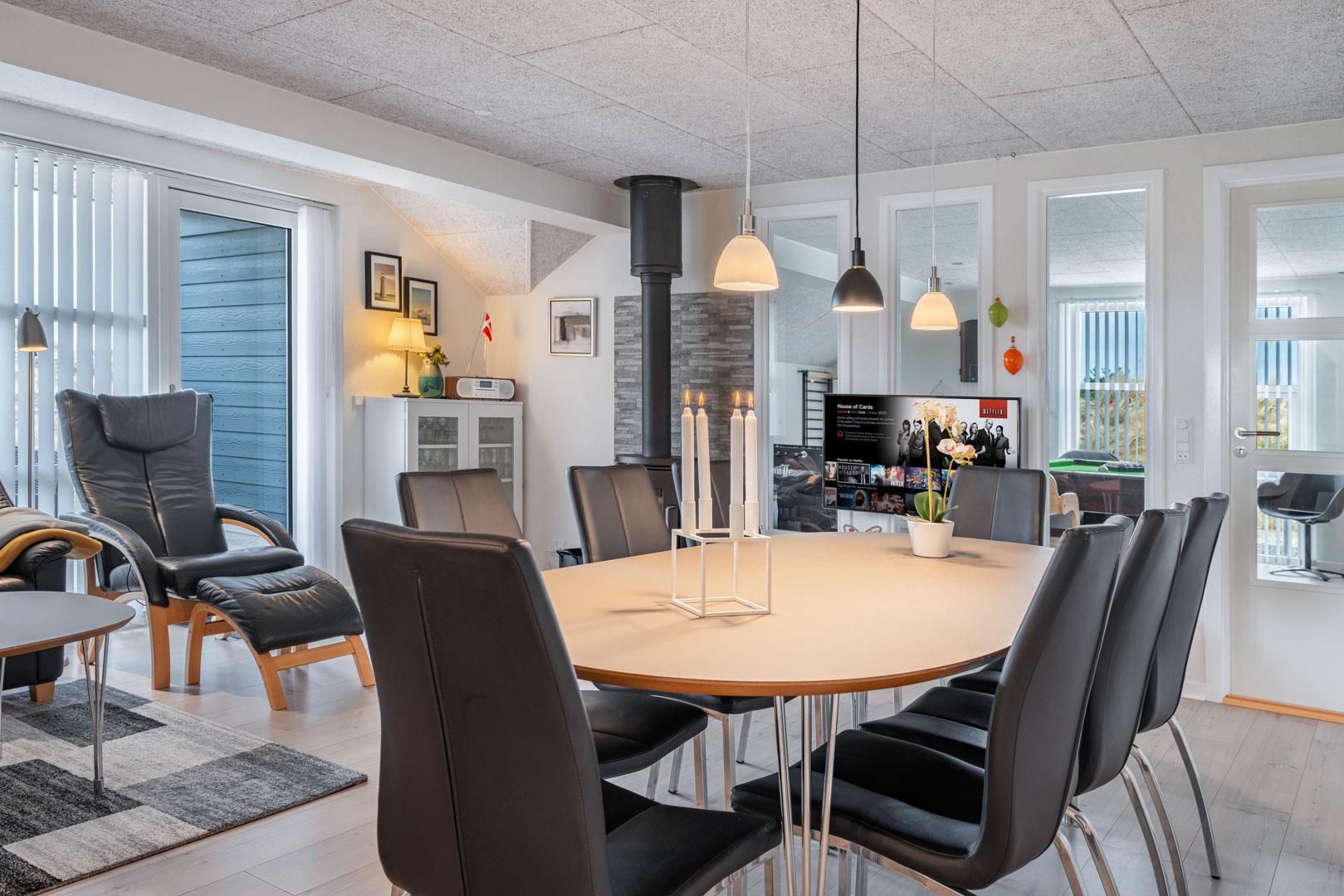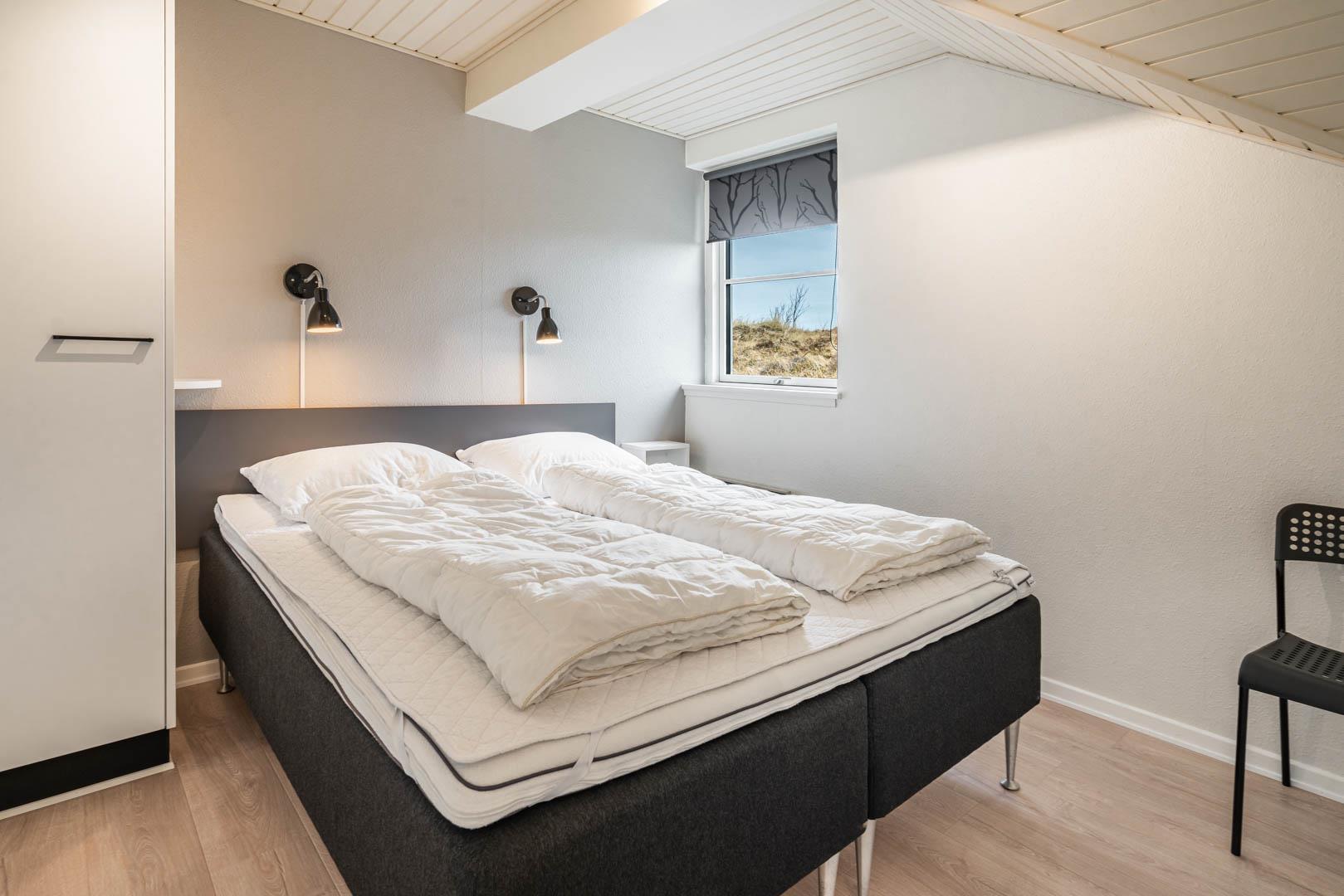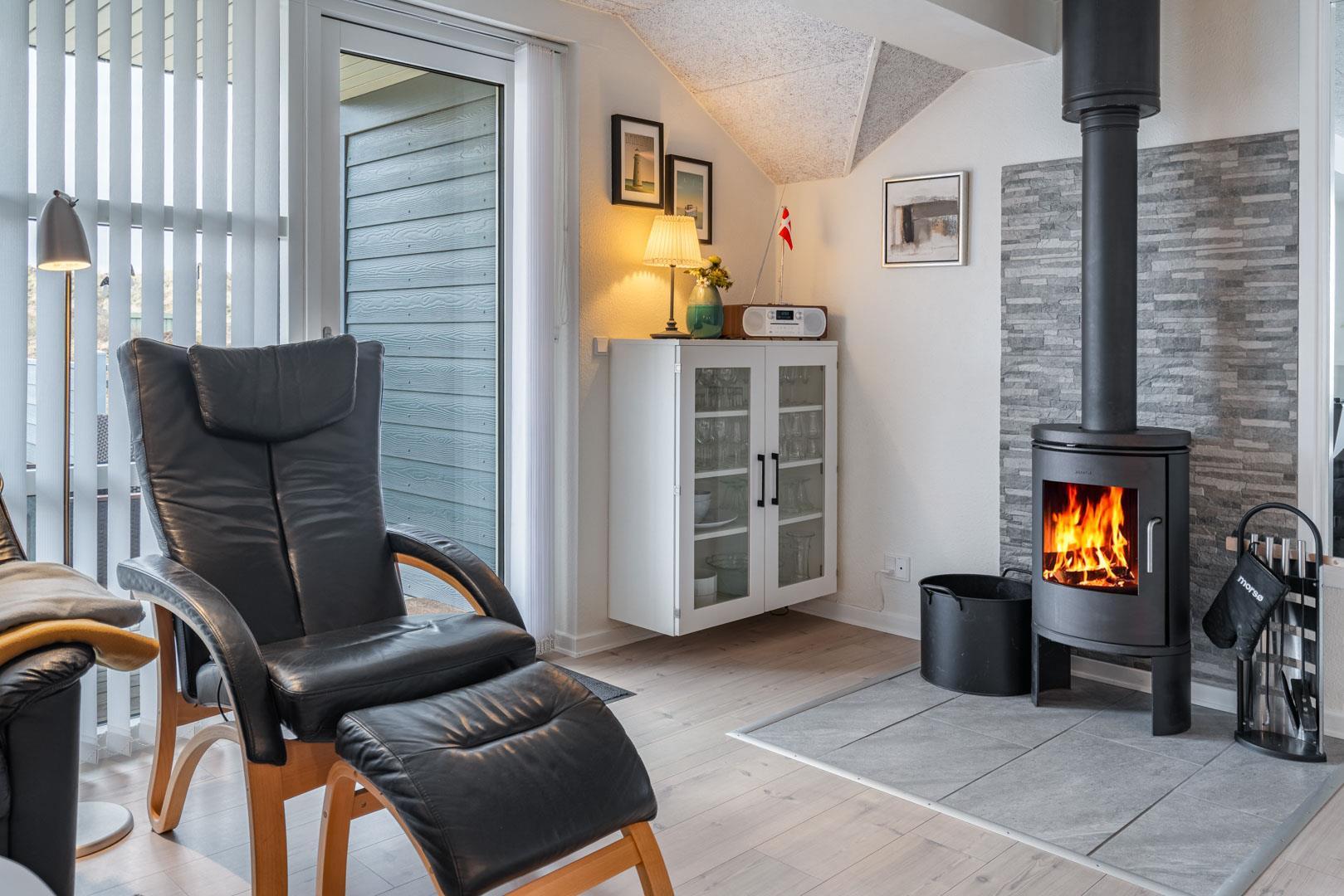 Stuen er lys og hyggeligt indrettet med komfortable møbler og store vinduespartier, der lukker dagslyset ind. Det veludstyrede køkken er integreret i opholdsrummet og giver direkte adgang til den store, ugenerede træterrasse. Her er der god plads til at slappe af, grille og nyde sommerdagene. Huset har tre soveværelser med dobbeltsenge og 1 soverum med 2 enkeltsenge. Derudover findes der et stort køle/fryseskab og separat redskabsrum til brænde og andre ting.