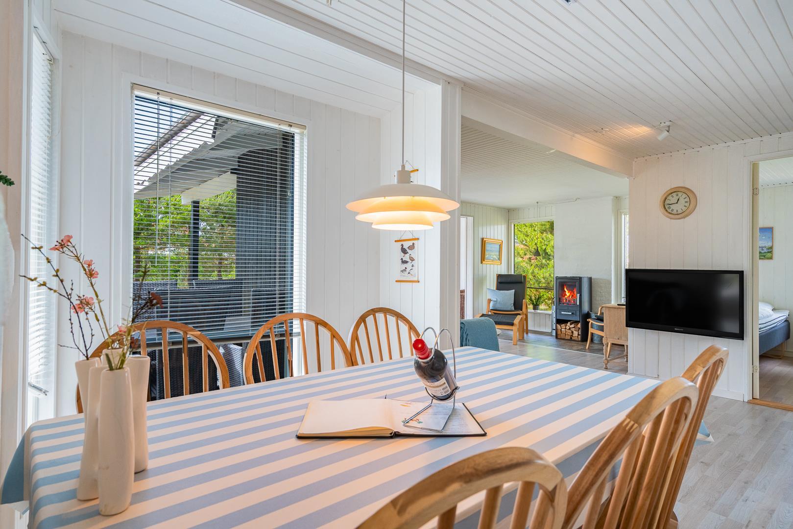 Indenfor mødes du af en lys og venlig atmosfære. Den hyggelige stue med brændeovn skaber den perfekte ramme for afslapning – uanset om du vil fordybe dig i en god bog eller nyde varmen fra flammerne på en kølig aften.