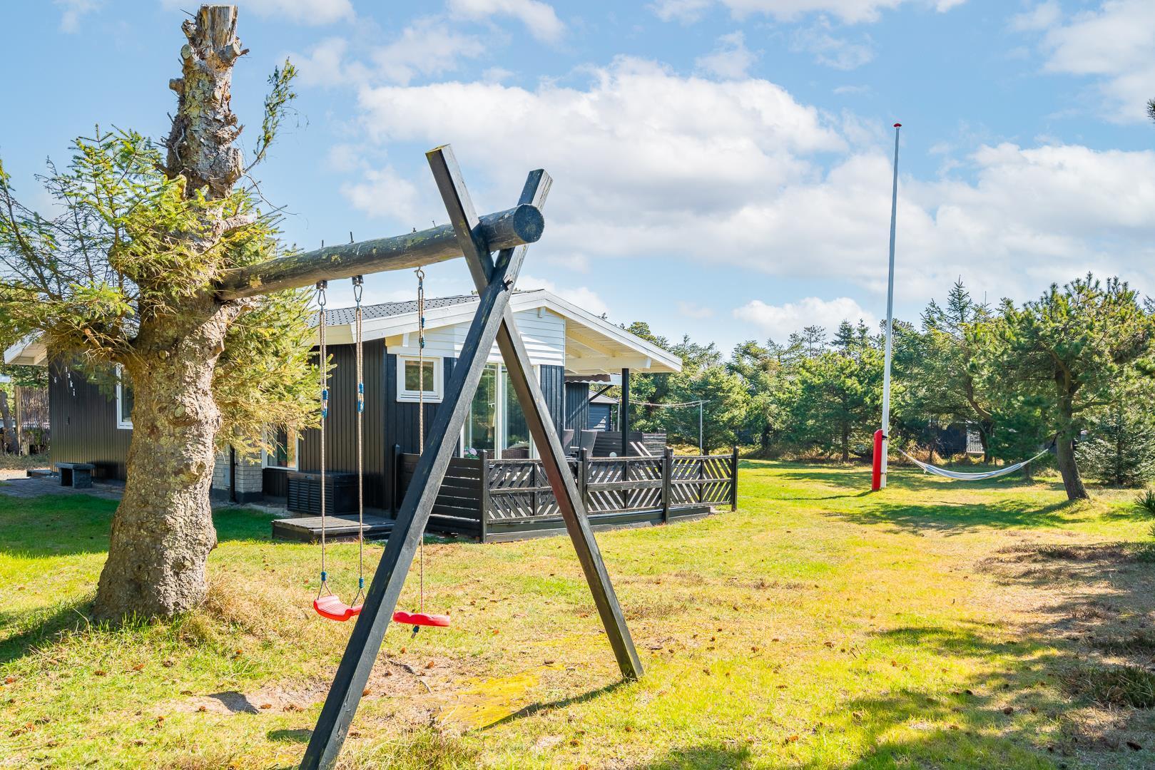 Sommerhuset ligger på en ugeneret, børnevenlig naturgrund omgivet af træer og buske – ideelt til en afslappende ferie i rolige omgivelser. Her kan du nyde solen på flere gode terrasser eller slappe af i den hyggelige udestue med en kop kaffe eller et glas vin.