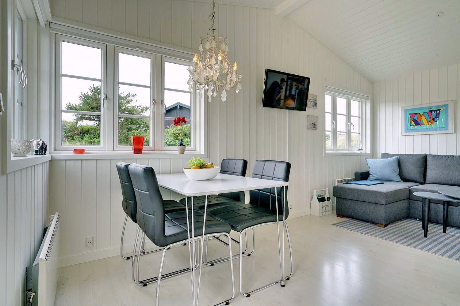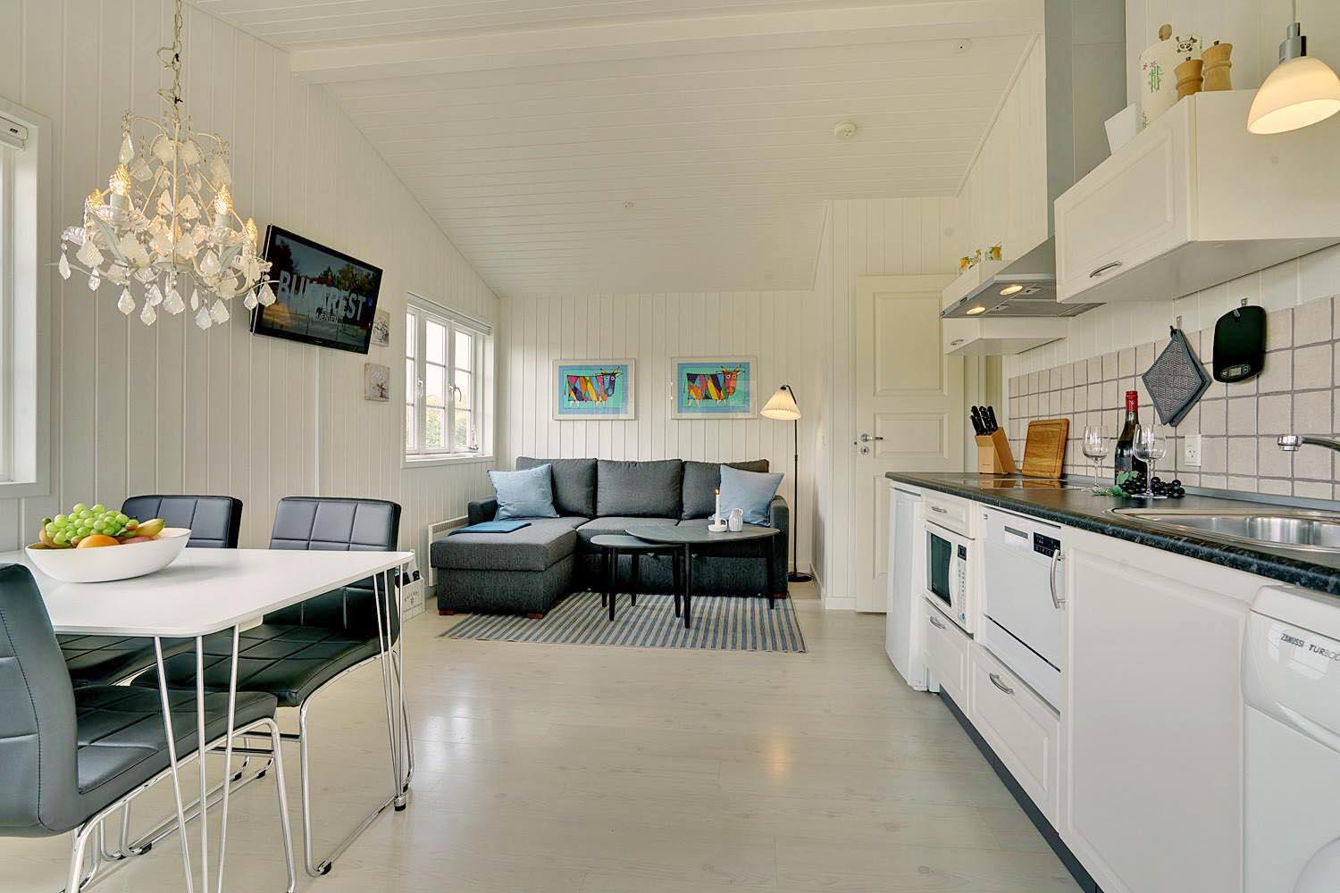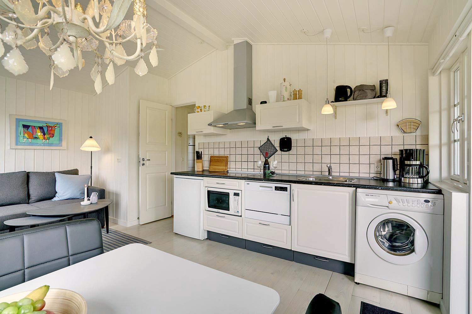 Alt fremstår lyst og venligt og er løbende moderniseret. Det lille køkken er med vaskemaskine og opvaskemaskine og er i åbne forbindelse med stuen. Stuen er udstyret med 1 dobbelt sovesofa hvor børnene kan sove. Husets soveværelse er med dobbelt seng og god skabsplads. Lille og pænt badeværelse med bruser. (Huset egner sig ikke til 4 voksne)