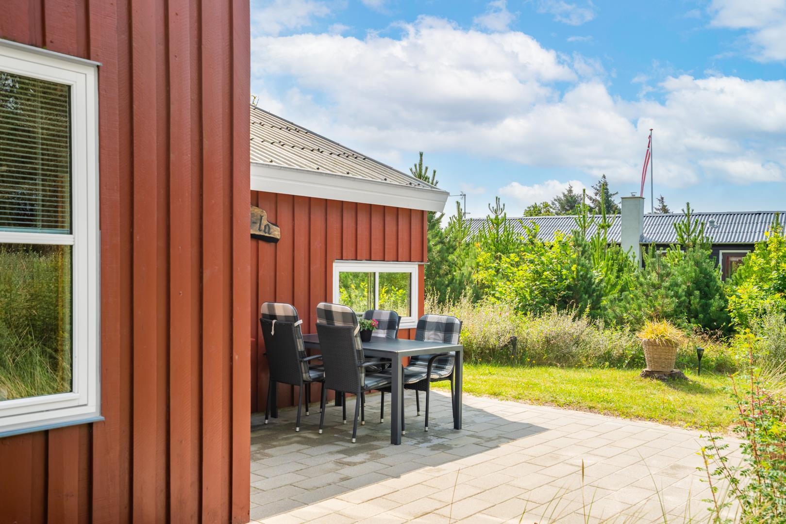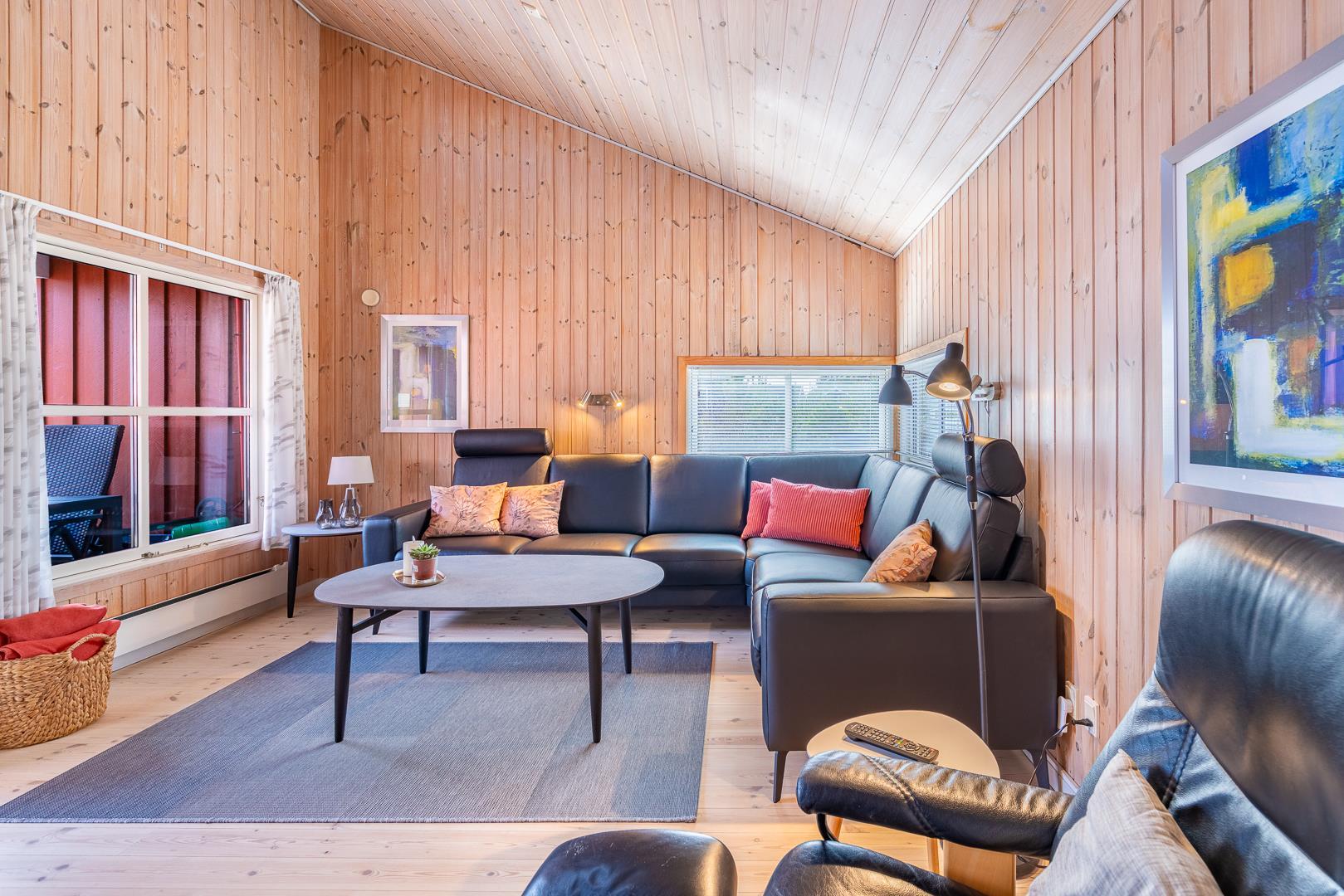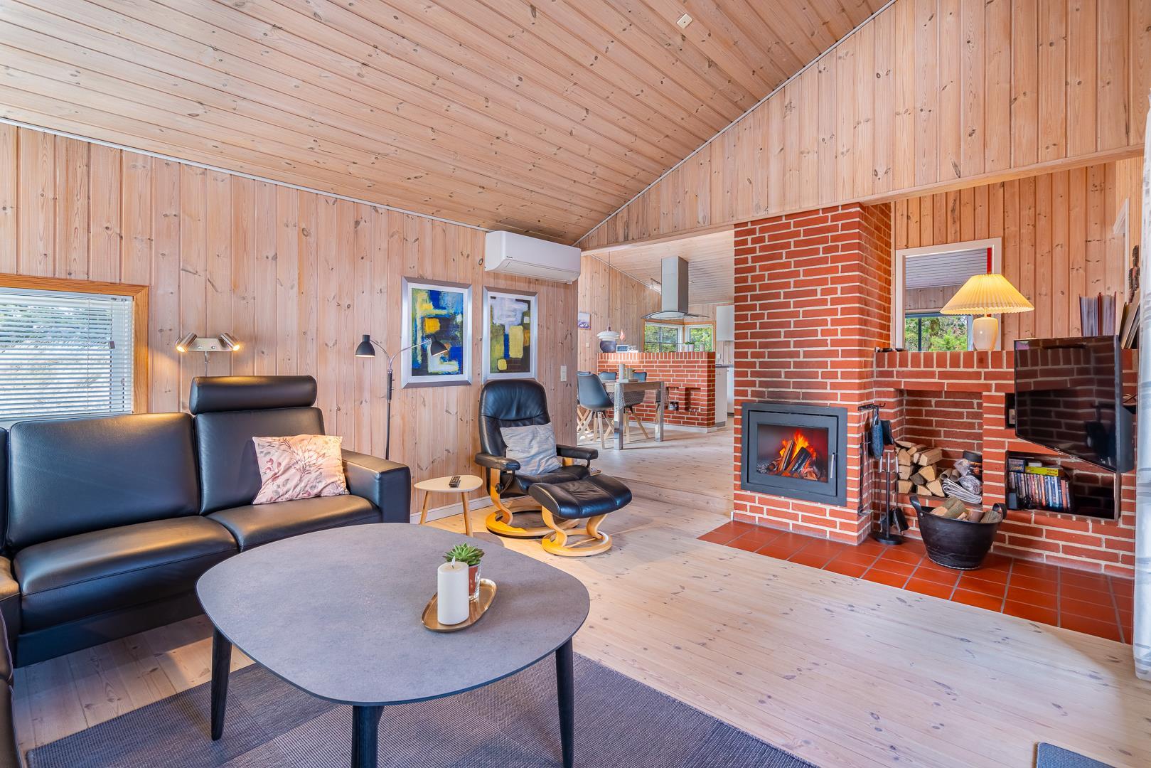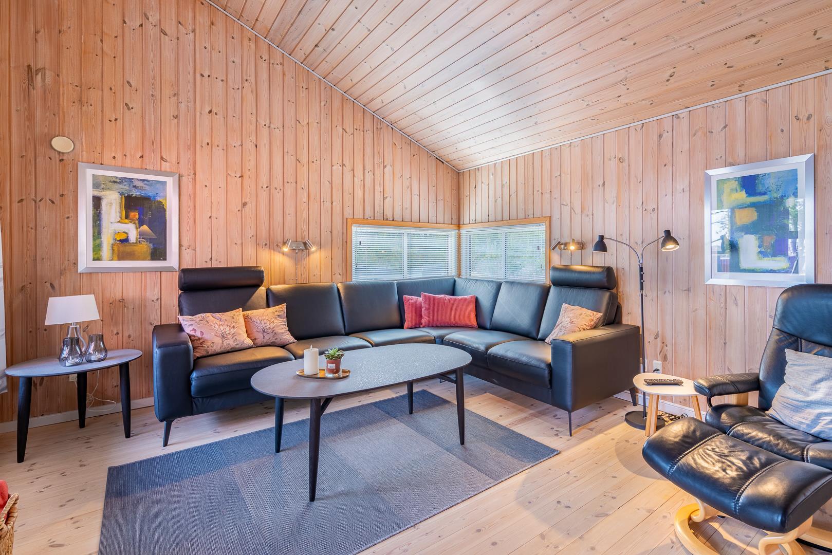 Huset er smagfuldt indrettet med pæne og komfortable møbler, der skaber en hyggelig og indbydende atmosfære. Der er trægulve i huset. Det pæne køkken er kombineret med en spiseafdeling, der gør det nemt at samles til gode måltider. Den hyggelige stue har direkte udgang til en delvist overdækket, ugeneret terrasse samt en mindre terrasse mod vest, hvor du kan nyde aftensolen.