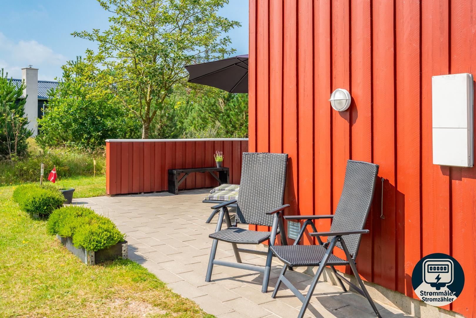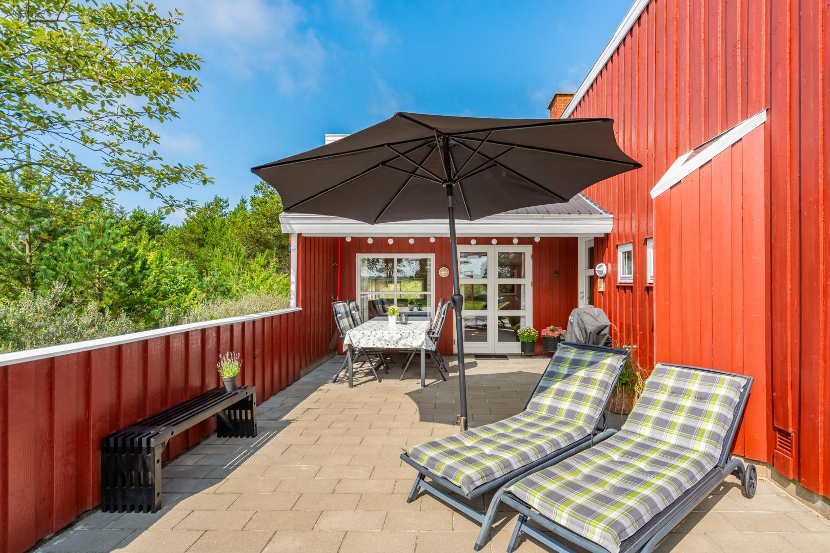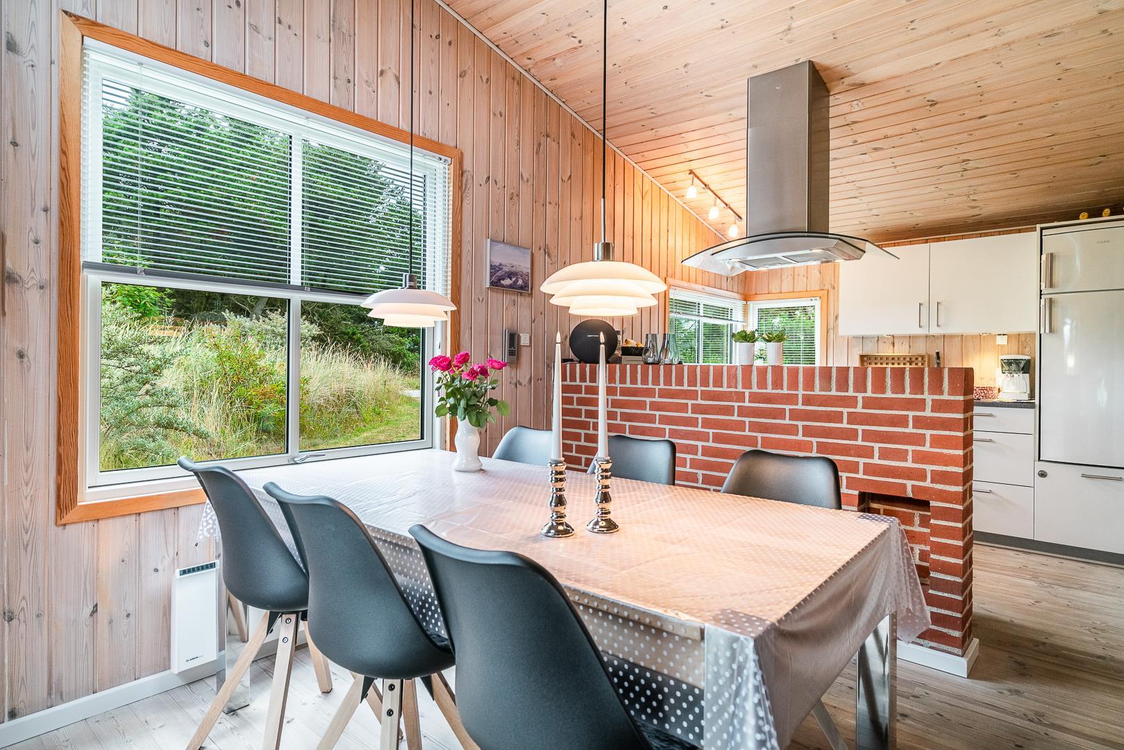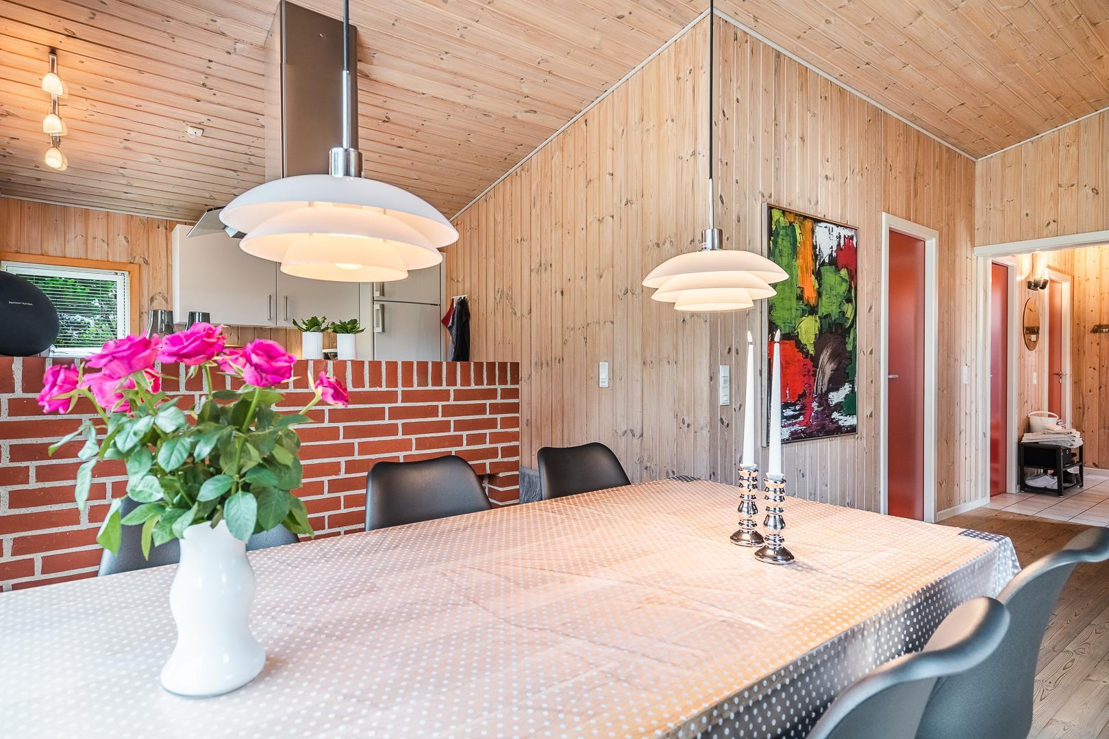 Huset er smagfuldt indrettet med pæne og komfortable møbler, der skaber en hyggelig og indbydende atmosfære. Der er trægulve i huset. Det pæne køkken er kombineret med en spiseafdeling, der gør det nemt at samles til gode måltider. Den hyggelige stue har direkte udgang til en delvist overdækket, ugeneret terrasse samt en mindre terrasse mod vest, hvor du kan nyde aftensolen.