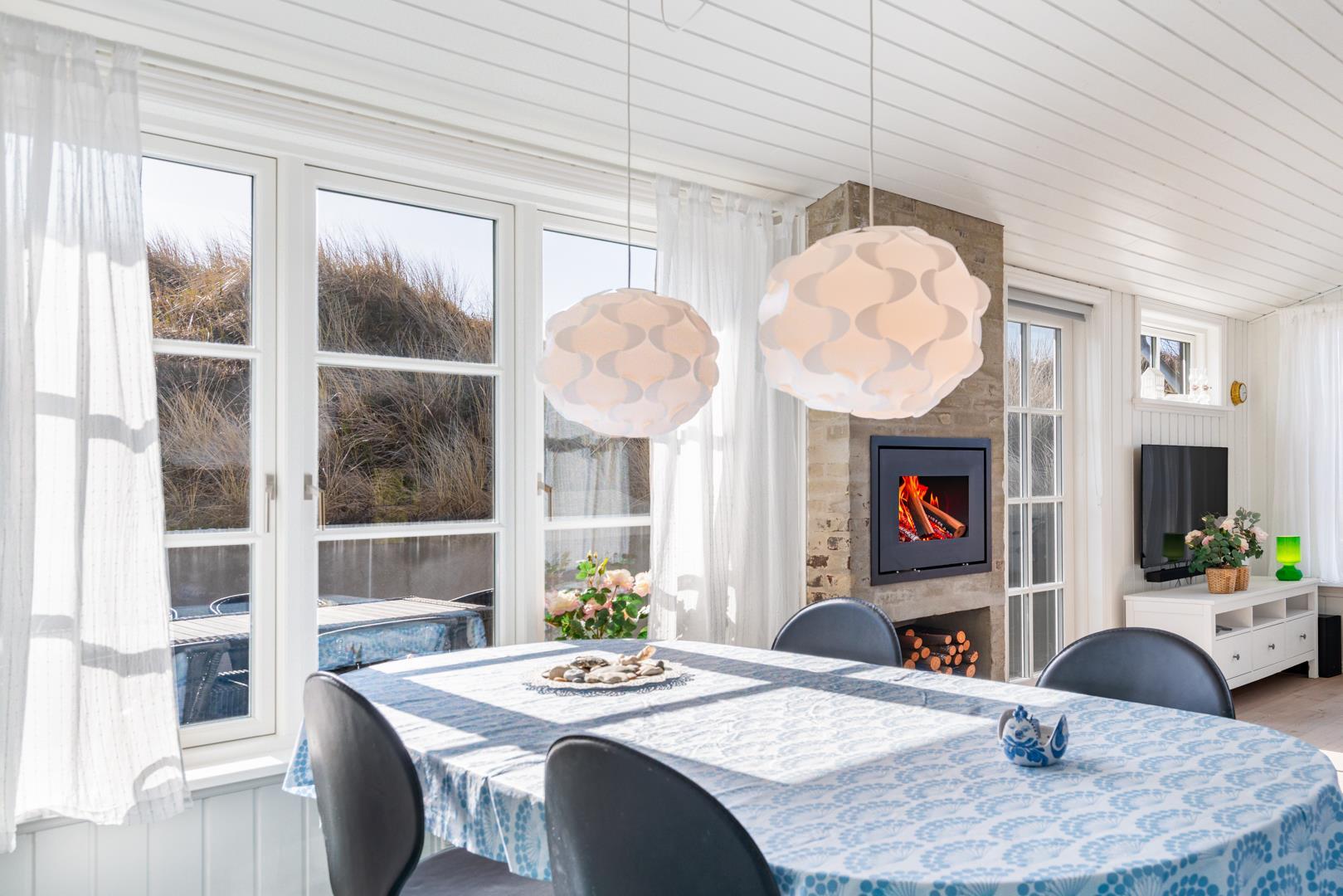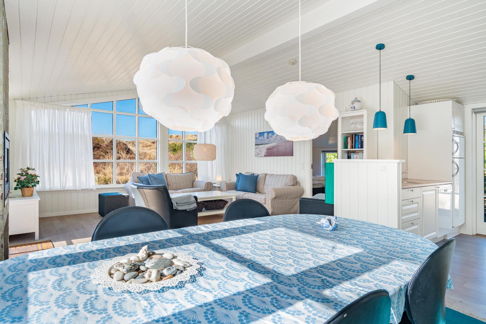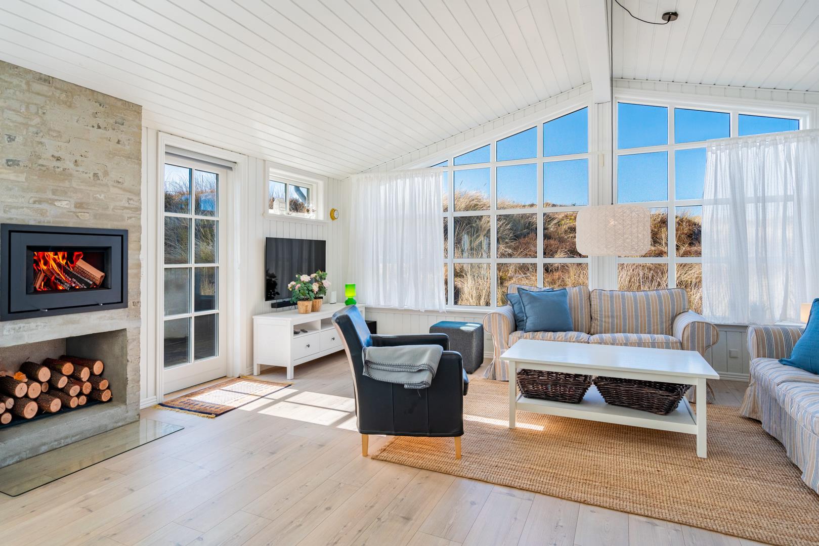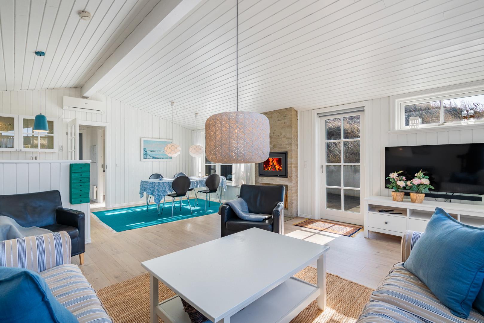 Indretningen er lys, venlig og indbydende med smagfulde materialer, træ- og klinkegulve samt moderne bekvemmeligheder. Det veludstyrede køkken ligger i åben forbindelse med stuen, som har loft til kip, brændeovn og store vinduer med udsigt over det fredede klitlandskab.