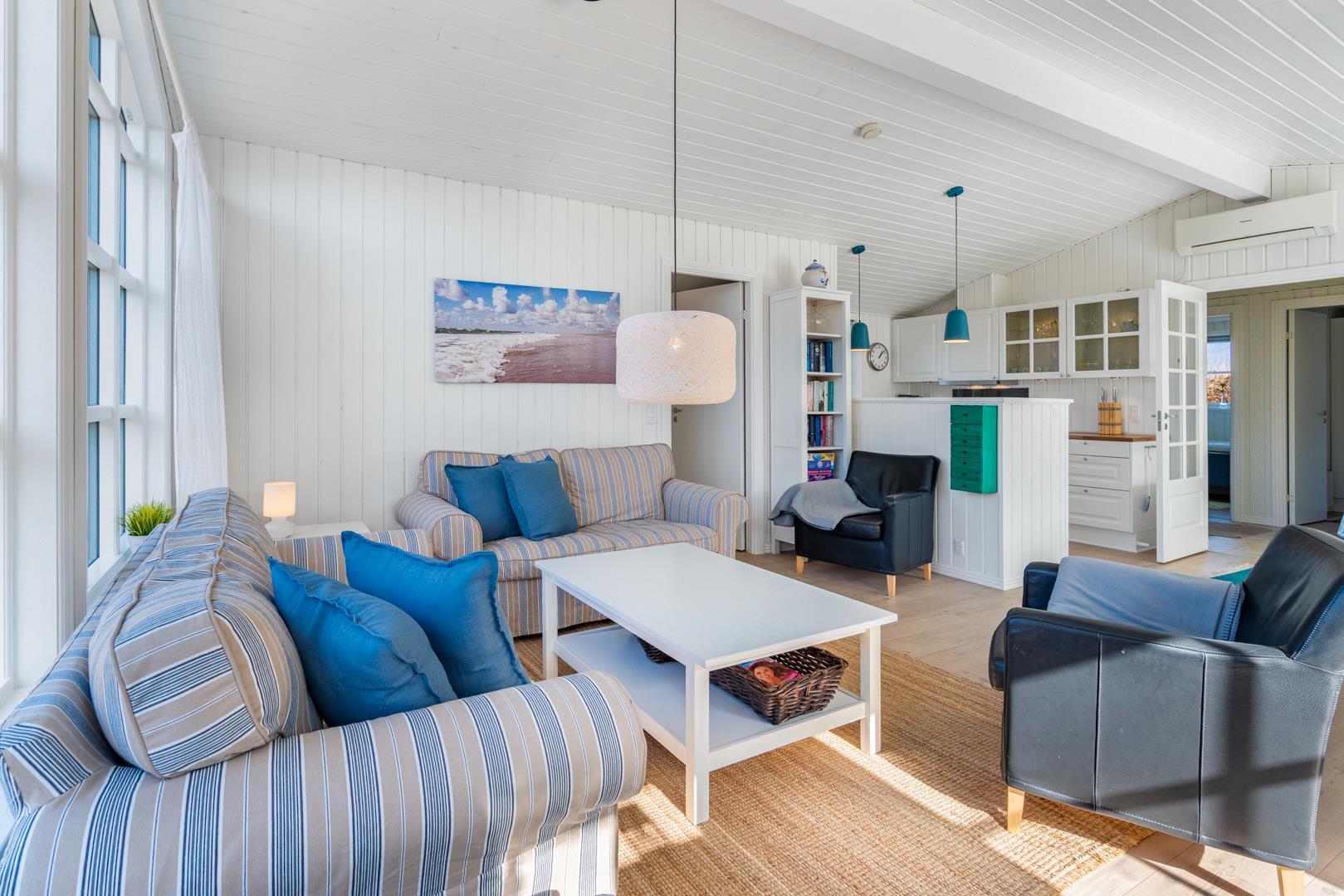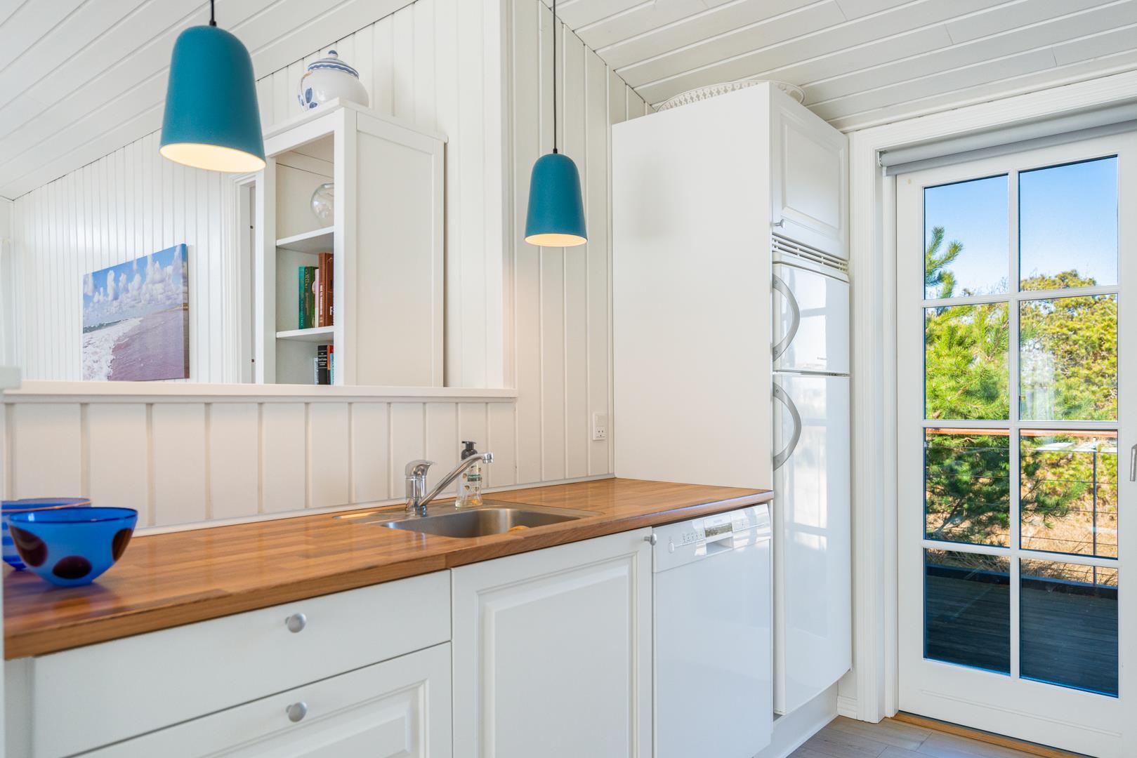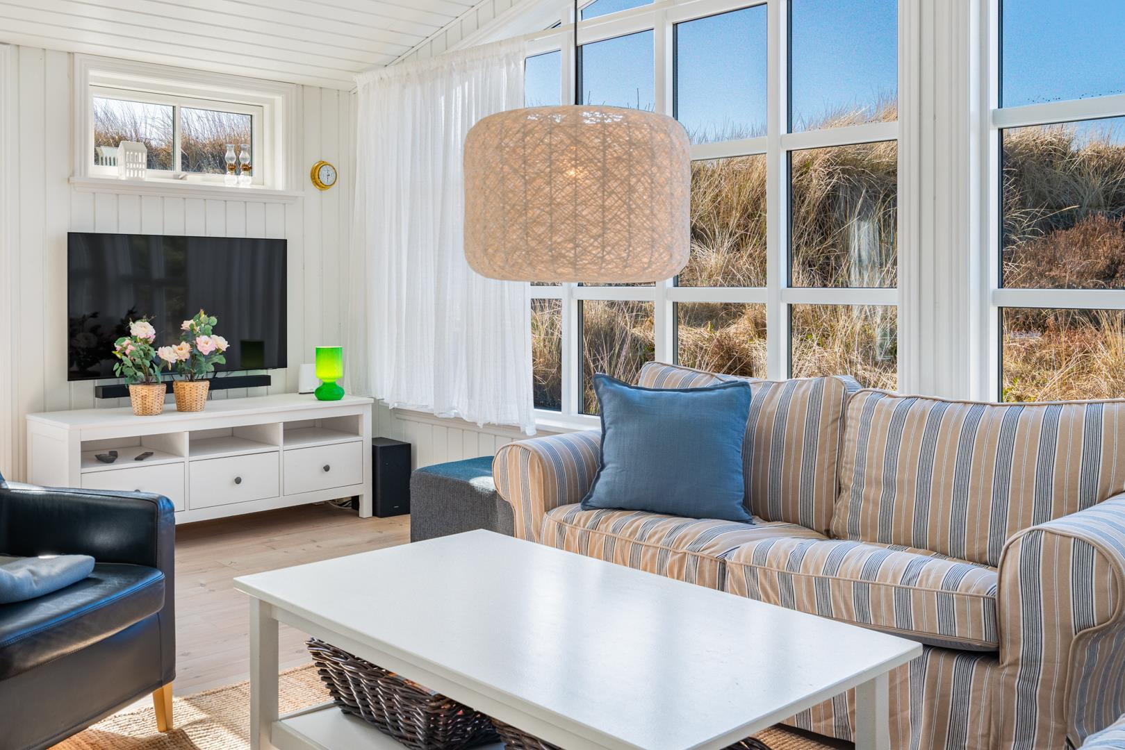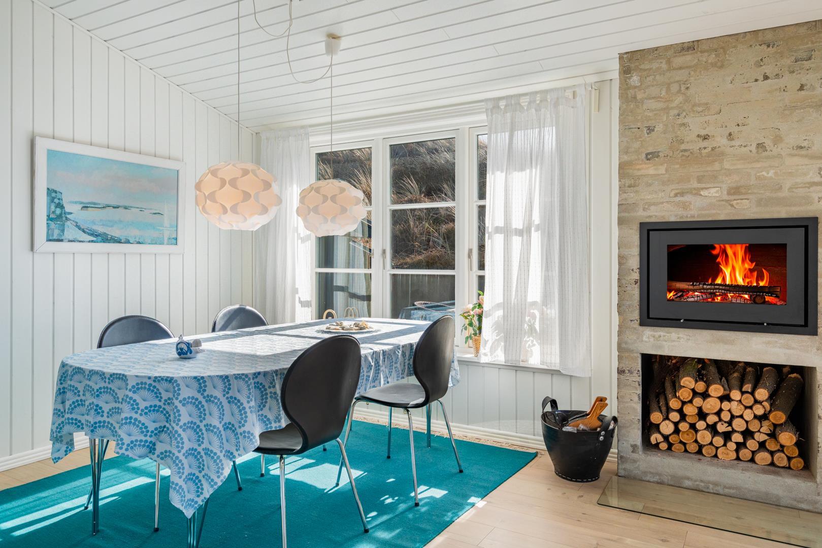 Indretningen er lys, venlig og indbydende med smagfulde materialer, træ- og klinkegulve samt moderne bekvemmeligheder. Det veludstyrede køkken ligger i åben forbindelse med stuen, som har loft til kip, brændeovn og store vinduer med udsigt over det fredede klitlandskab.