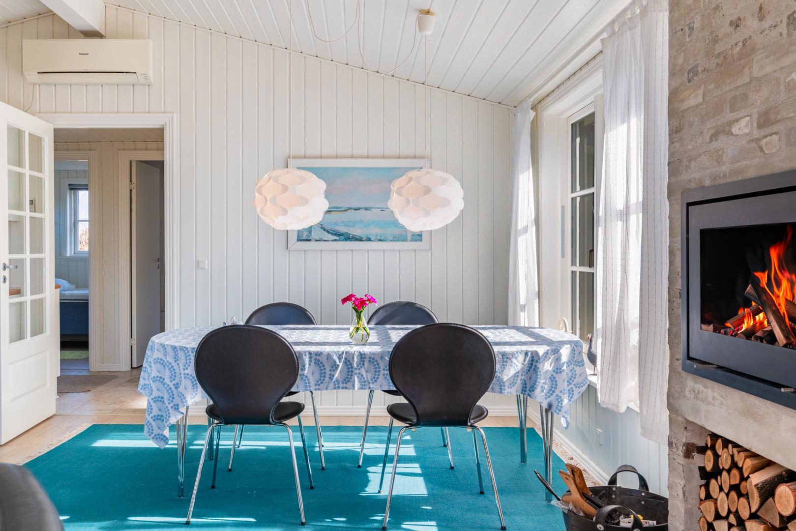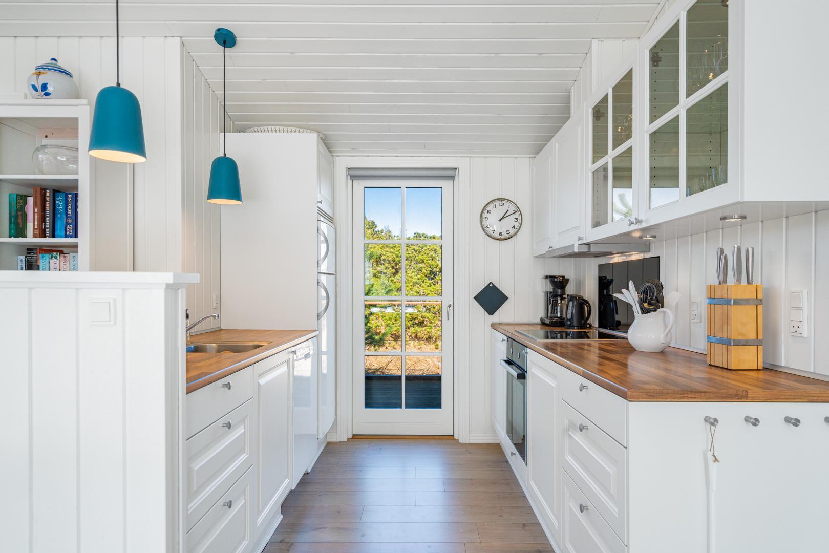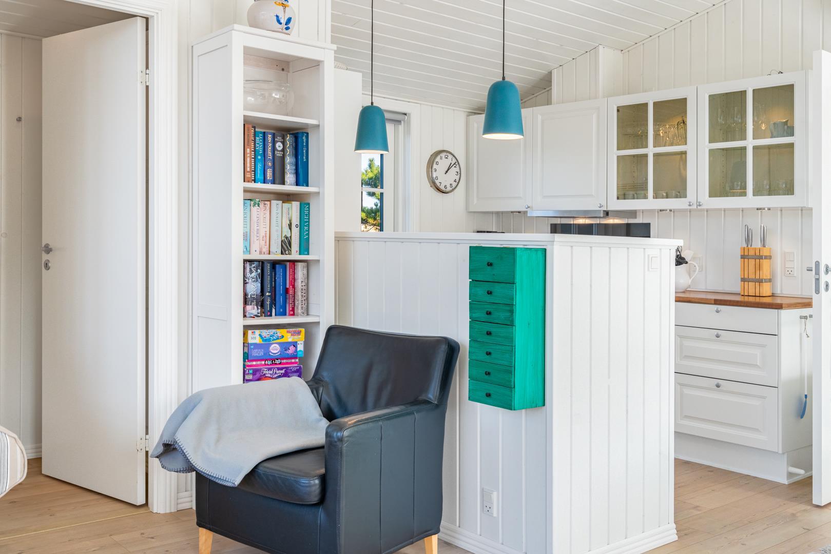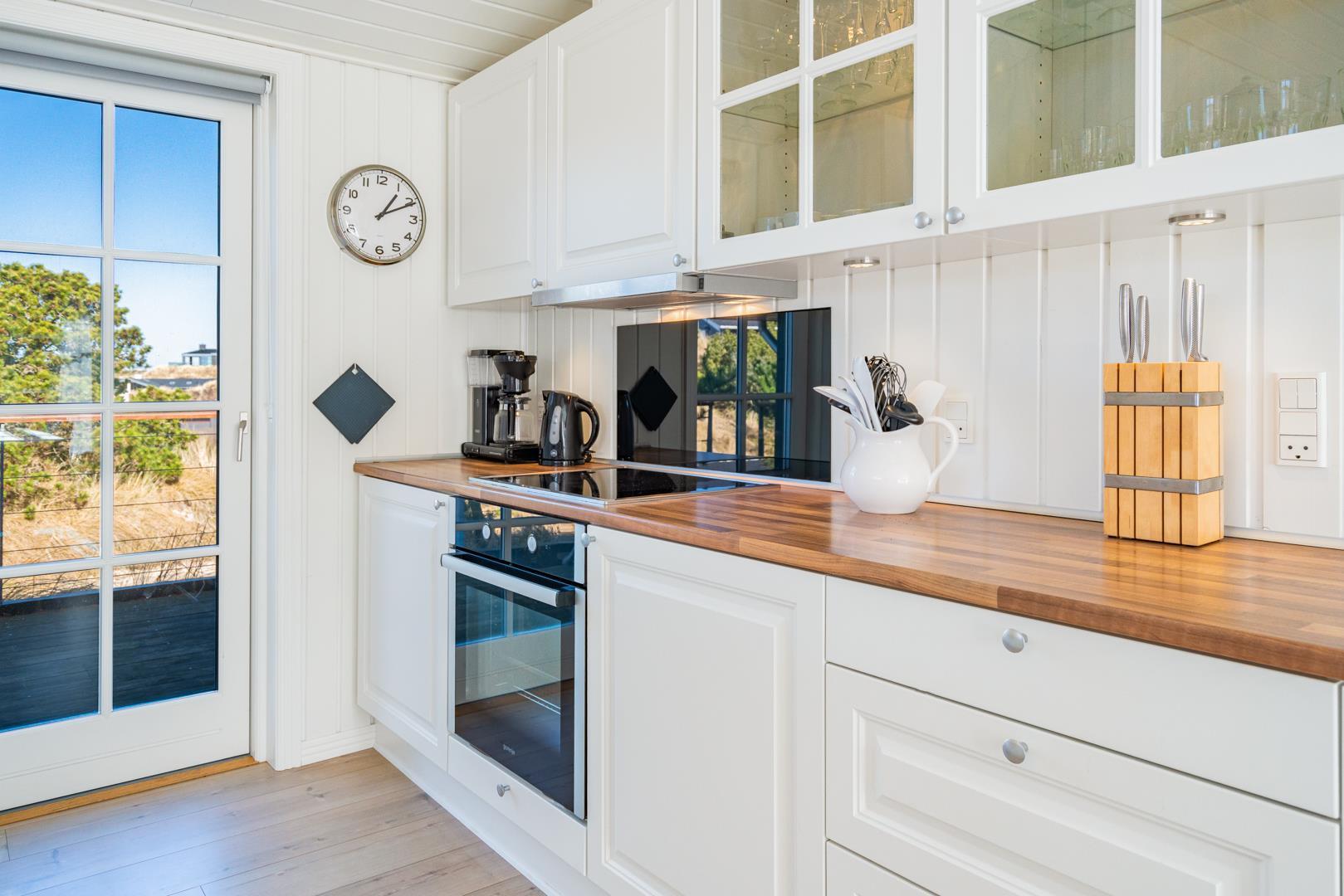 Indretningen er lys, venlig og indbydende med smagfulde materialer, træ- og klinkegulve samt moderne bekvemmeligheder. Det veludstyrede køkken ligger i åben forbindelse med stuen, som har loft til kip, brændeovn og store vinduer med udsigt over det fredede klitlandskab.