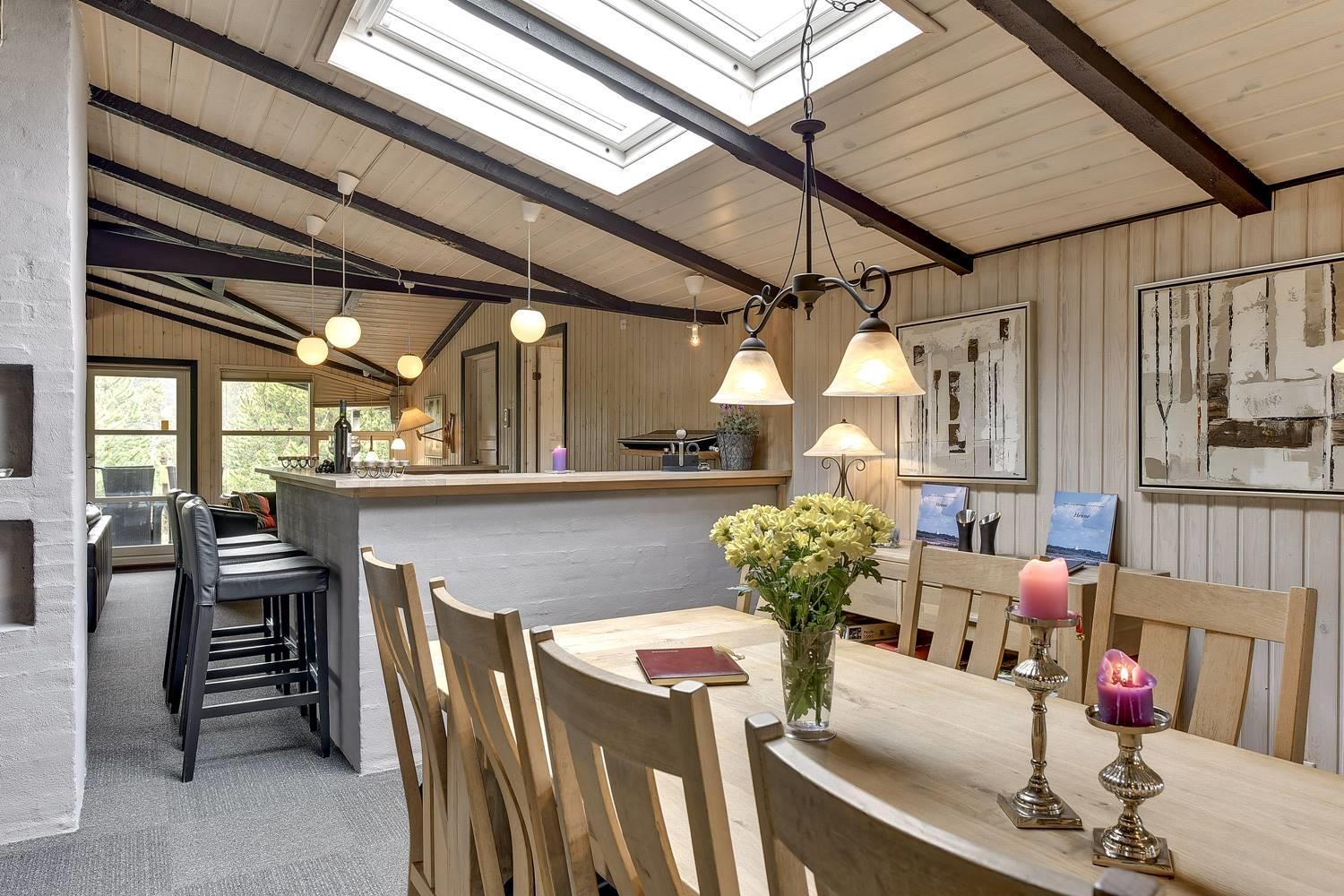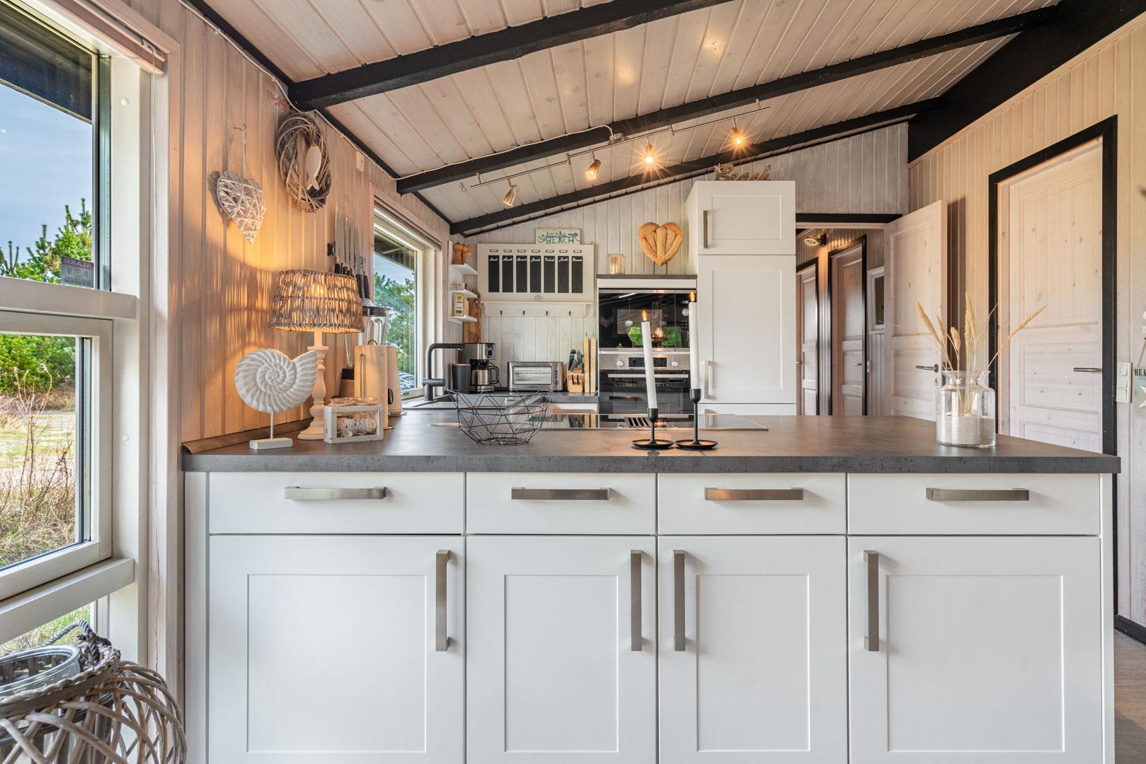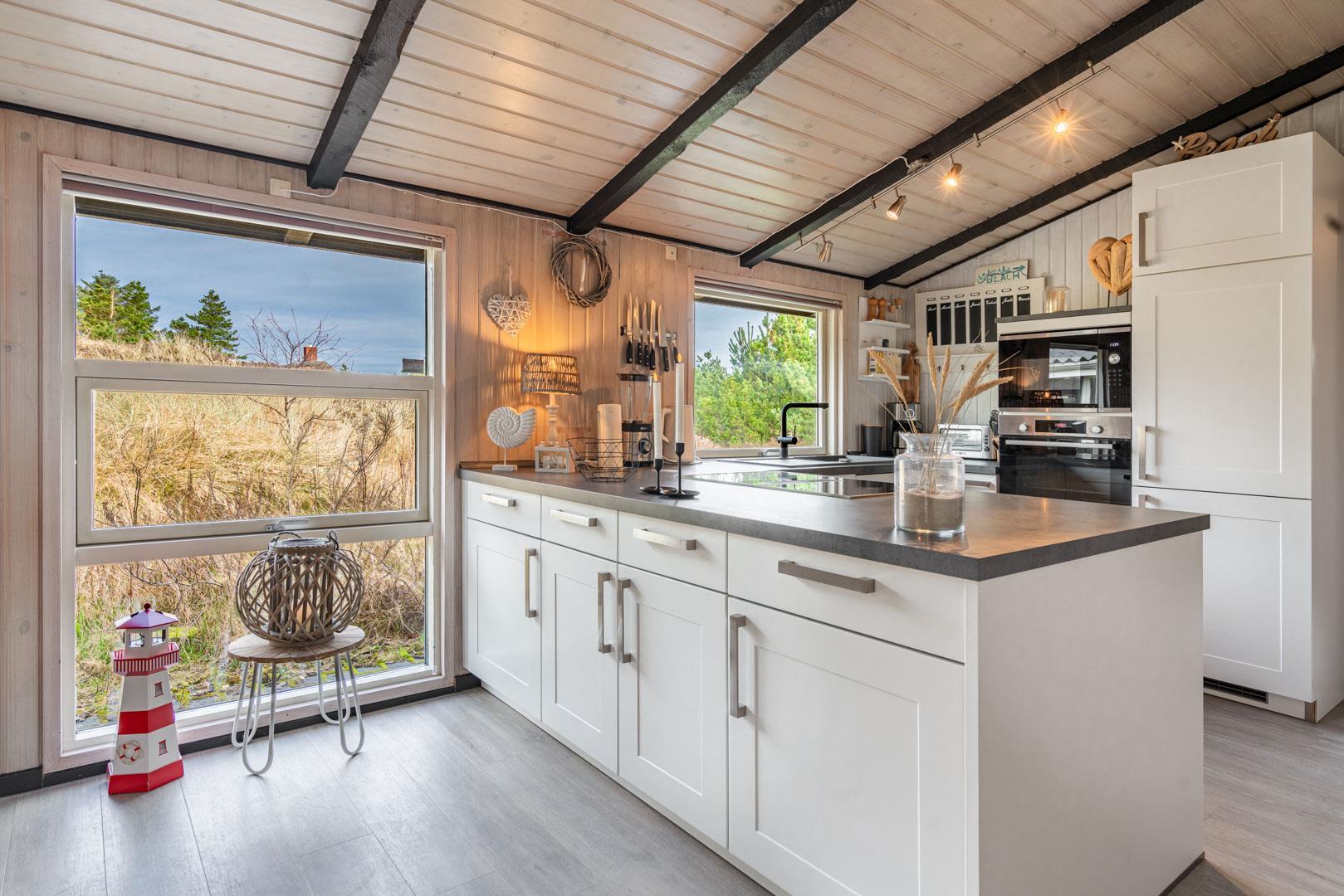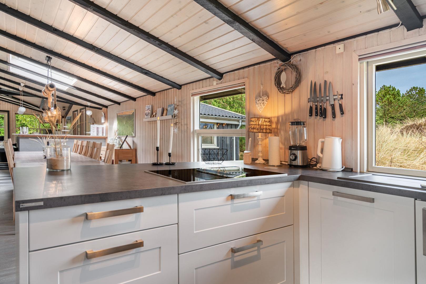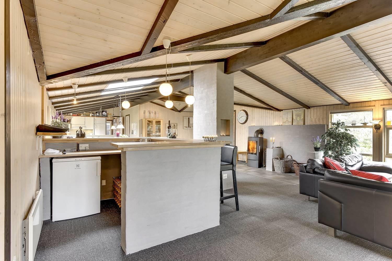 Det åbne og veludstyrede køkken er integreret i husets store, lyse stue-/alrum, hvor en hyggelig indbygget bar, komfortable sofaer og en brændeovn med glaslåge skaber den helt rigtige feriestemning.