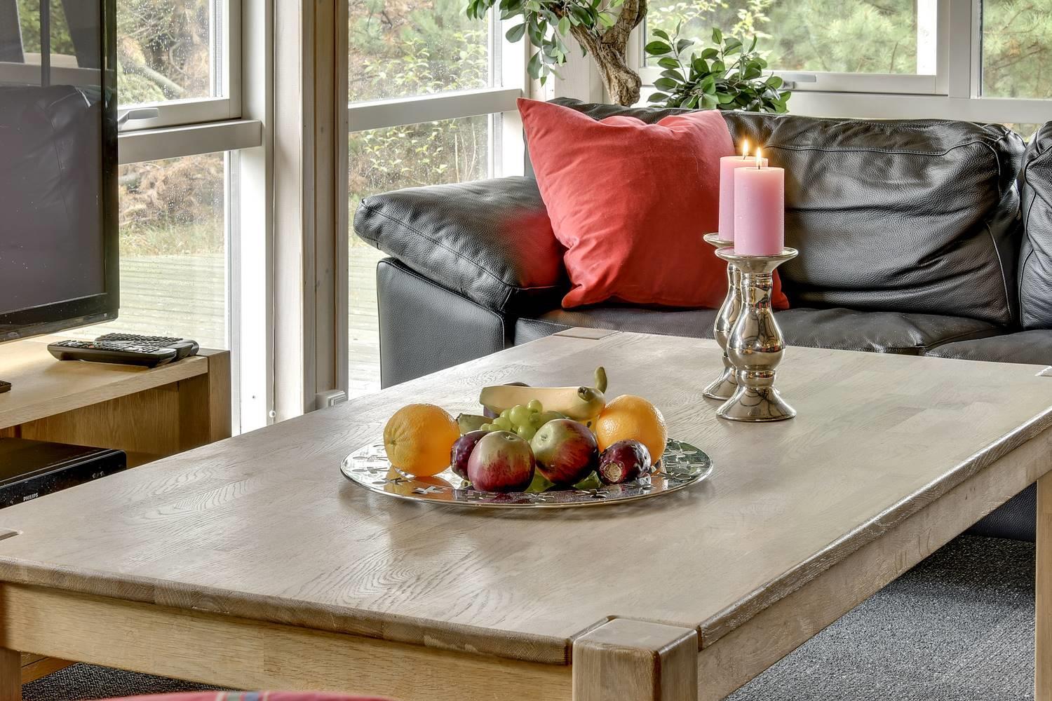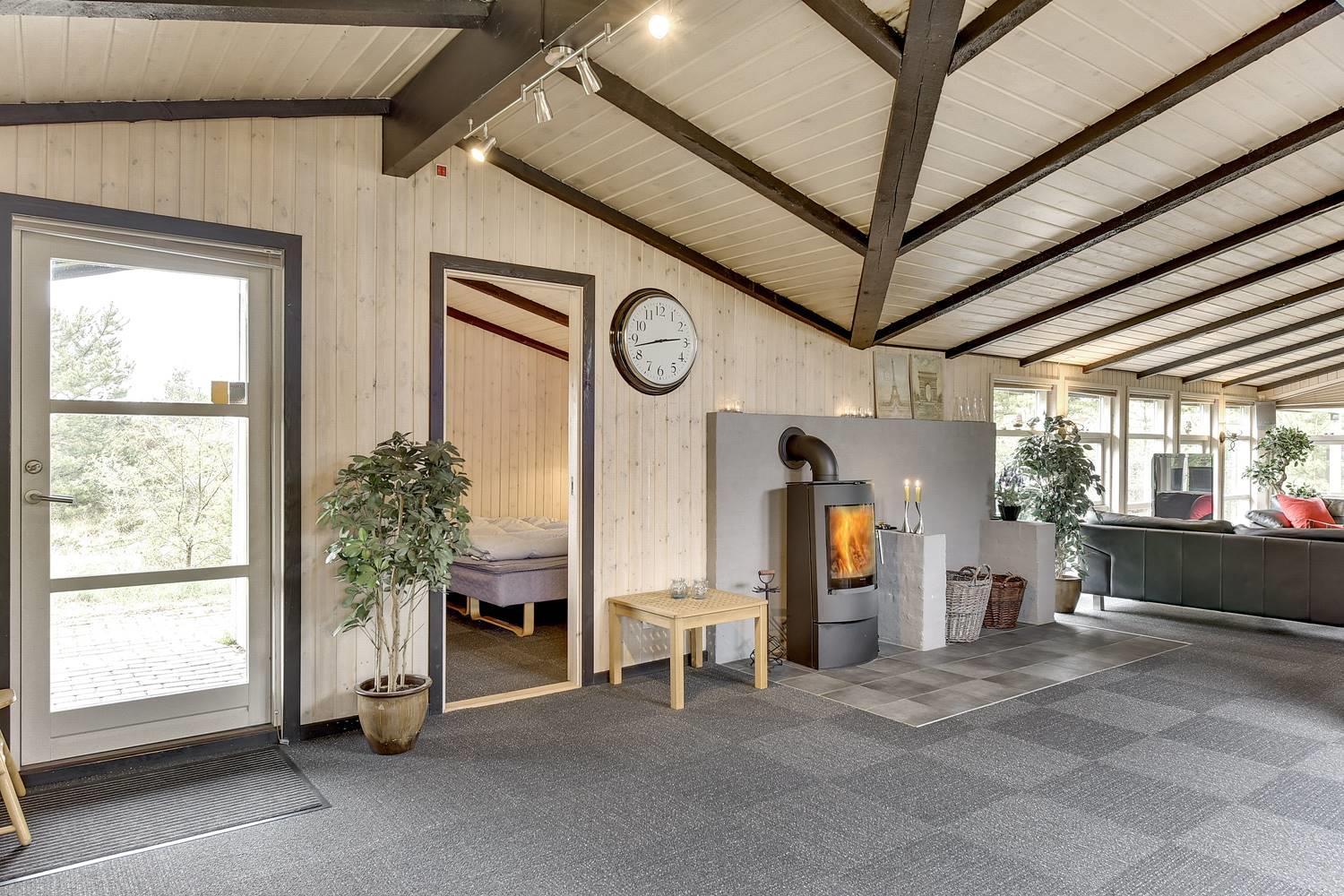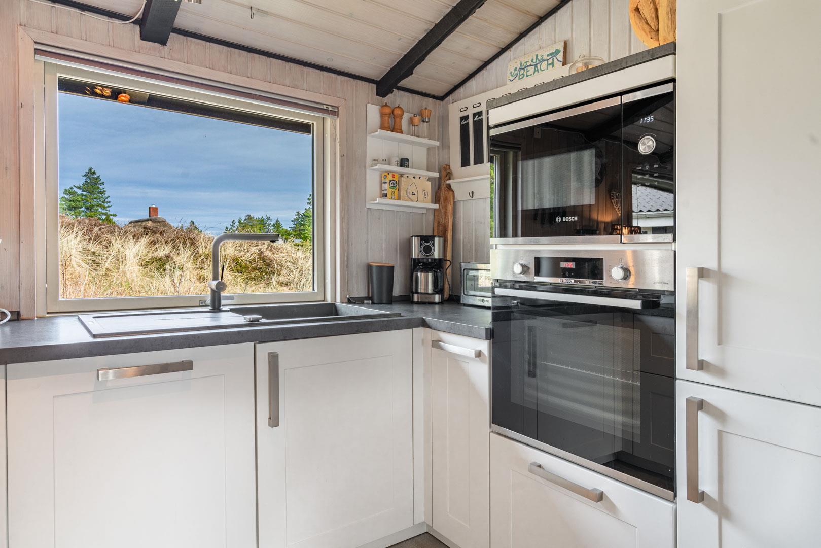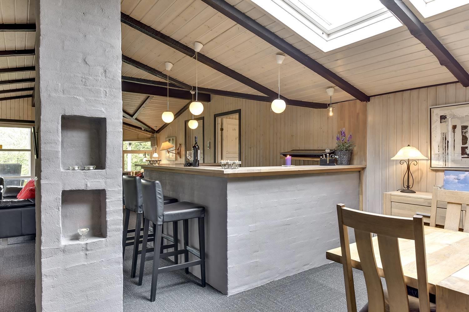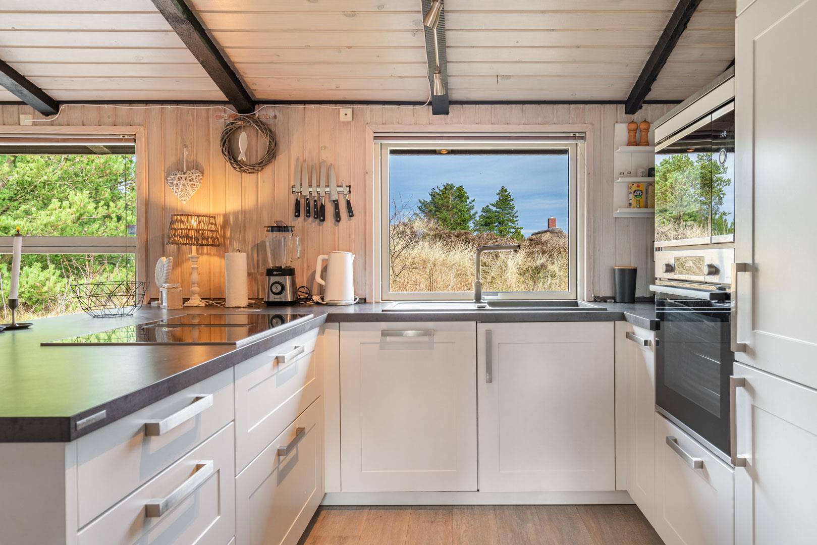 Det åbne og veludstyrede køkken er integreret i husets store, lyse stue-/alrum, hvor en hyggelig indbygget bar, komfortable sofaer og en brændeovn med glaslåge skaber den helt rigtige feriestemning.