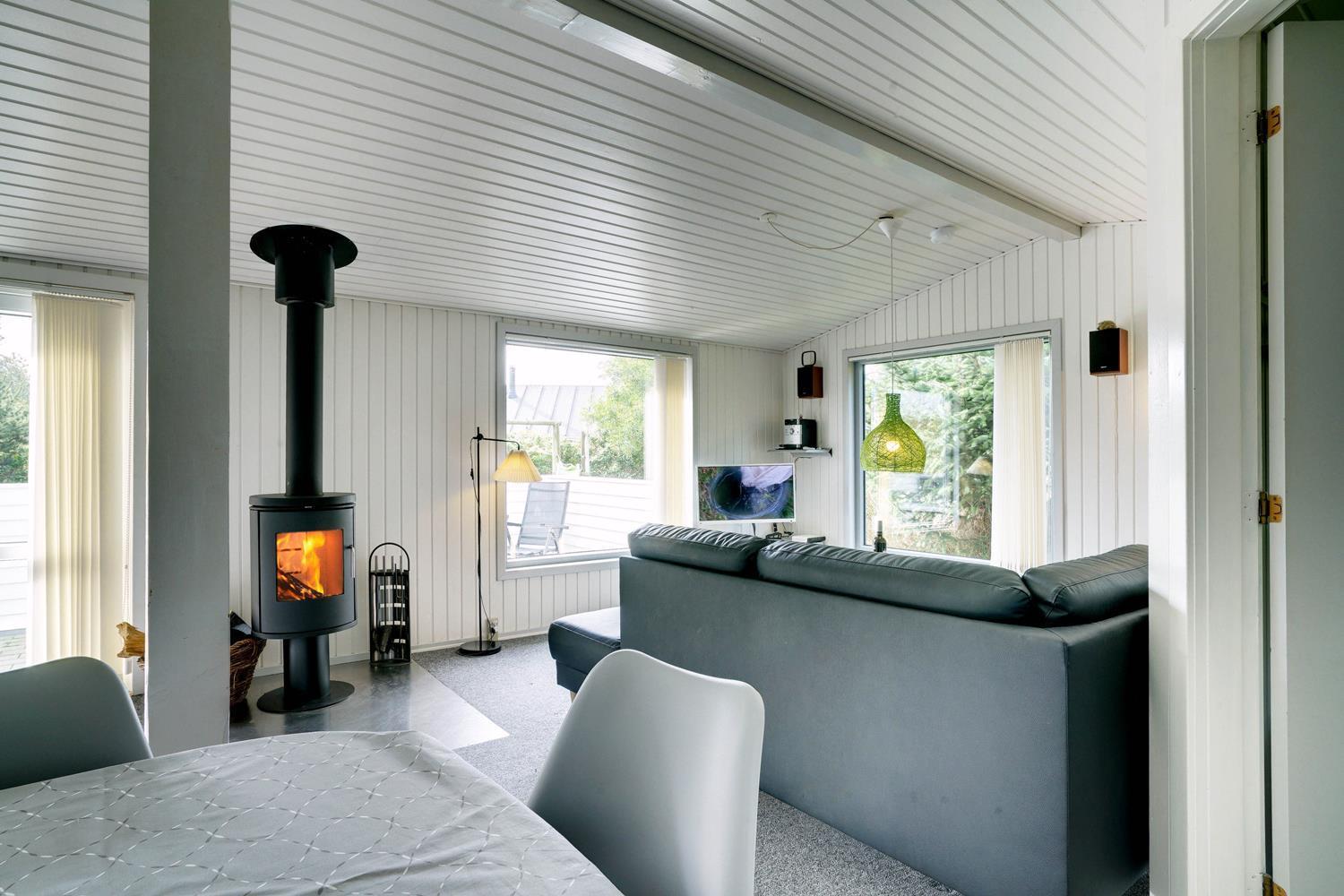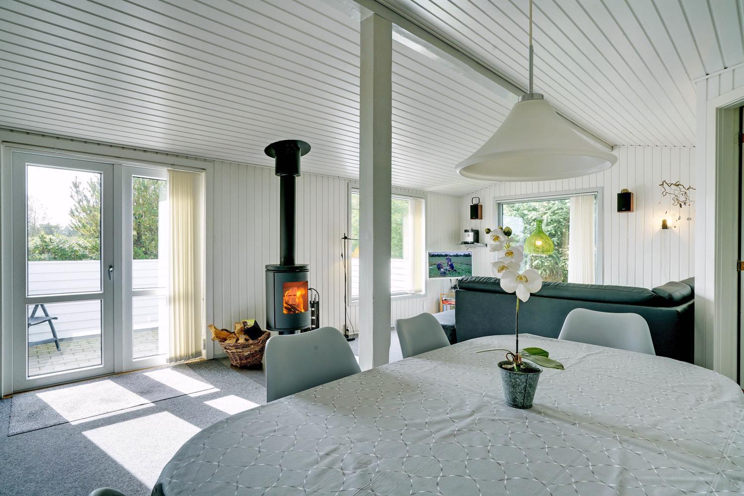 Det åbne køkken er veludstyret og ligger i praktisk forbindelse med den lyse spisestue og stue, hvor gode møbler og en brændeovn sørger for både hygge og varme.