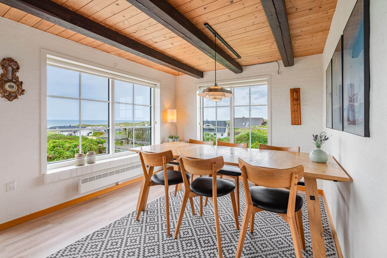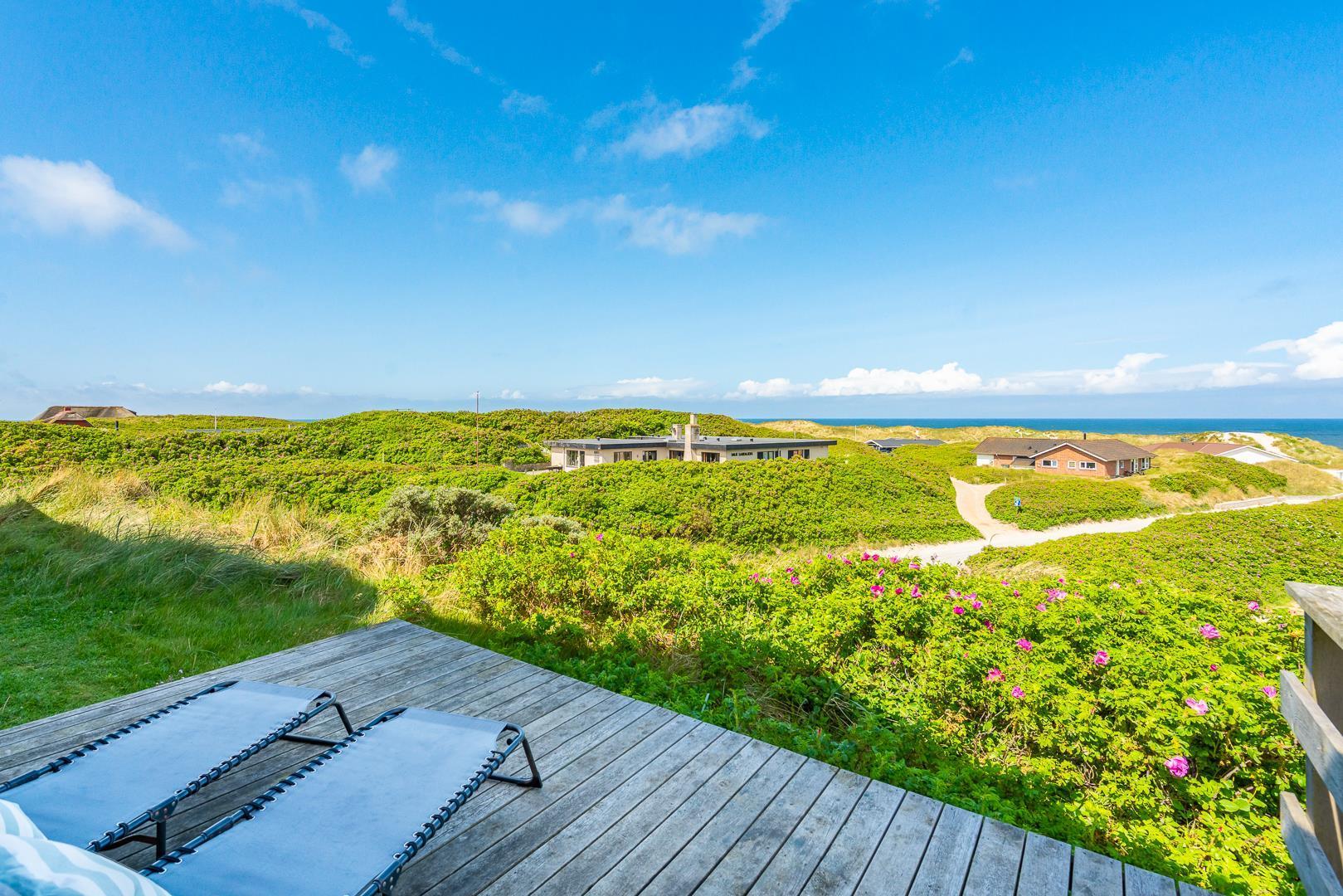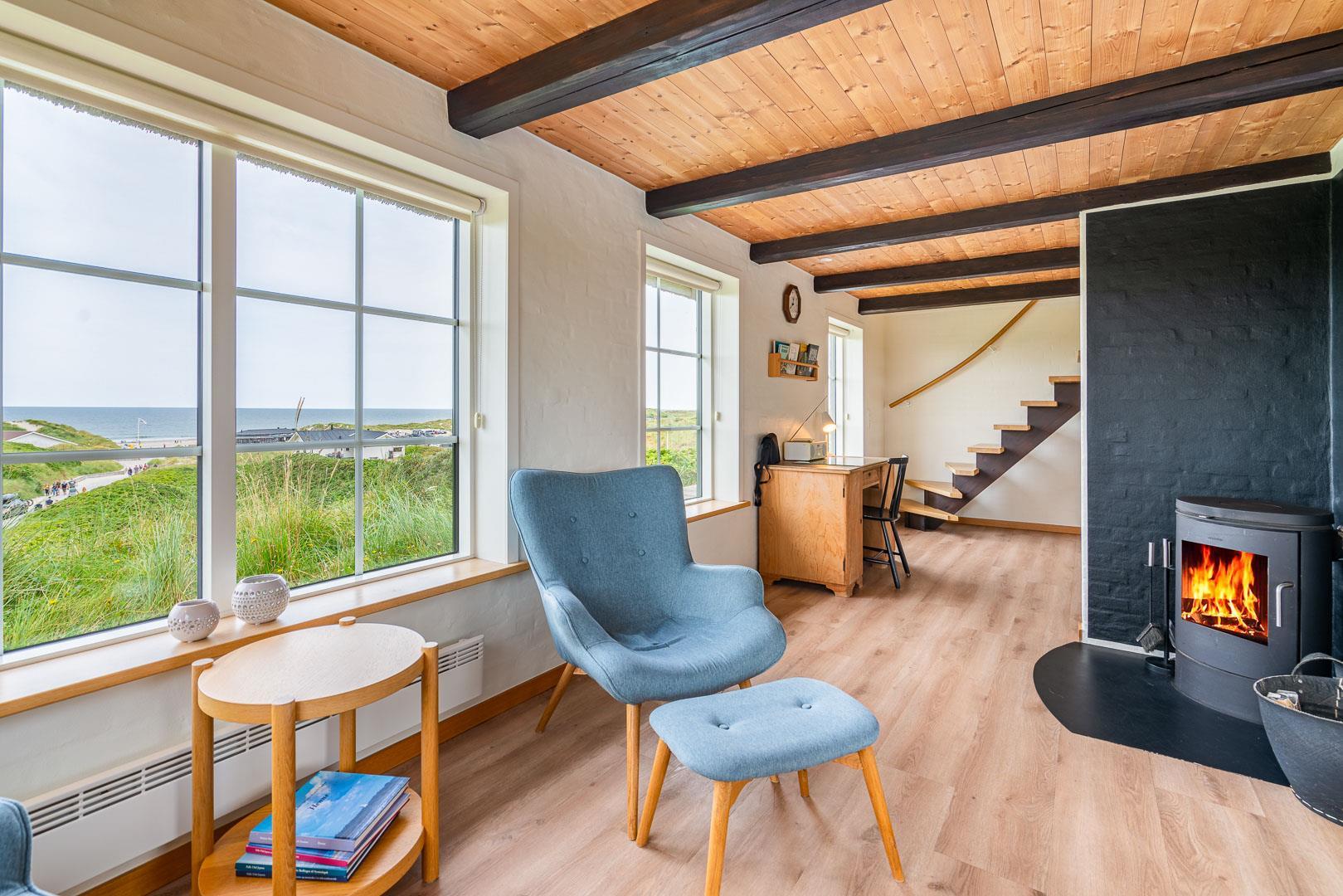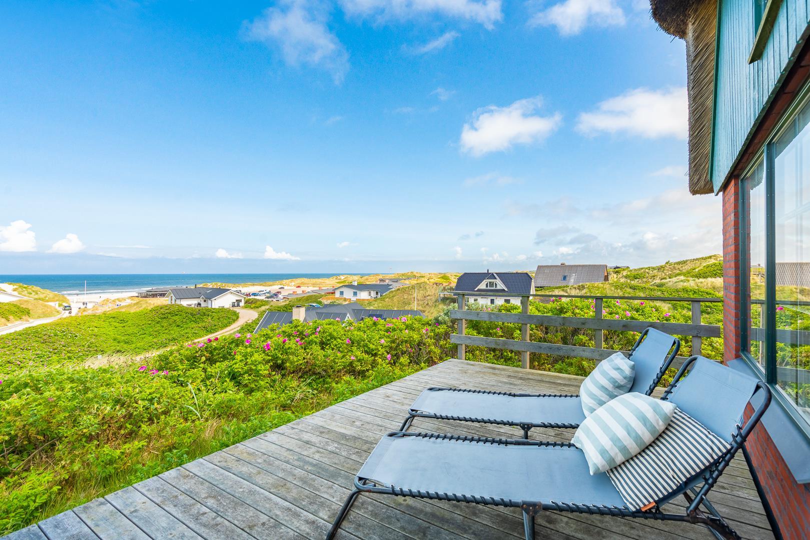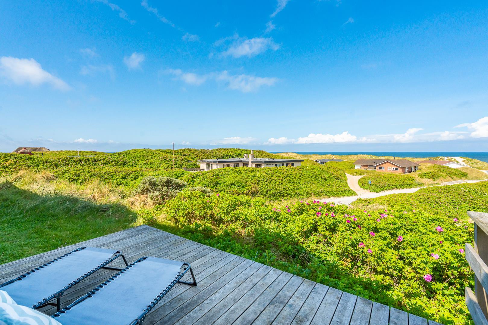 Her finder du et unikt sommerhus, perfekt placeret på en af Vestkystens bedste beliggenheder. Med en fantastisk udsigt over stranden og det mægtige Vesterhav, som du kan nyde fra alle sider af huset – nord, syd og vest. Mod øst åbner landskabet sig med Henne Strand by og det vidtstrakte hedeområde nord for byen.