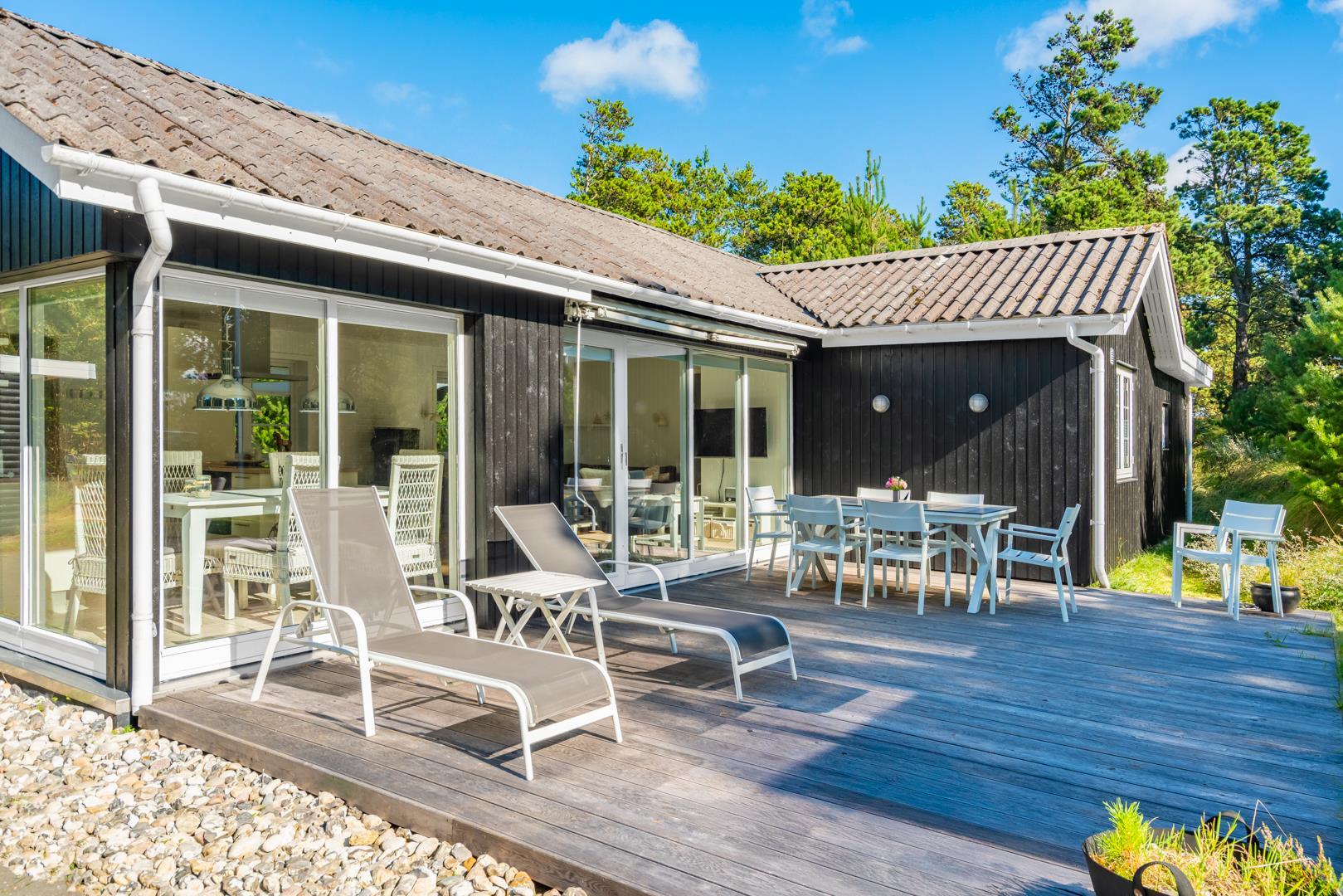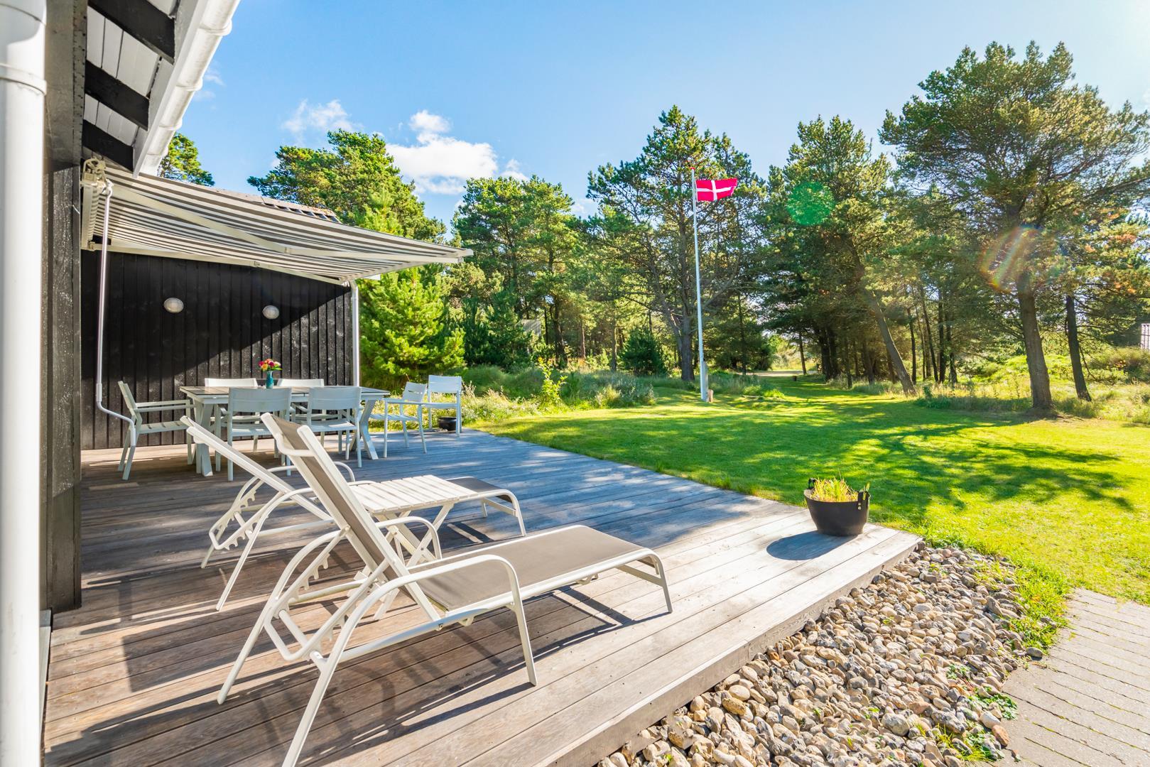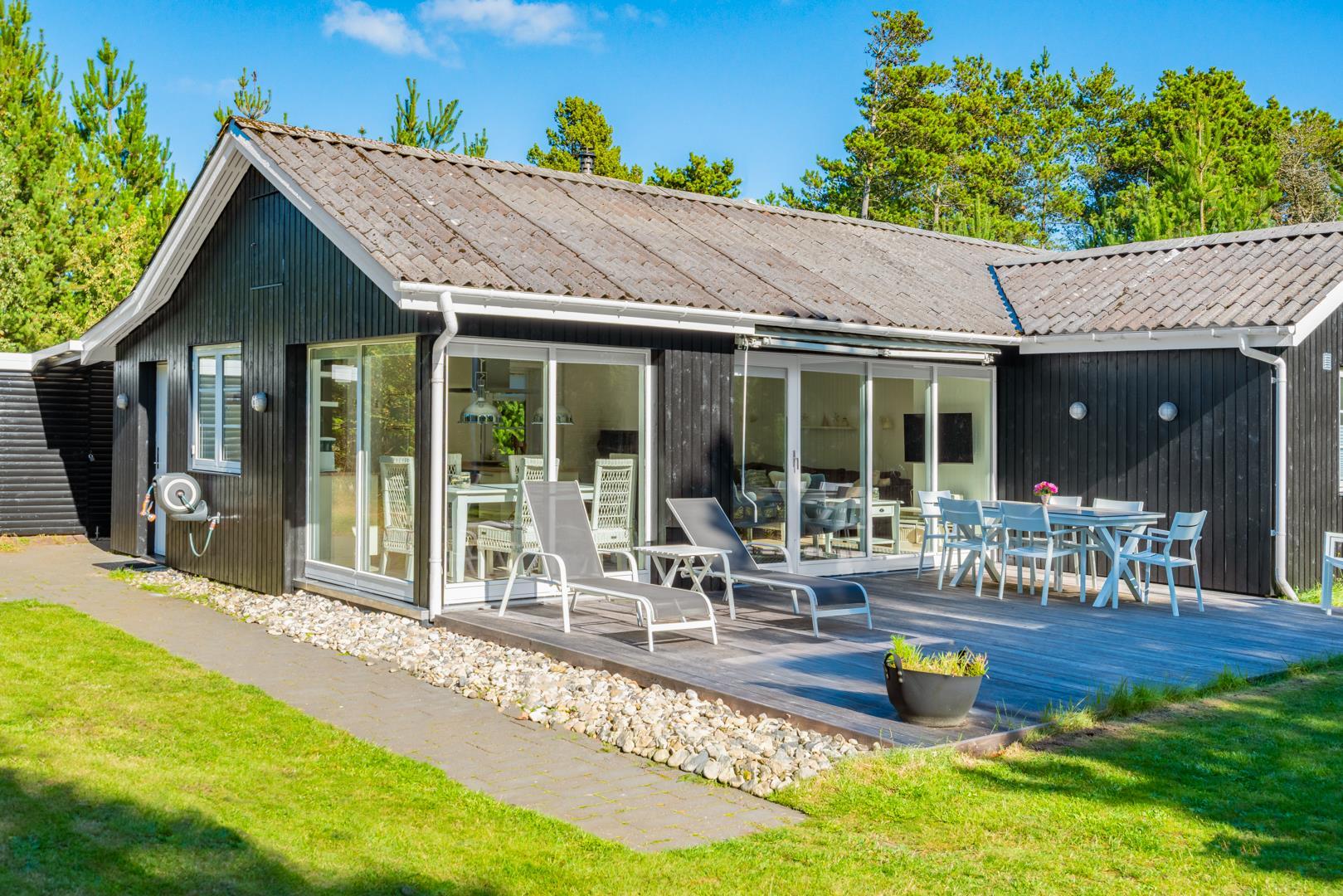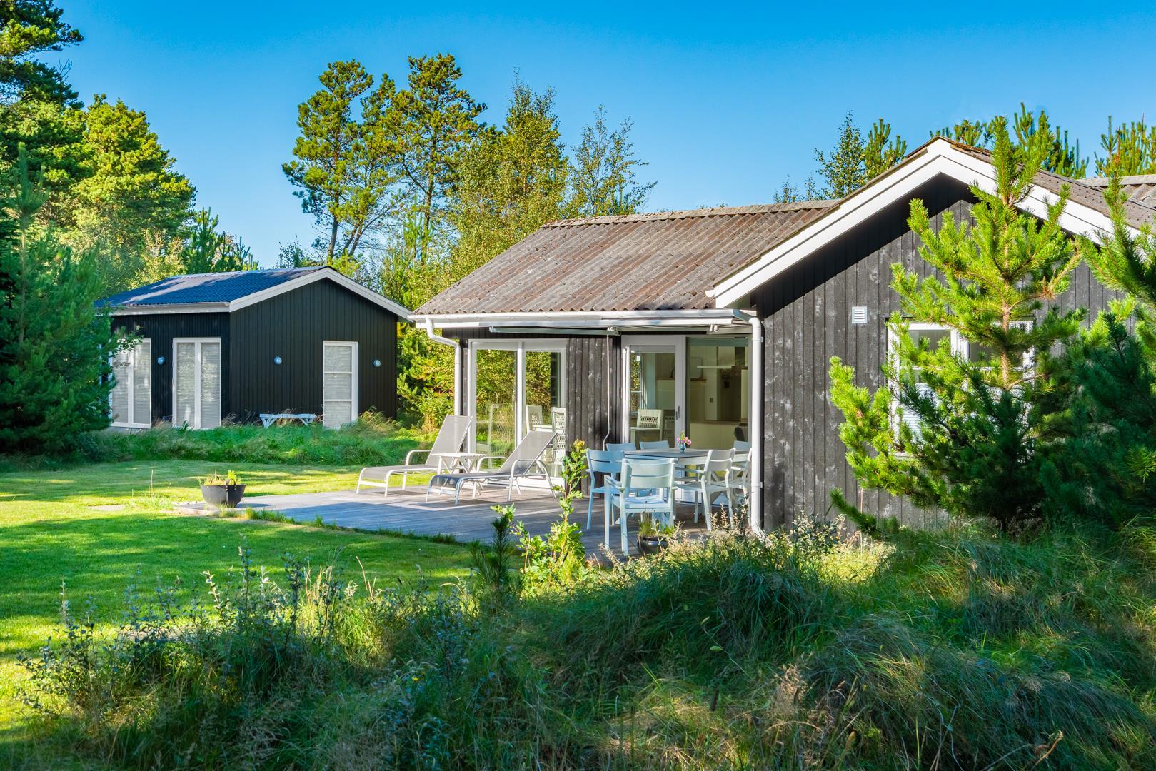 Hyggeligt feriehus i Henne Strand med sauna, stor terrasse og skøn naturgrund nær stranden.