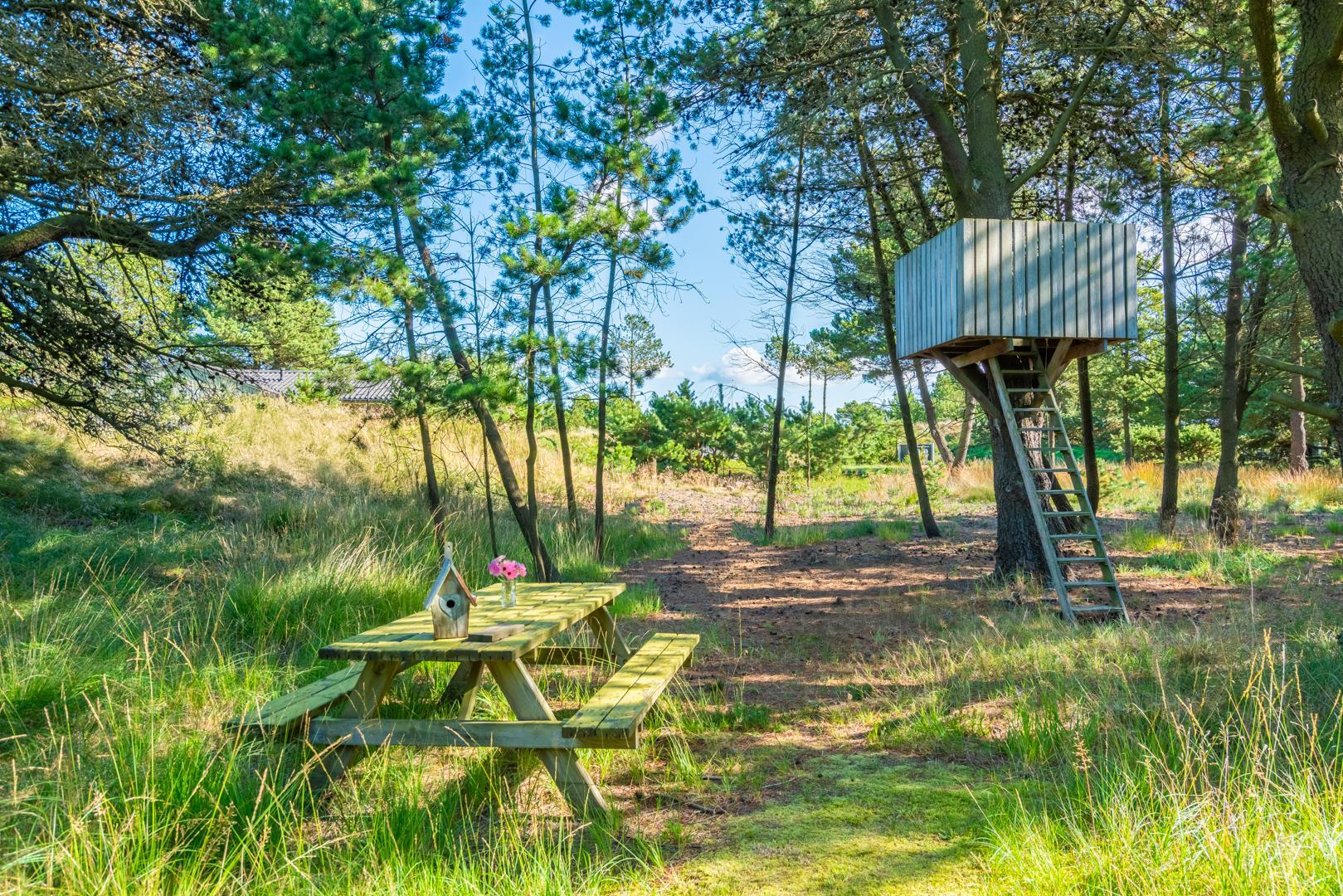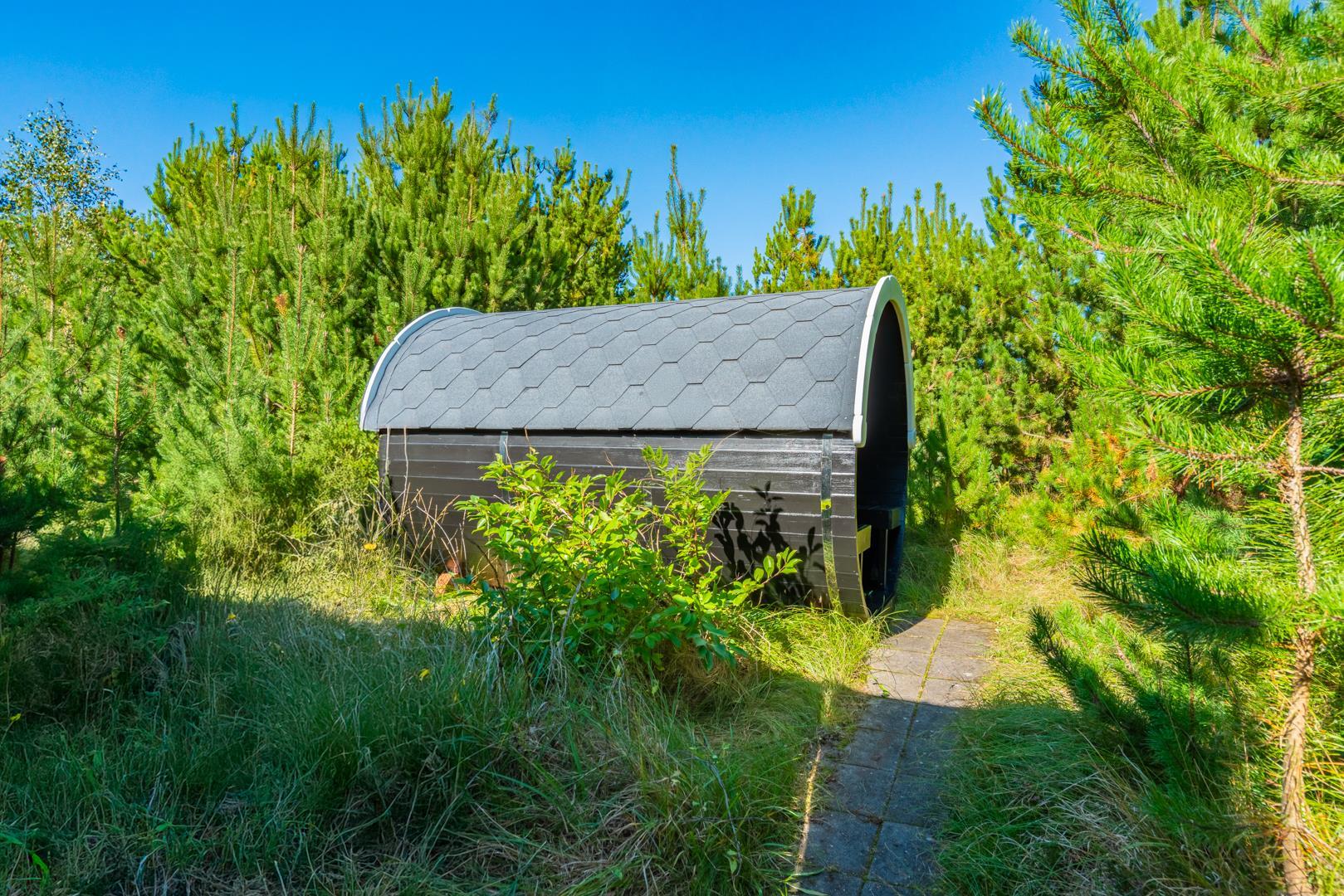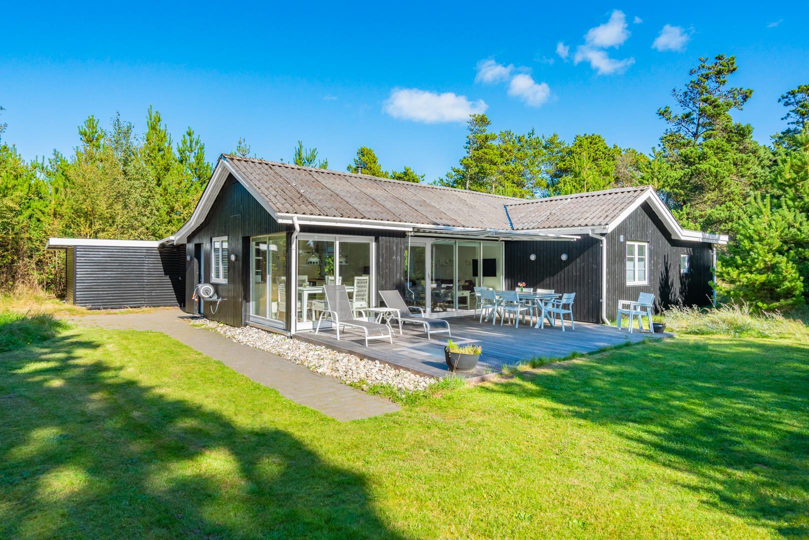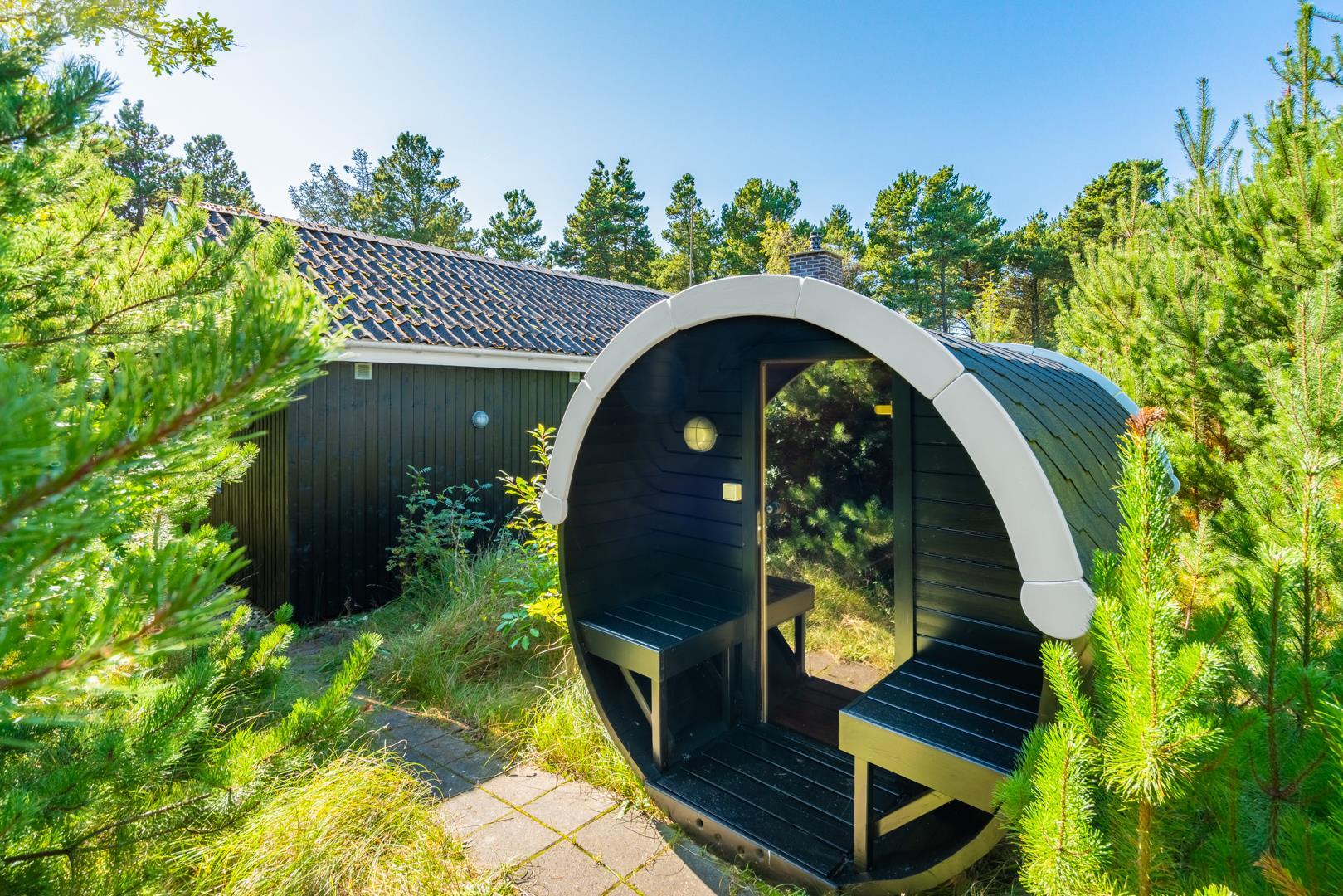 Hyggeligt feriehus i Henne Strand med sauna, stor terrasse og skøn naturgrund nær stranden.