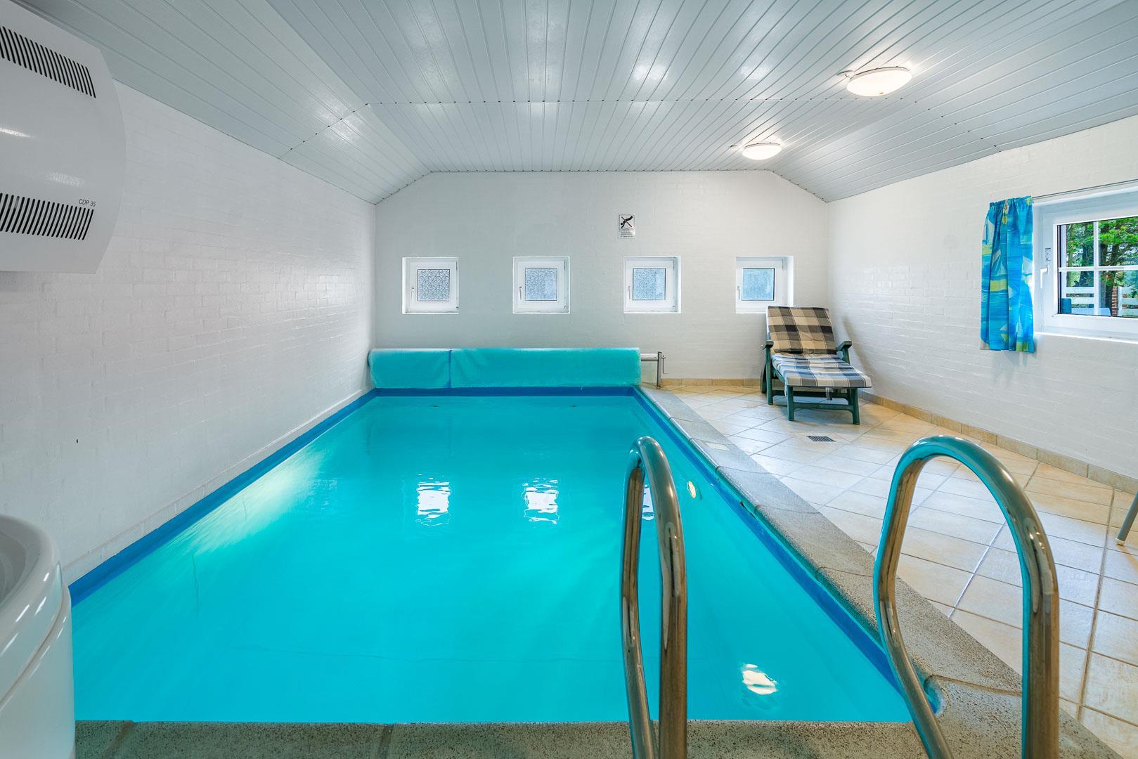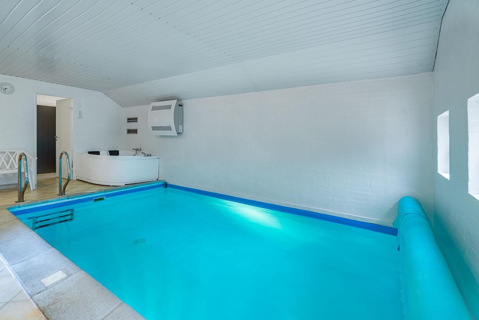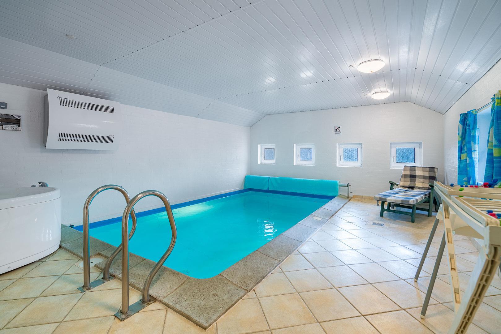 Den lyse poolafdeling med energibesparende varmepumpe til poolen råder over pool (3x5x1,35 m) spa og der er direkte adgang til badeværelse med bruser og sauna.