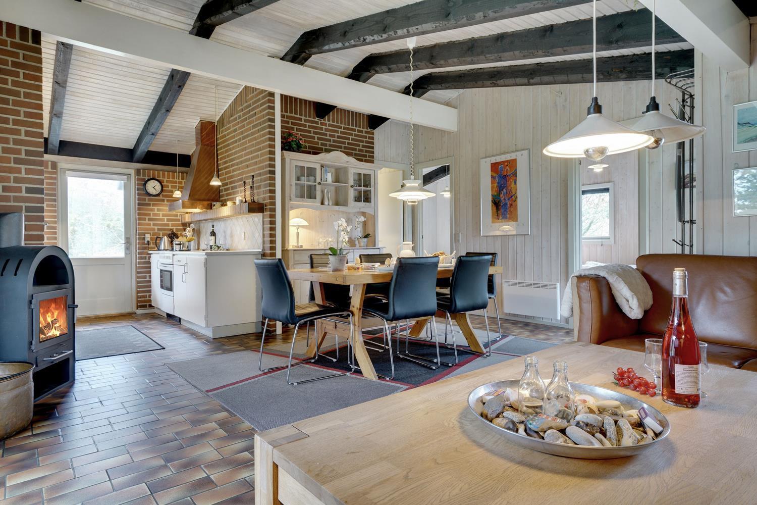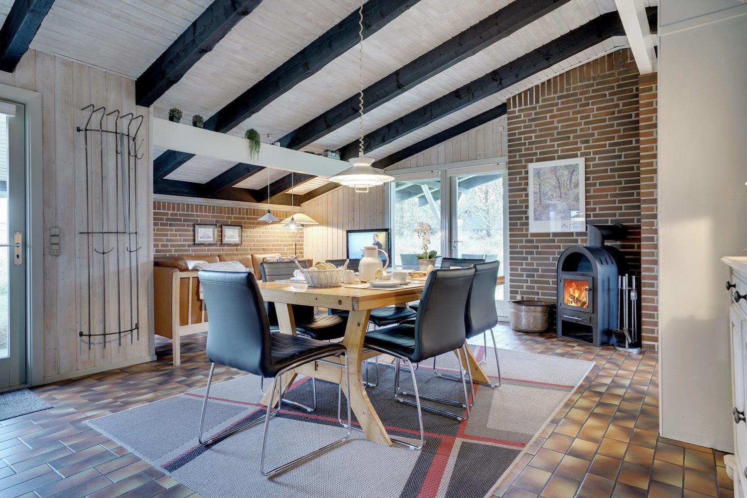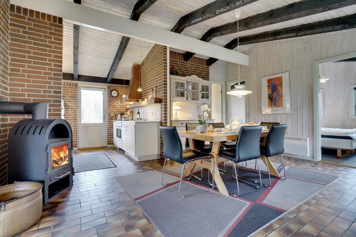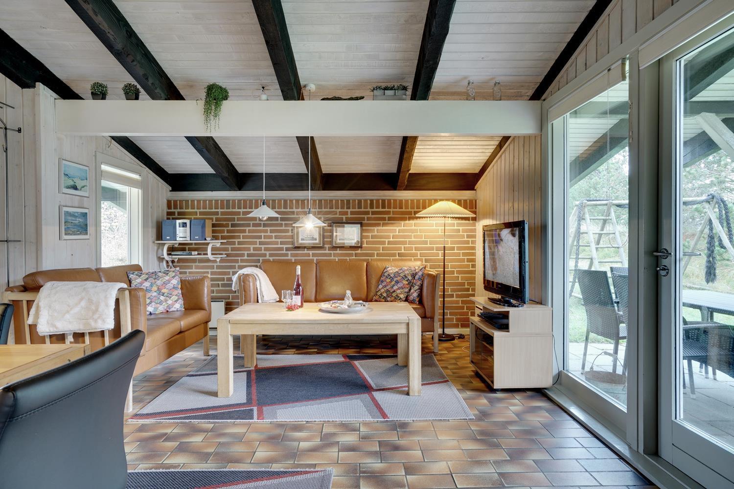 På en dejlig og ugeneret naturgrund med buske ligger dette velholdte feriehus. Husets stue er hyggeligt indrettet med gode lædermøbler. Køkkenet ligger i åben forbindelse med stuen og der er 2 gode soverum. Stue med brændeovn og udgang til overdækket terrasse, hvor den dejlige natur kan nydes. Der er også morgen og aften terrasse.