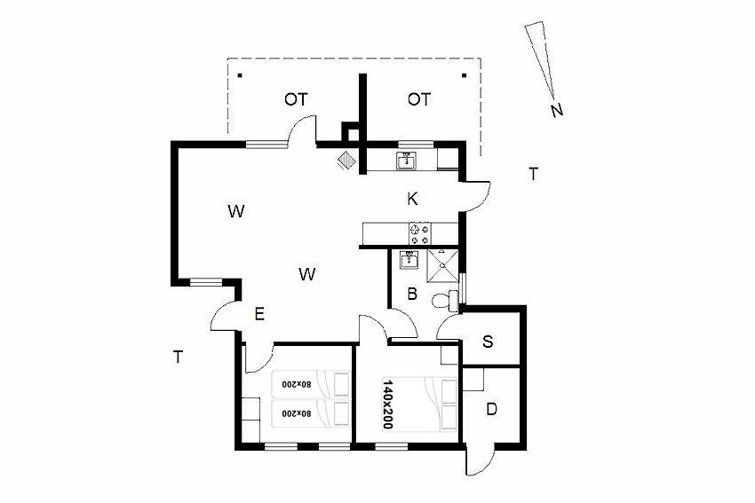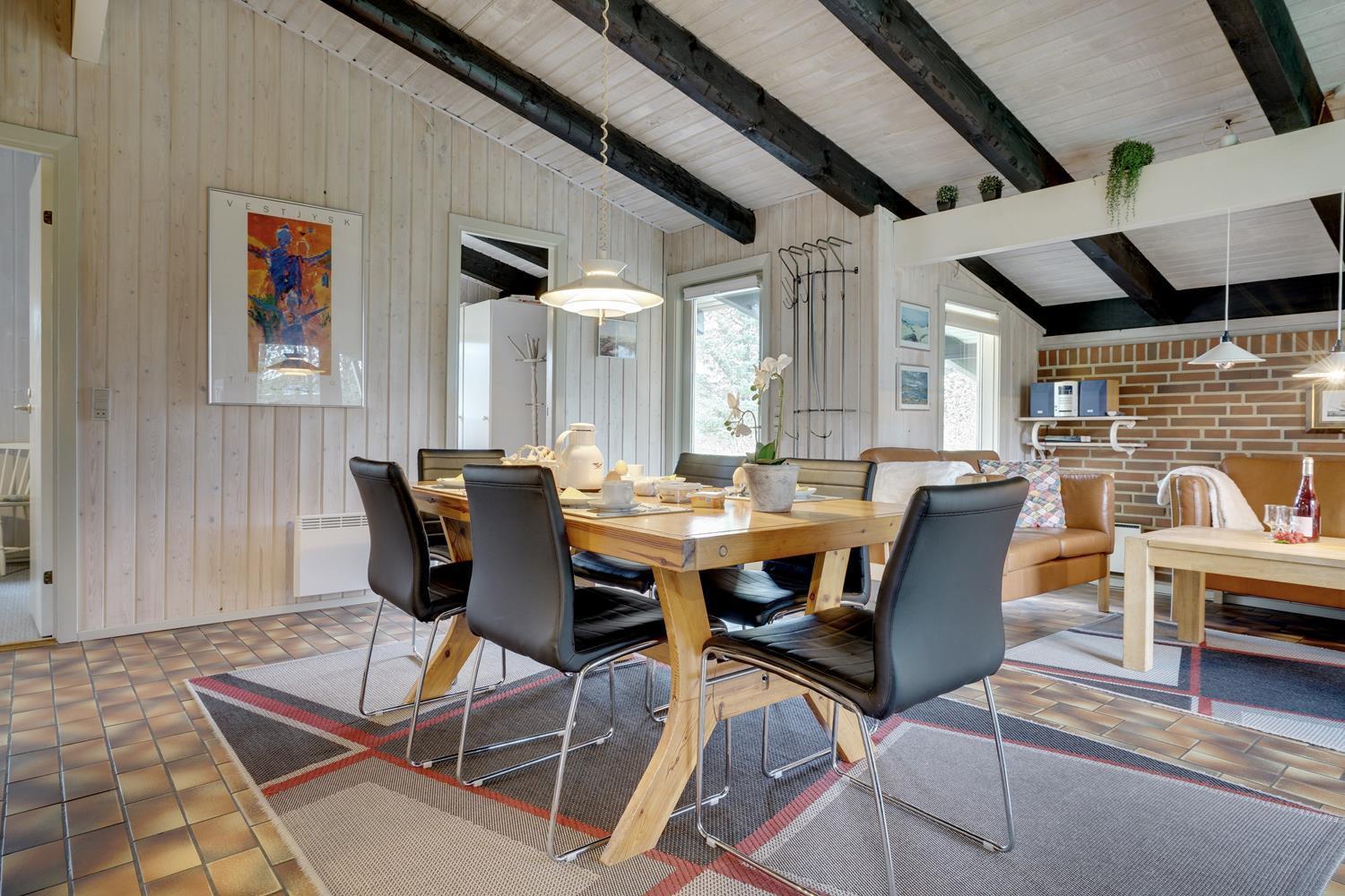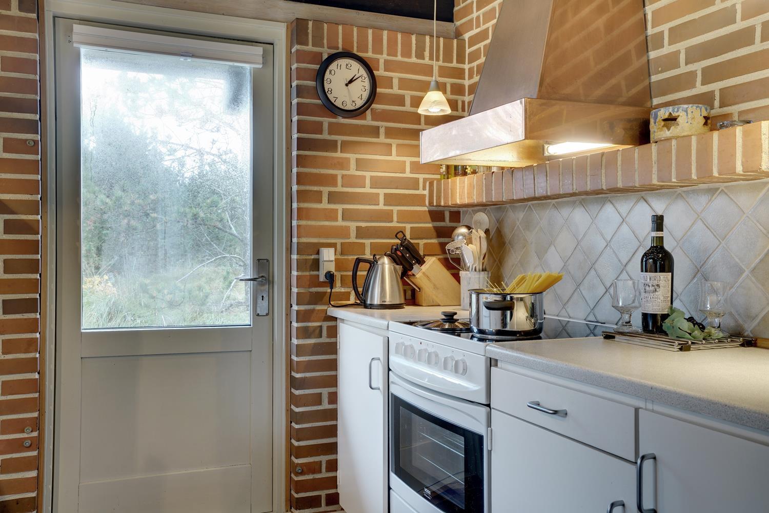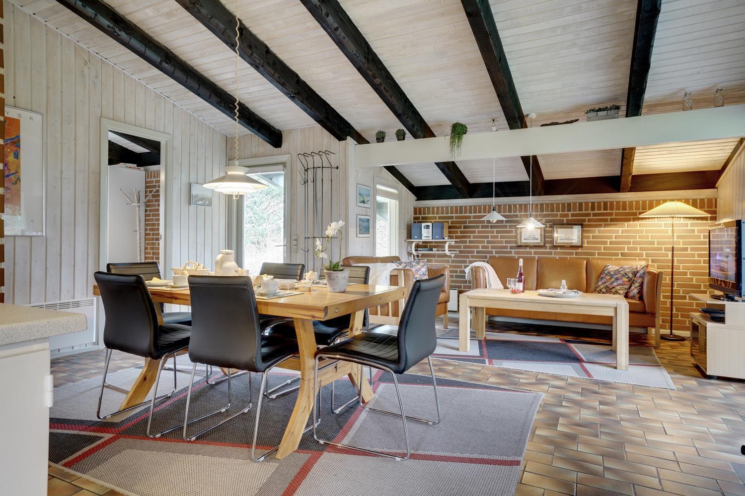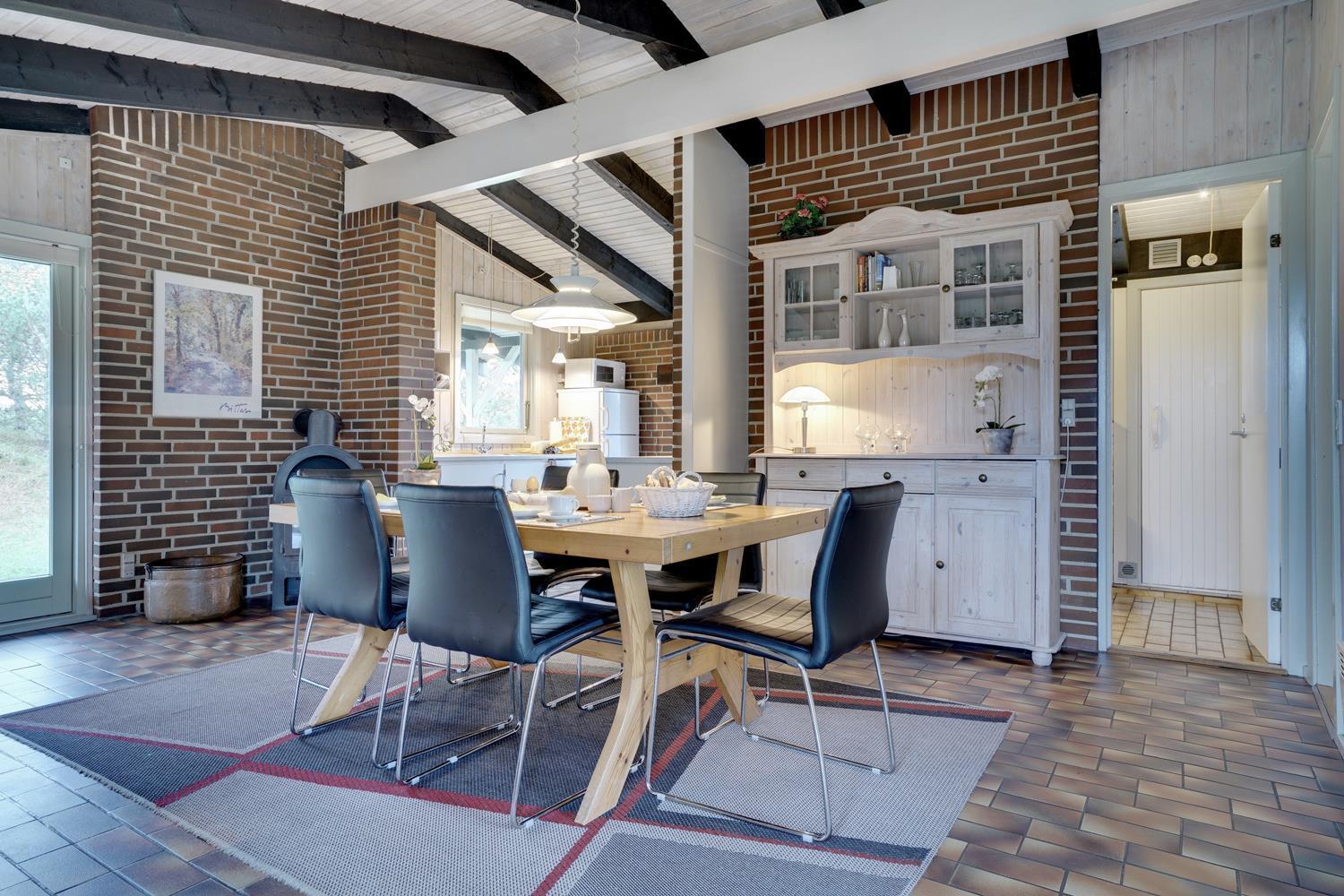 På en dejlig og ugeneret naturgrund med buske ligger dette velholdte feriehus. Husets stue er hyggeligt indrettet med gode lædermøbler. Køkkenet ligger i åben forbindelse med stuen og der er 2 gode soverum. Stue med brændeovn og udgang til overdækket terrasse, hvor den dejlige natur kan nydes. Der er også morgen og aften terrasse.