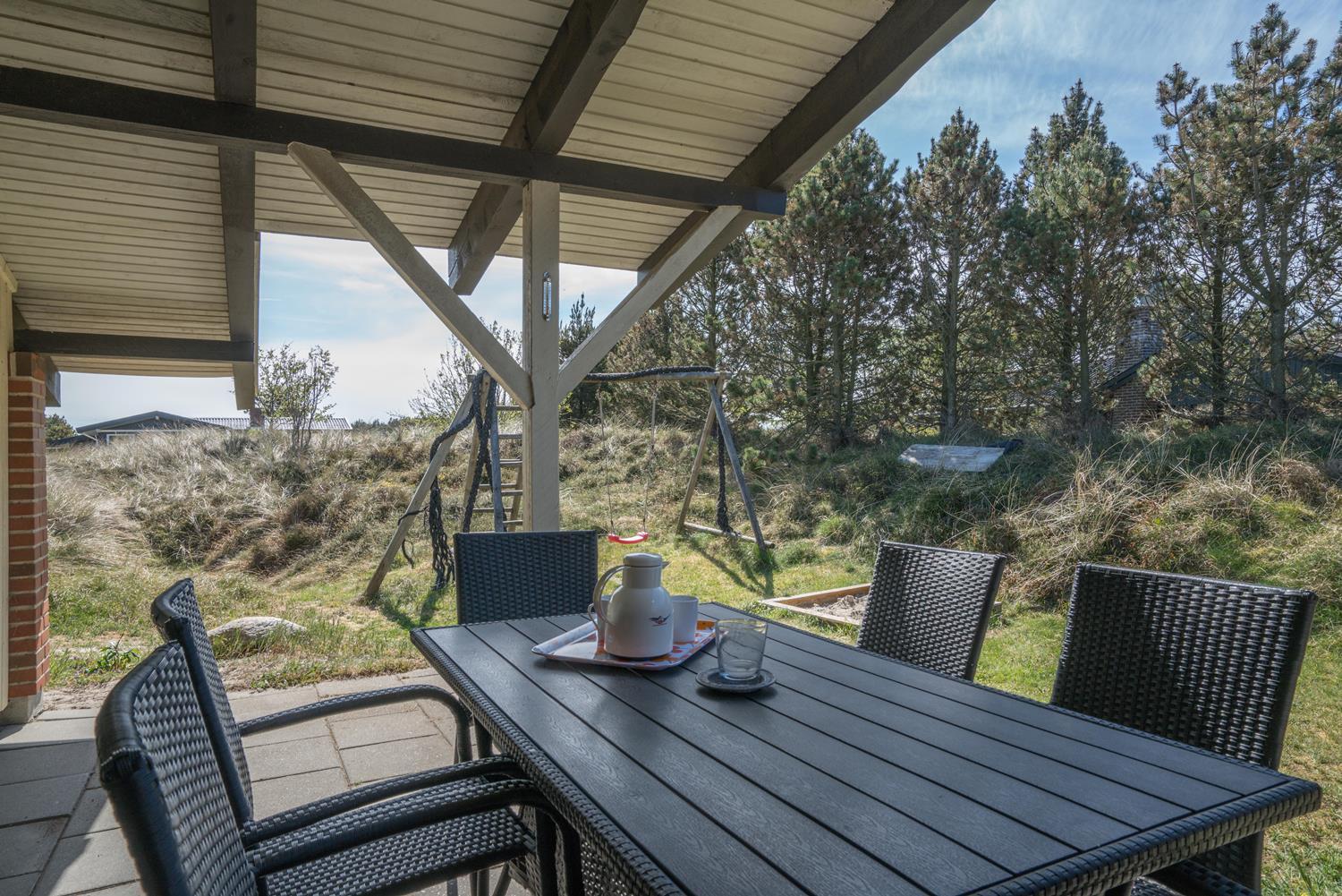 Hyggeligt og velholdt feriehus på ugeneret naturgrund nær Henne Strand med brændeovn og overdækket terrasse.