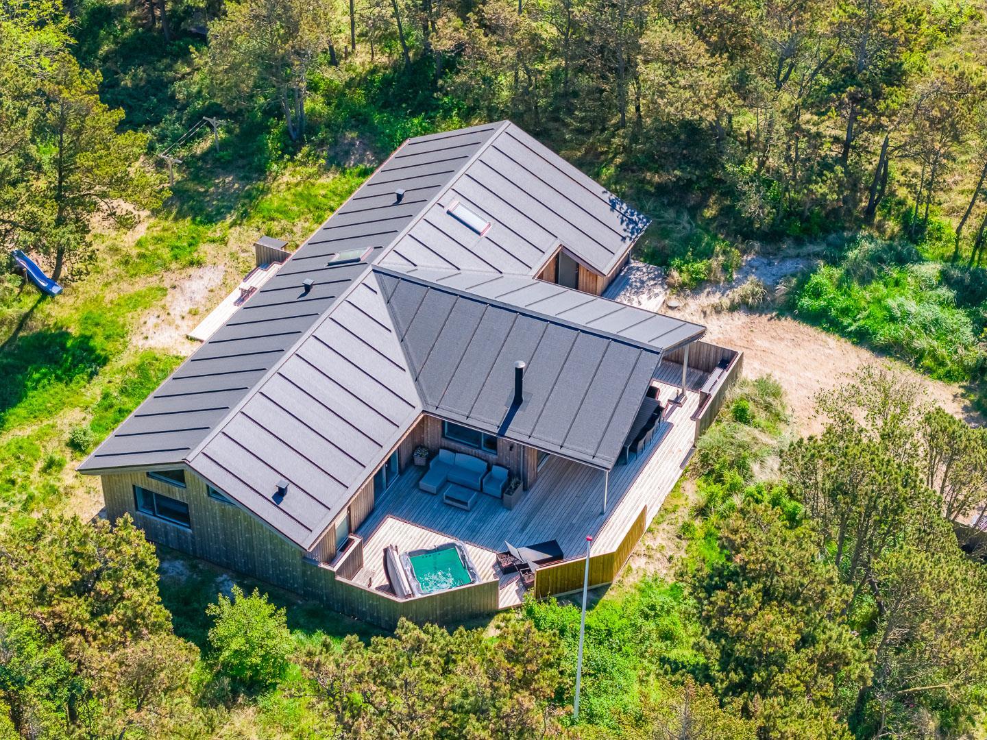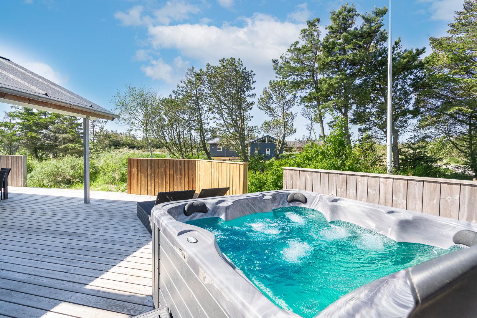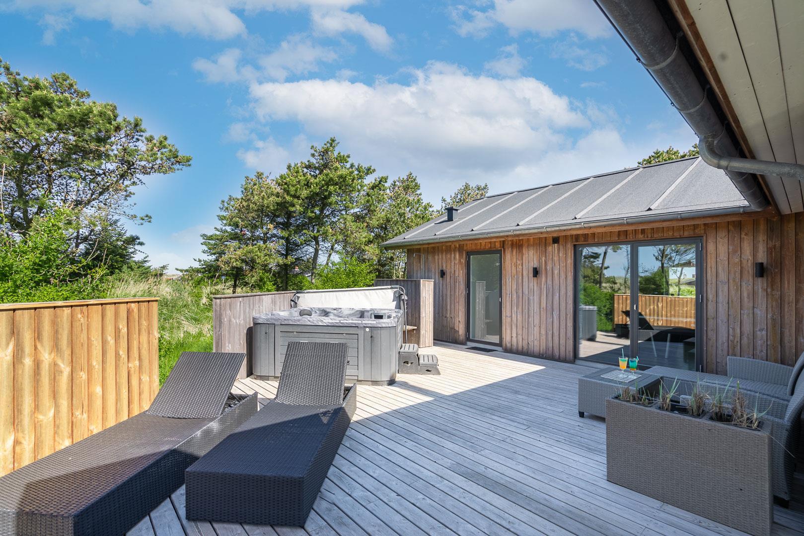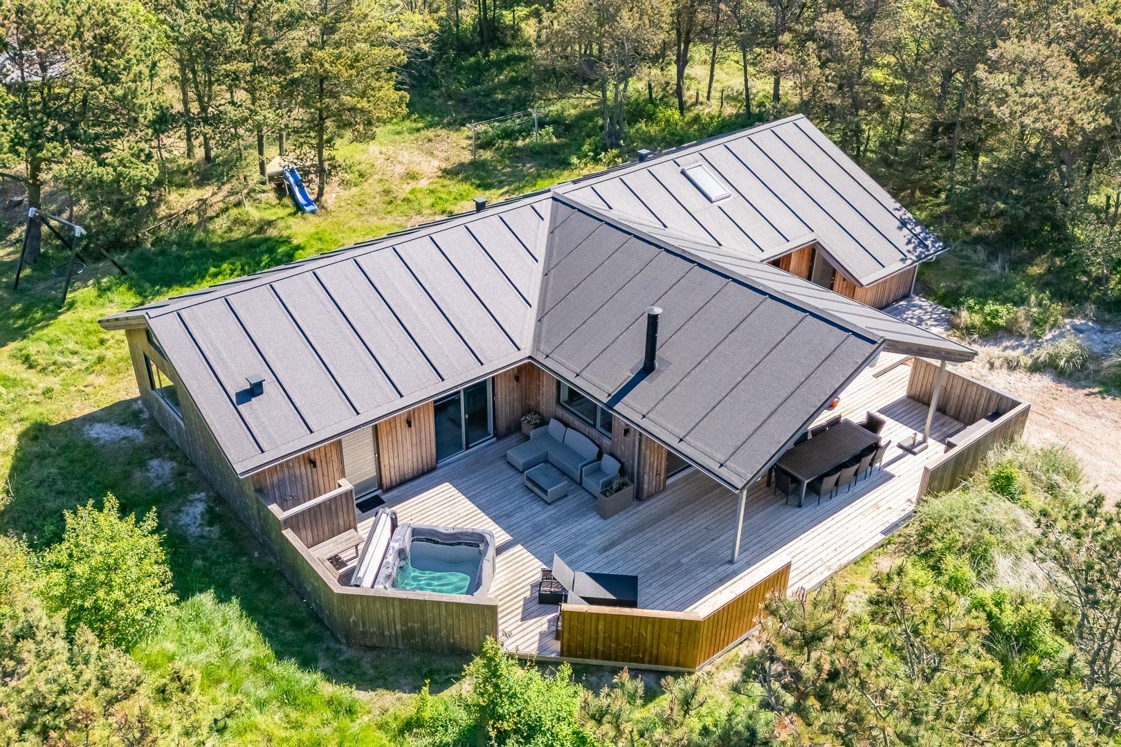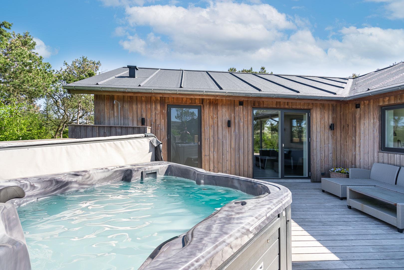 Dette aktivitetshus med udespa har alt hvad man skal bruge for at for at få en fantastisk ferie. Huset er nyopført og rummer aktiviteter og faciliteter, som hele familien vil se tilbage på med glæde. Agerhønevej 12 - Henne Strand byder på et stort, lyst og kombineret køkkenalrum og stue. Her kan hele familien hygge sig og nyde hinandens selskab, hvad enten det er over en hygge middag eller et spil. I dette pragtfulde aktivitetshus er der også tænkt på husets små gæster, så her er både rutchebane, gynge og trampolin.