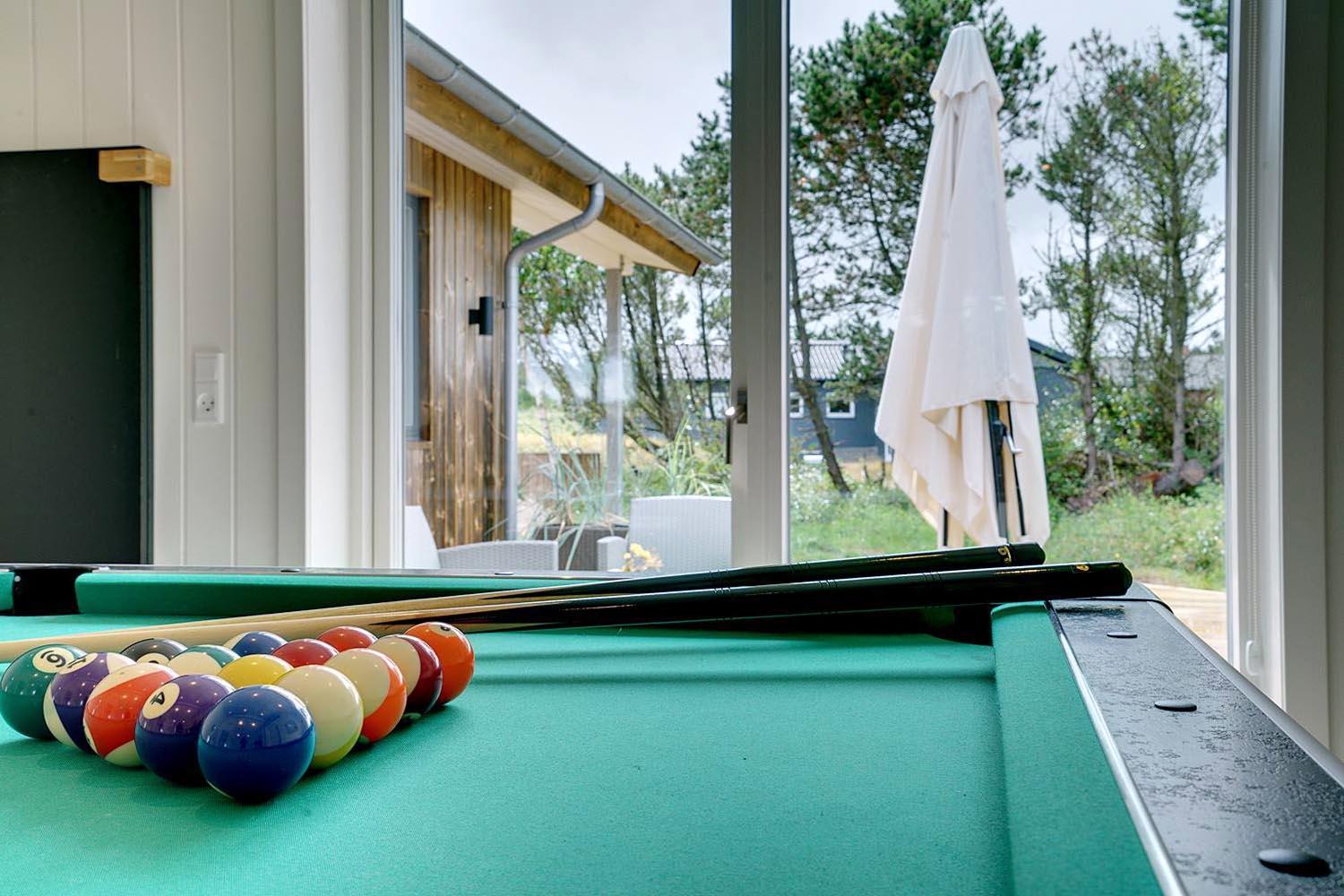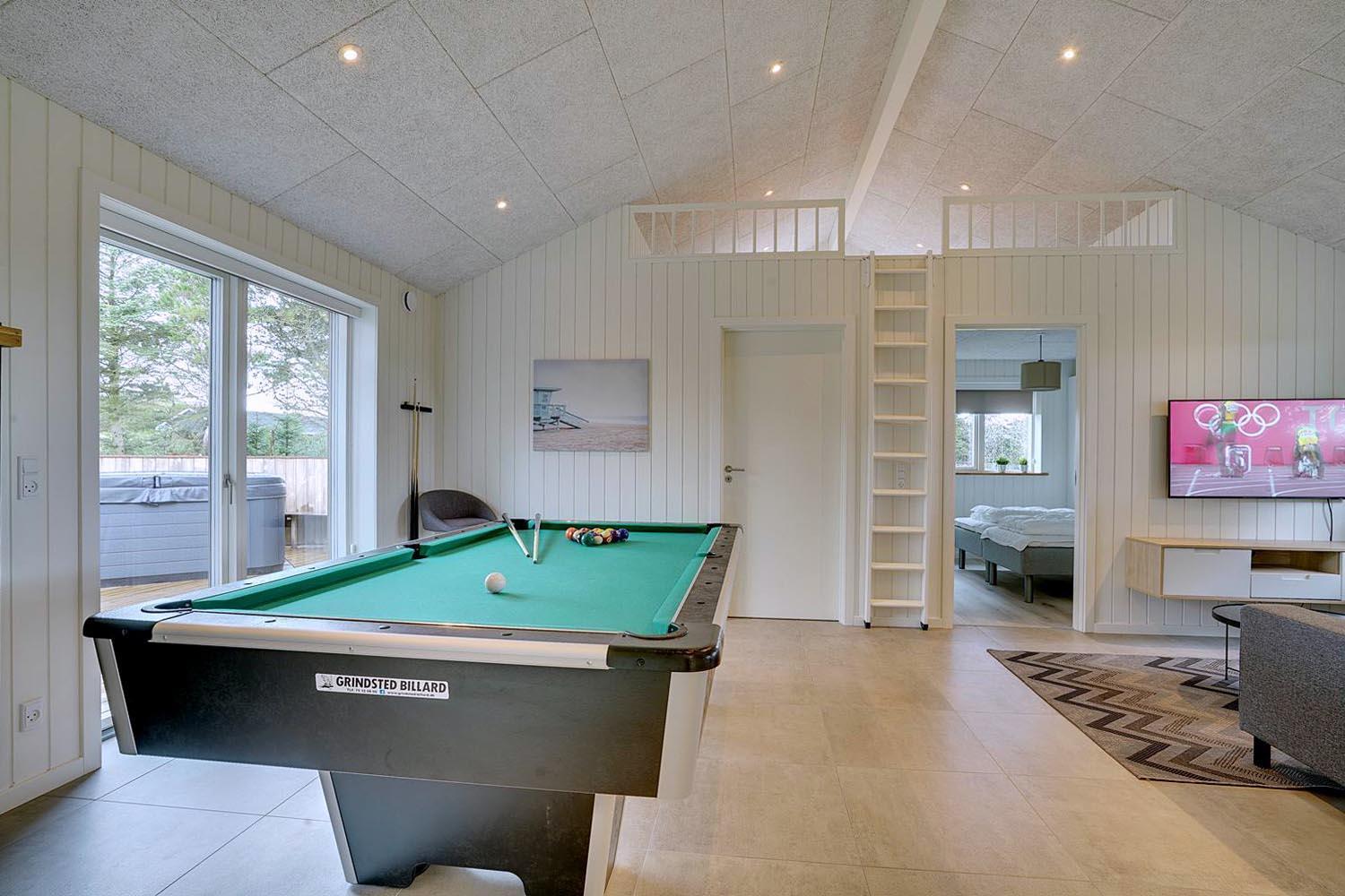 Køkkenet er yderst veludstyret og tilbyder god køle og fryseplads. Husets råder over aktivitetsrum, hvor et pool bord og bordtennis. står klar til dyst. Fra husets store stue er der direkte udgang til stor delvis overdækket træterrasse. Sommerhuset har i alt 8 gode sovepladser fordelt på 4 rummelige værelser, samt hems med 2 sovepladser. Derudover har sommerhuset 2 badeværelser med bruser, håndvask, wc, i det ene findes huset sauna. Energibesparende varmepumpe og brændeovn i køkkenalrummet giver ekstra sommerhus stemning.