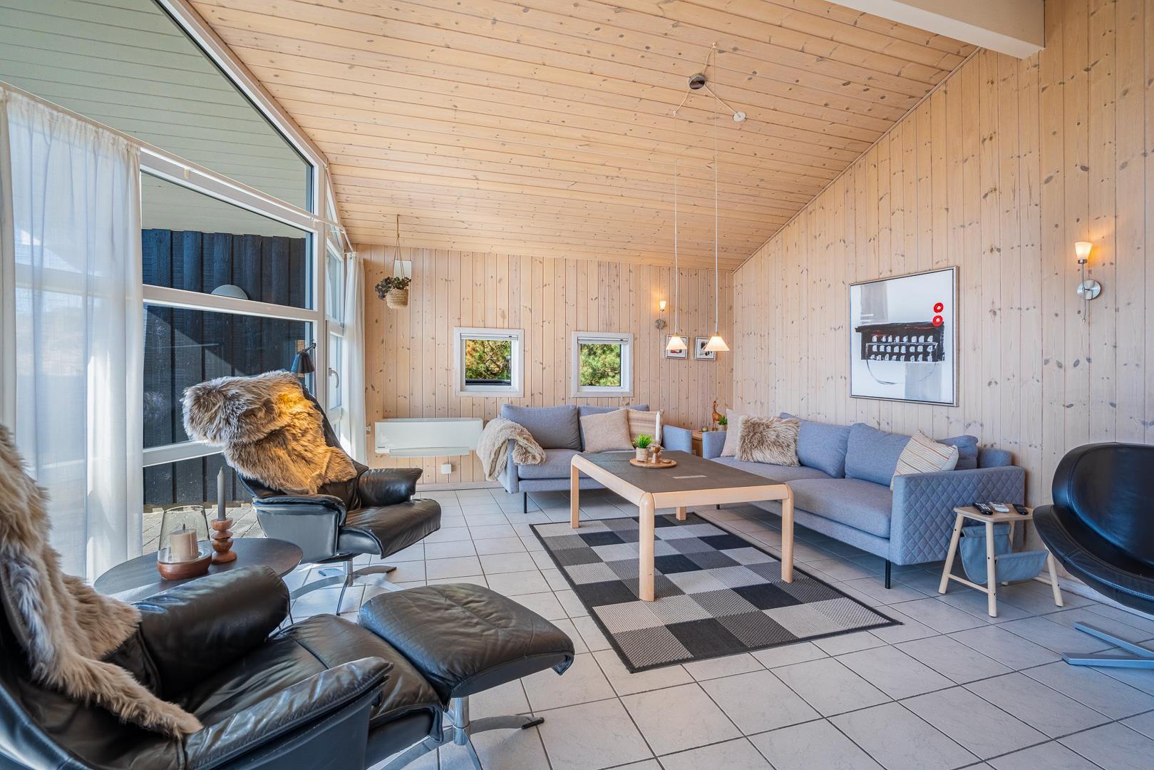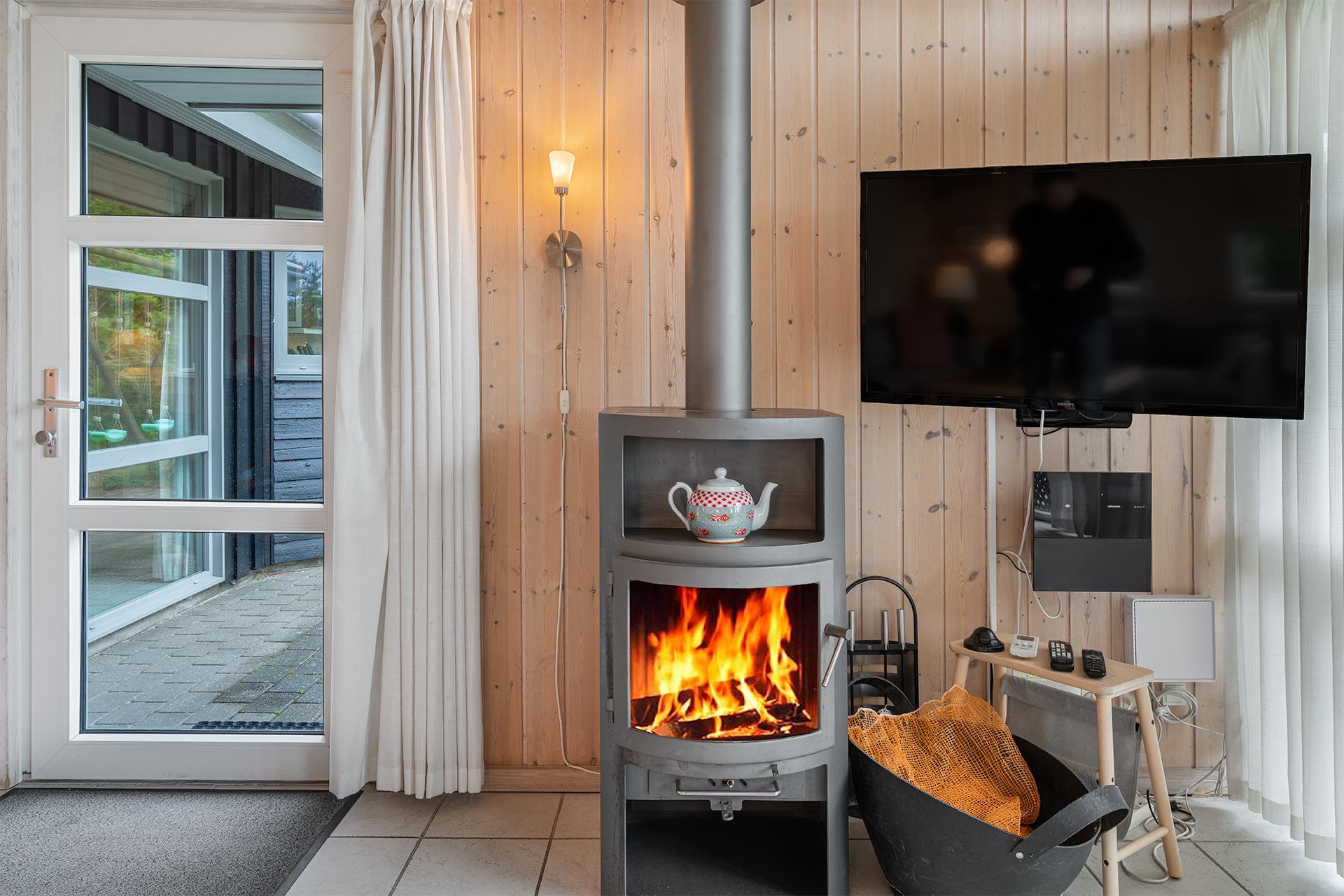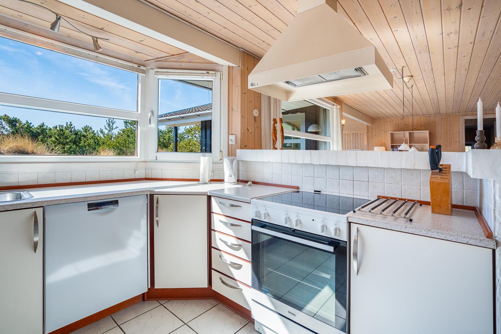 Feriehuset er lyst og velindrettet, og byder dig velkommen med åbne arme, med lyse farver og skønne møbler der skaber en følelse af harmoni og ro. Køkkenet, der smelter sammen med stuen, inviterer til hyggelige stunder og fælles måltider. I stuen finder du desuden brændeovnen der sørger for at skrue ekstra op for hyggen. Herfra er der udgang til de skønne terrasser, hvor der er gode muligheder for at finde læ og nyde naturens skønhed året rundt. Ved terrassen finder du et gyngestativ og en sandkasse – god underholdning til de mindste feriegæster.