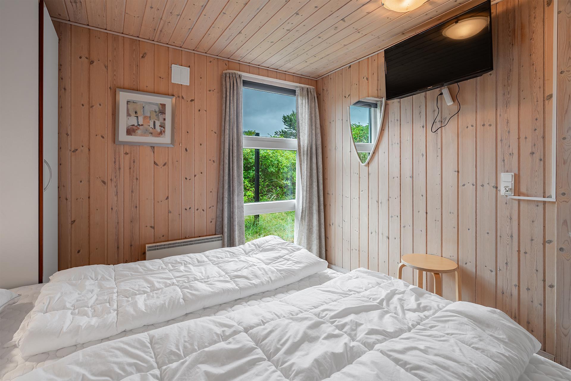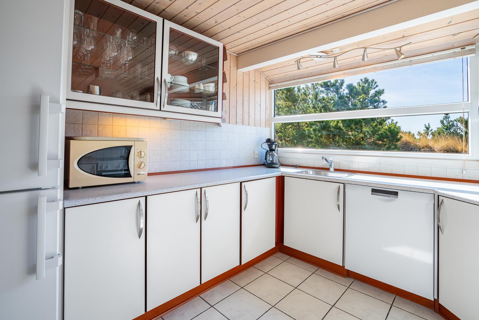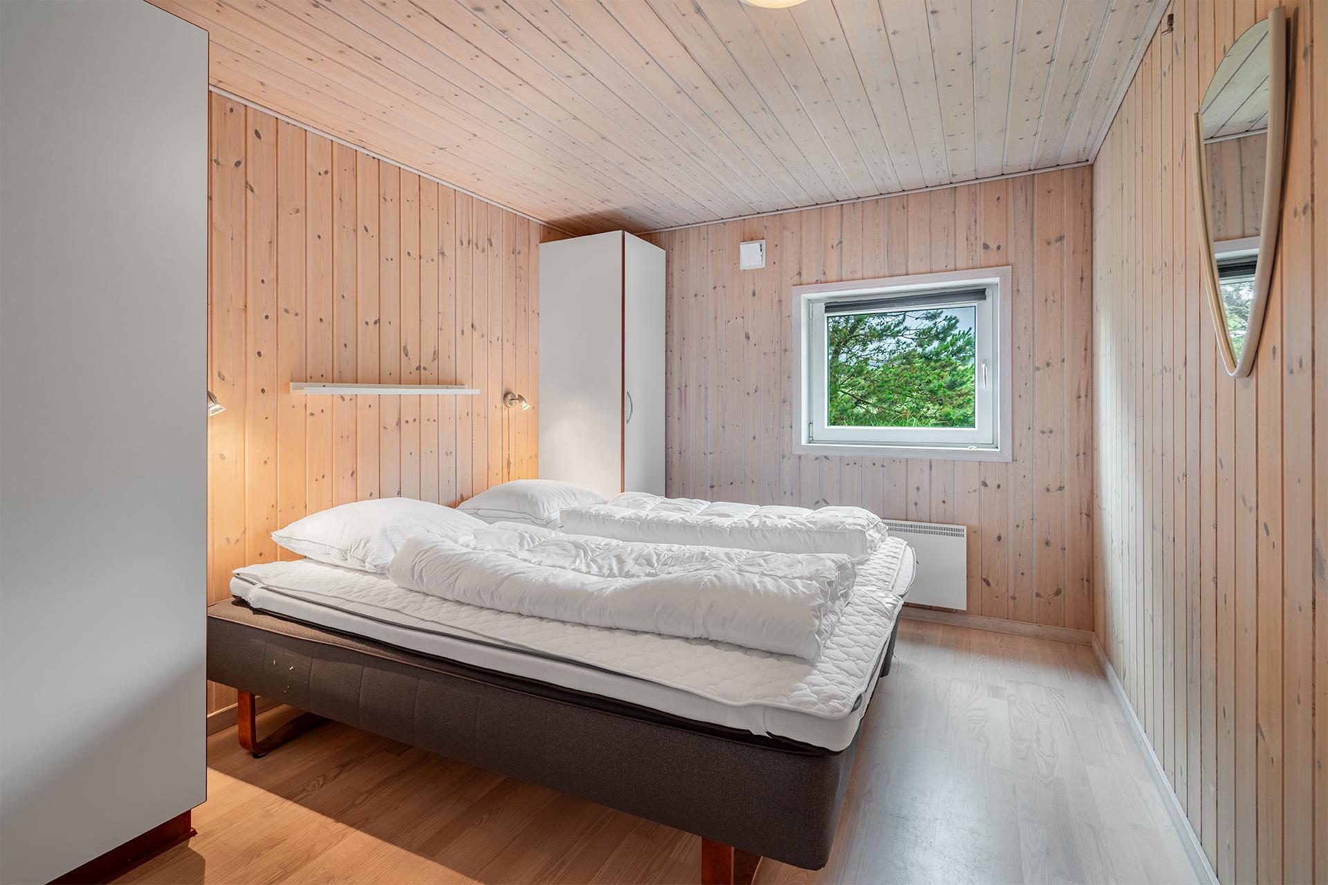 Feriehuset er lyst og velindrettet, og byder dig velkommen med åbne arme, med lyse farver og skønne møbler der skaber en følelse af harmoni og ro. Køkkenet, der smelter sammen med stuen, inviterer til hyggelige stunder og fælles måltider. I stuen finder du desuden brændeovnen der sørger for at skrue ekstra op for hyggen. Herfra er der udgang til de skønne terrasser, hvor der er gode muligheder for at finde læ og nyde naturens skønhed året rundt. Ved terrassen finder du et gyngestativ og en sandkasse – god underholdning til de mindste feriegæster.