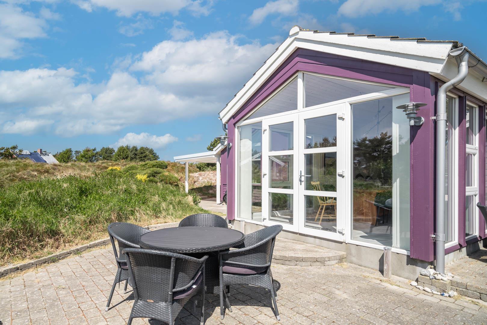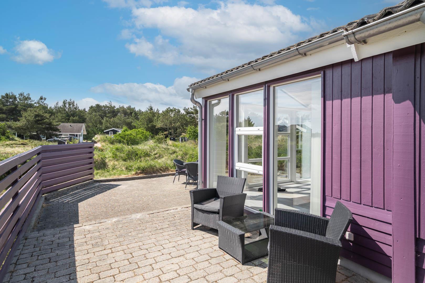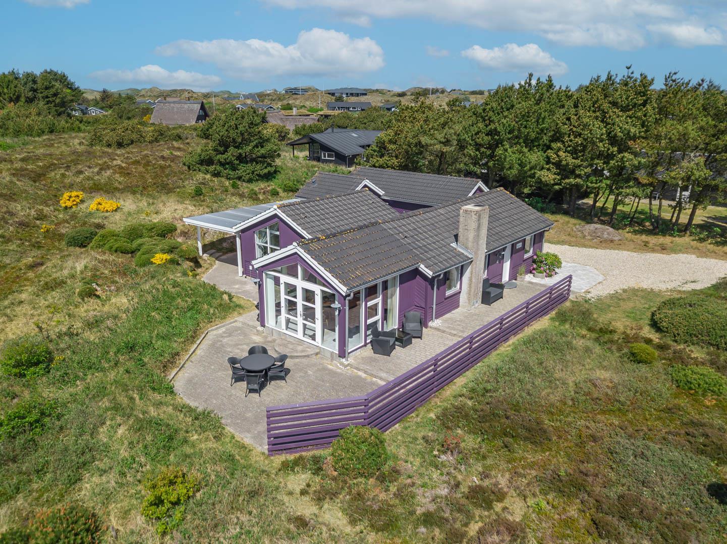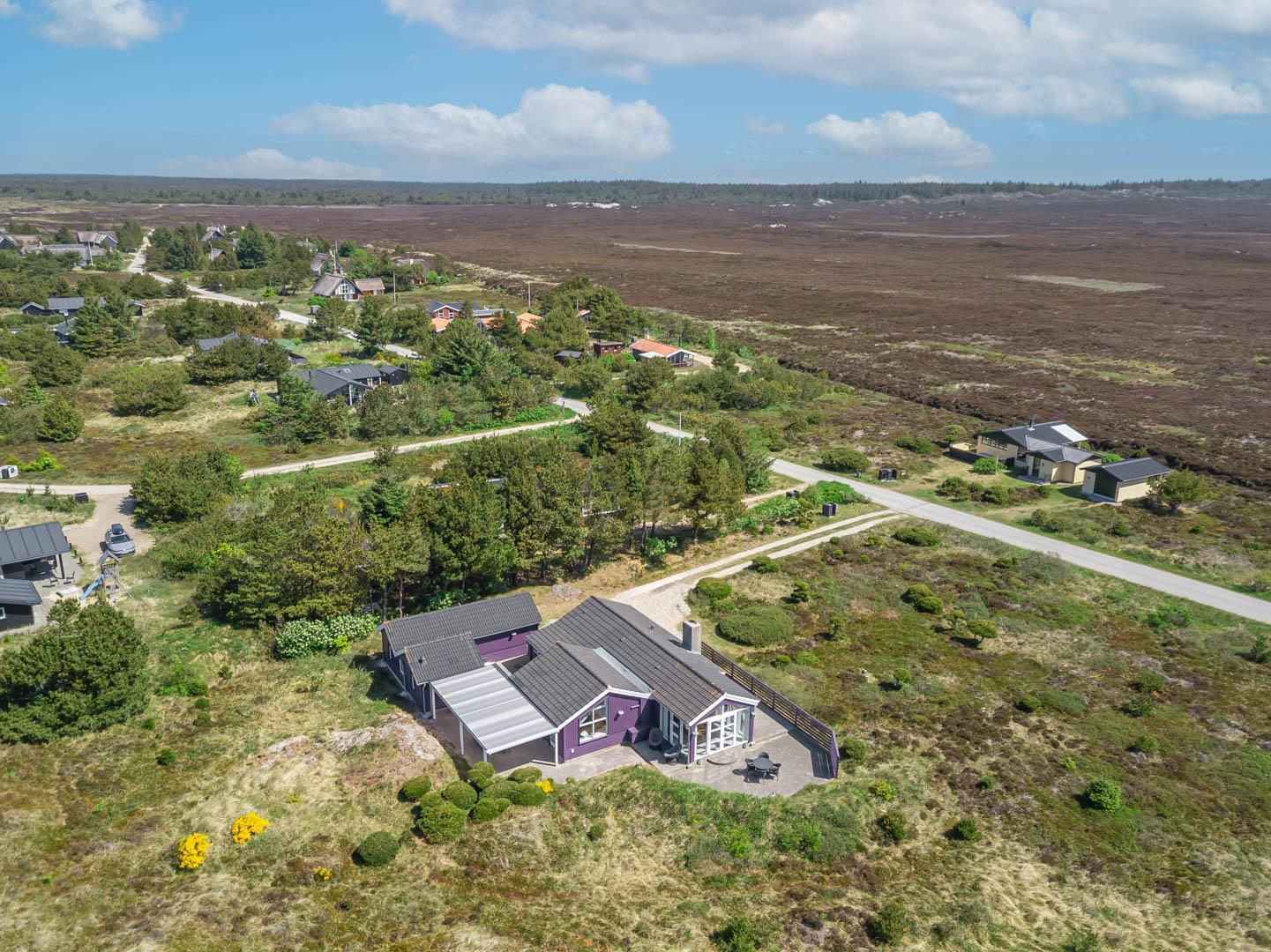 Smagfuldt feriehus ved Henne Strand med panoramaudsigt over lyng og flere ugenerede terrasser.