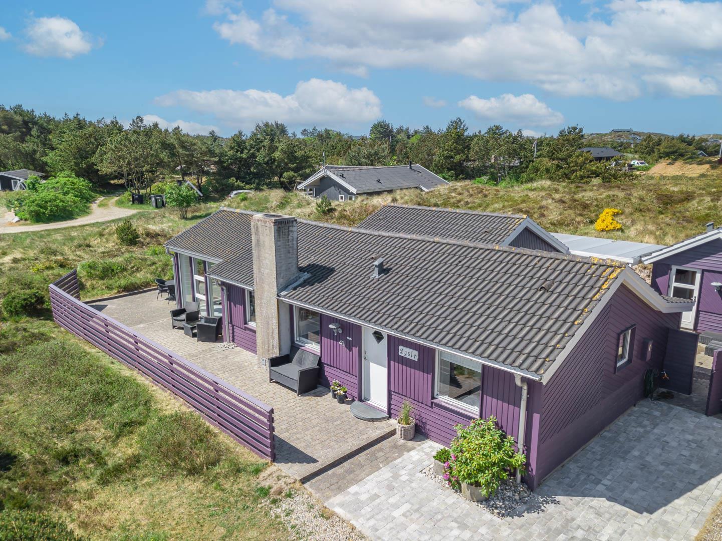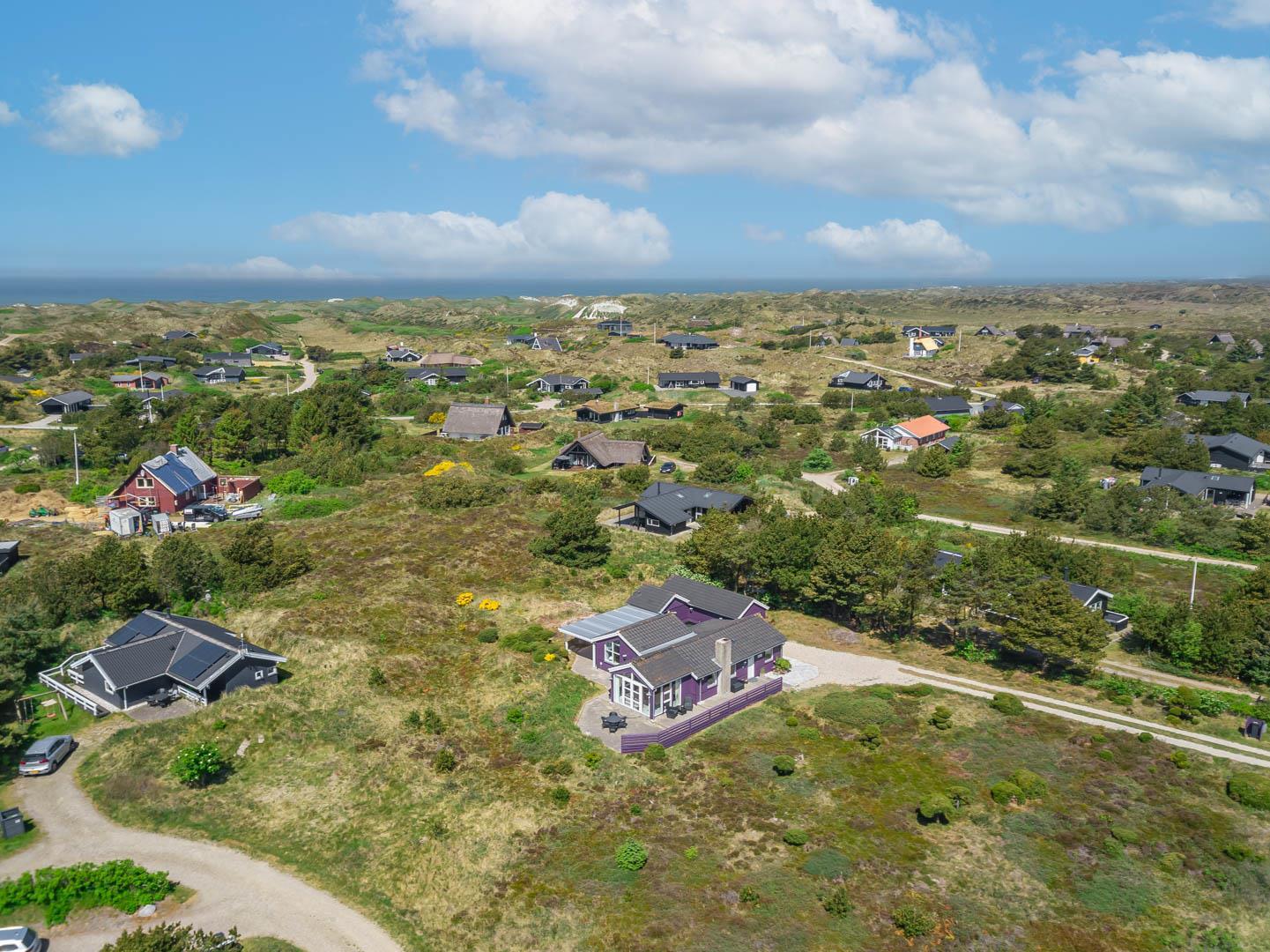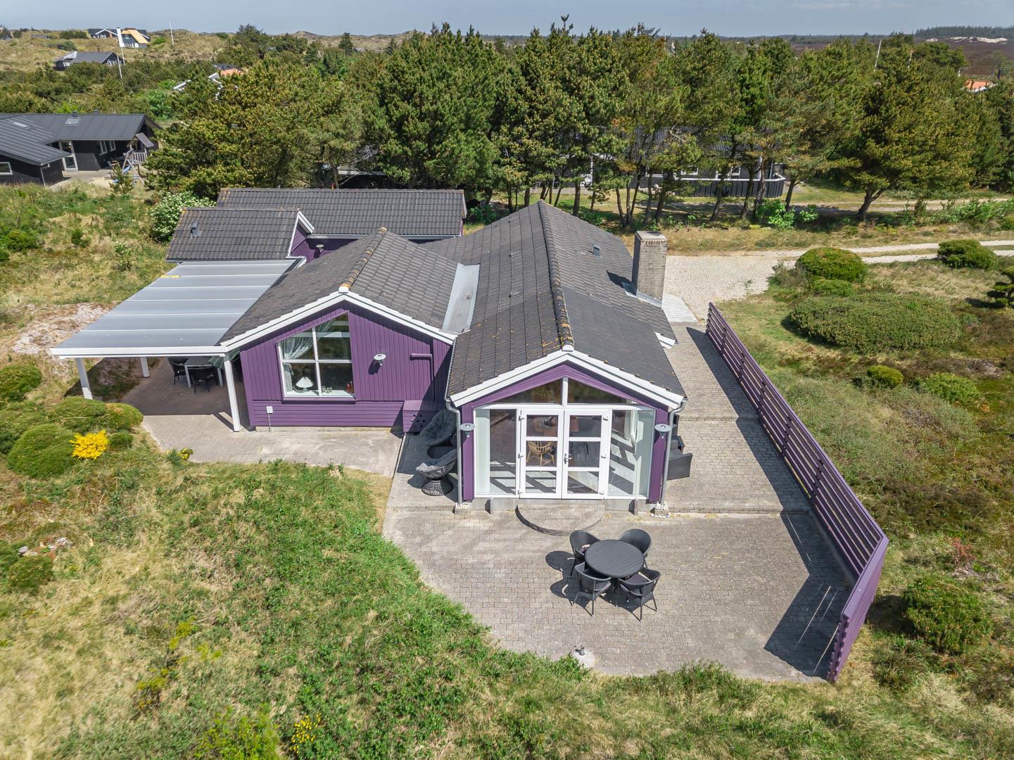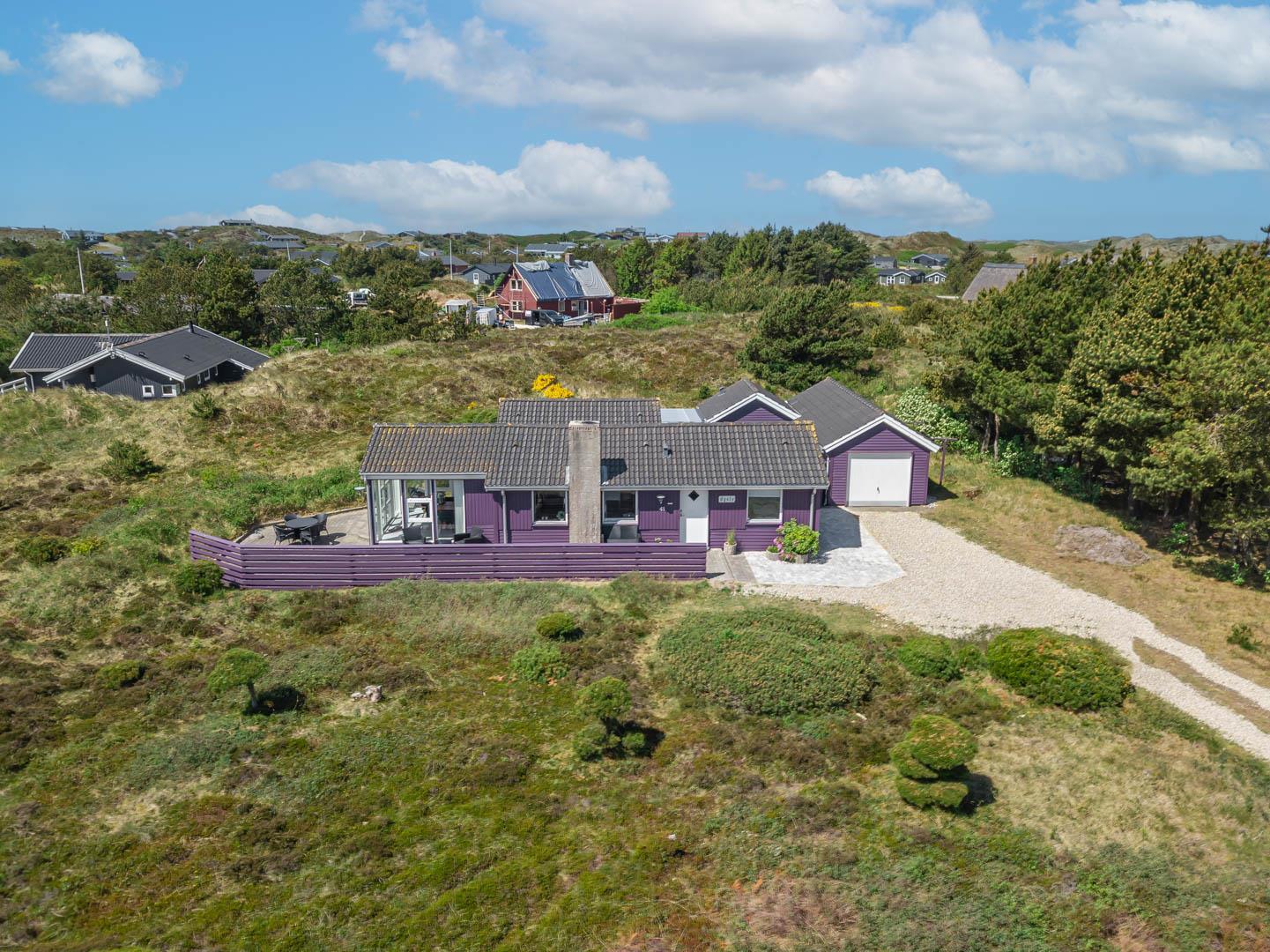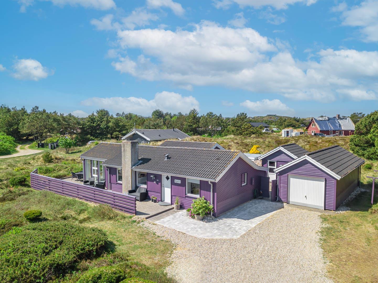 Smagfuldt feriehus ved Henne Strand med panoramaudsigt over lyng og flere ugenerede terrasser.